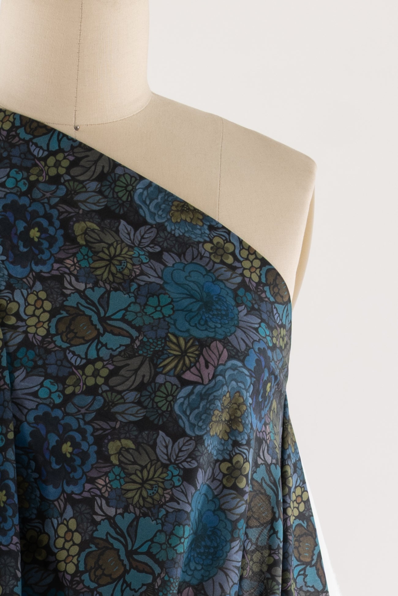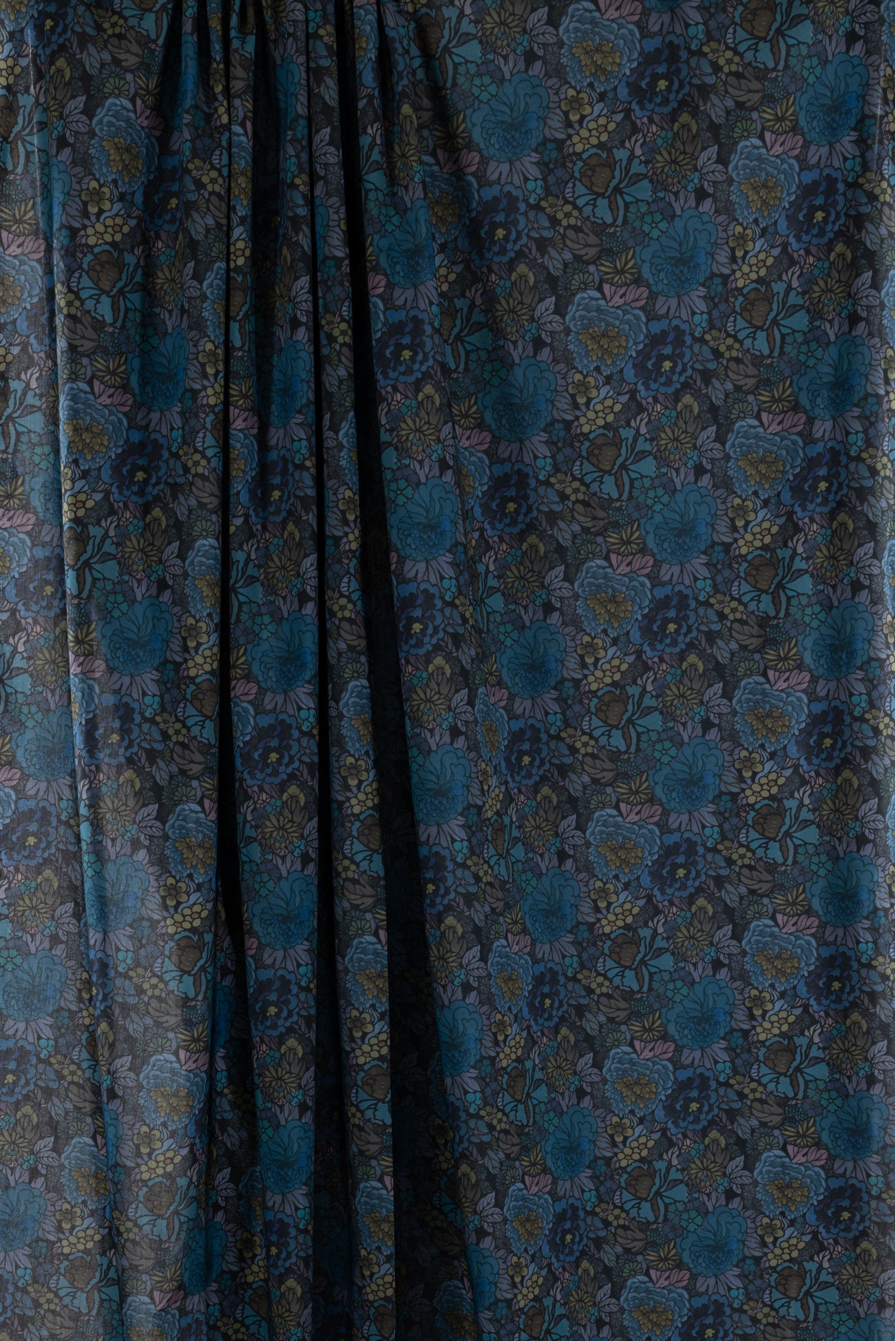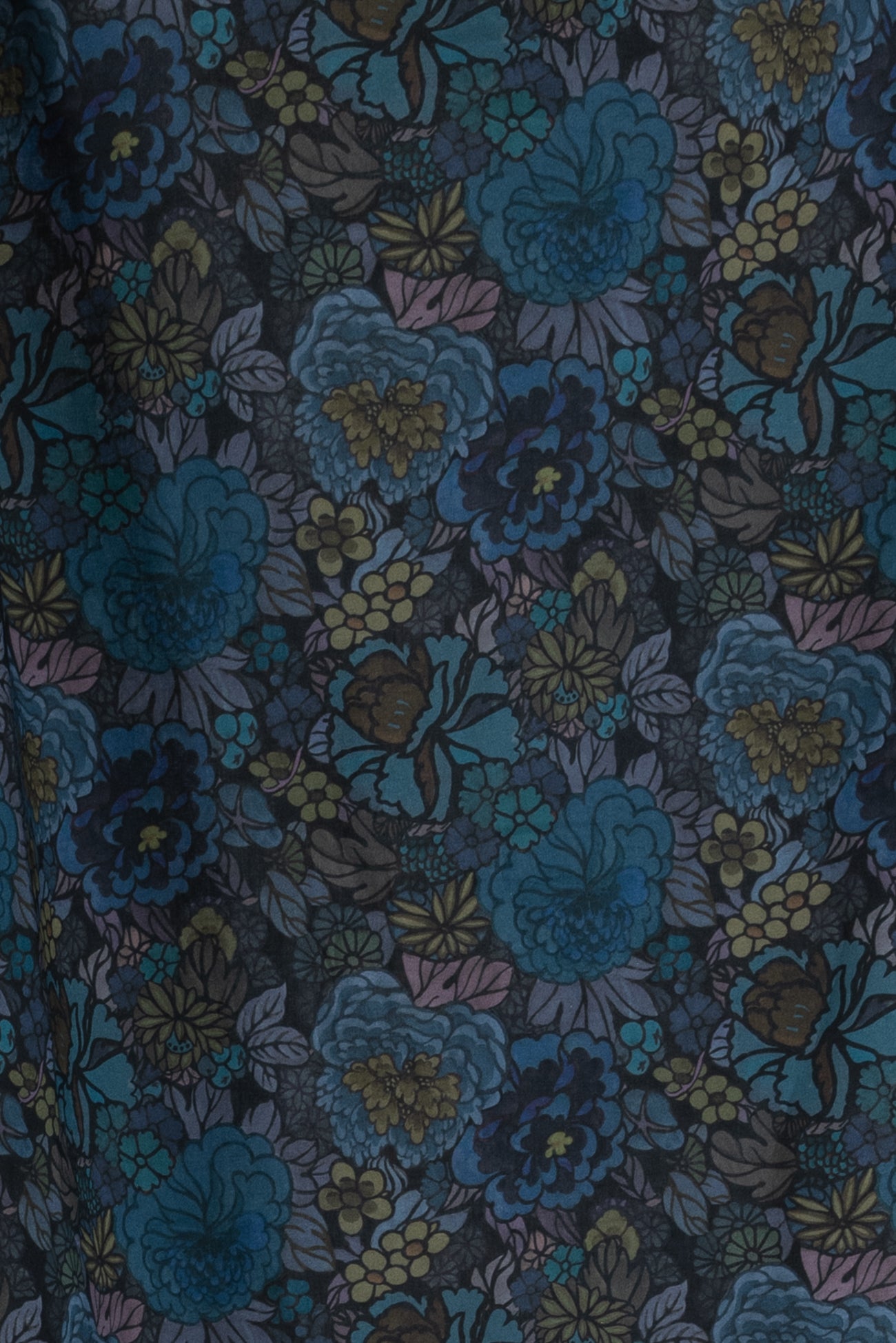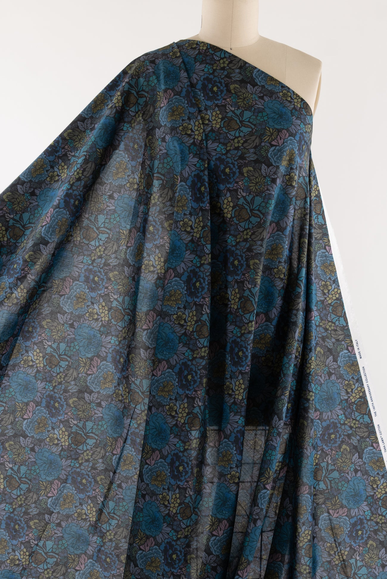 Contemporary floral inspired by vintage Liberty designs in shades of blue and gray with green and black accents. Produced in Northern Italy for Liberty of London, printed on the renowned and exceptional Tana Lawn, the cotton that behaves and feels like silk. Fine-grained, with a cool, smooth, soft hand, fluid drape, and depth of color. Perfect for a shirt, dress, skirt, tunic, soft pant, caftan, loungewear, children's or men's clothes, accessories, or home decor. Right to wear everyday or for statement pieces. One-way design 8¼" repeat. OEKO-TEX® certified.