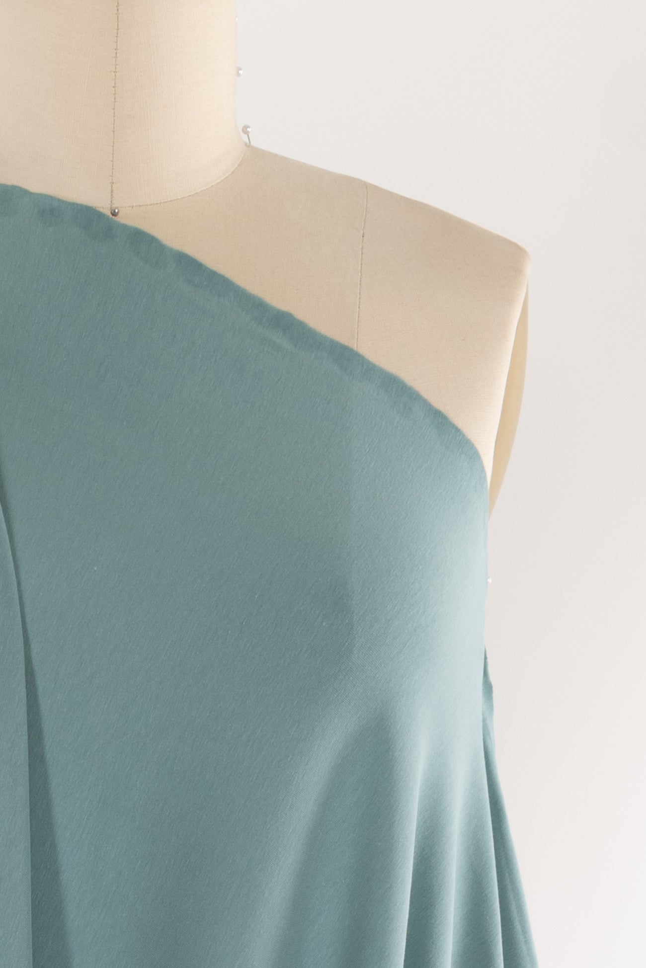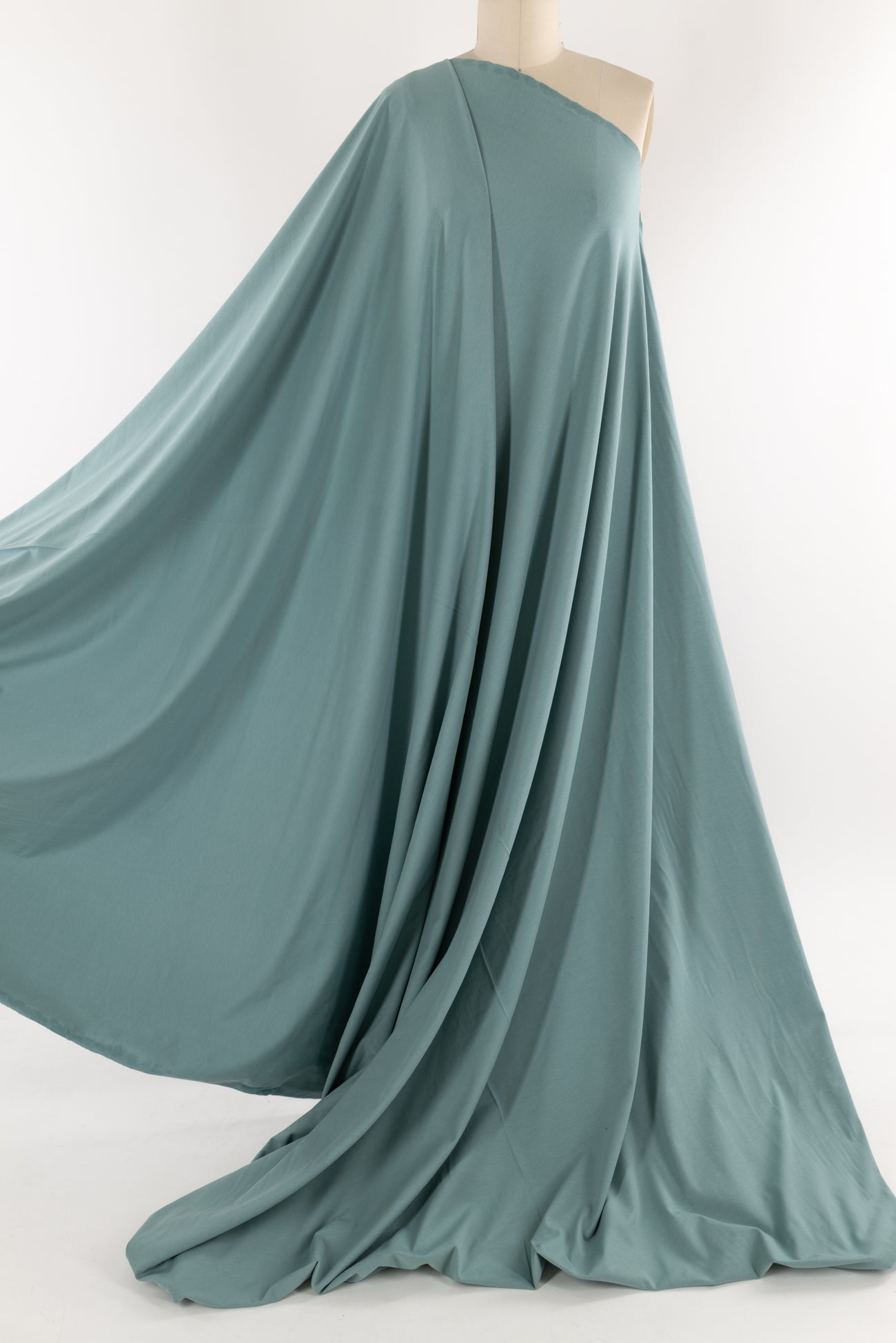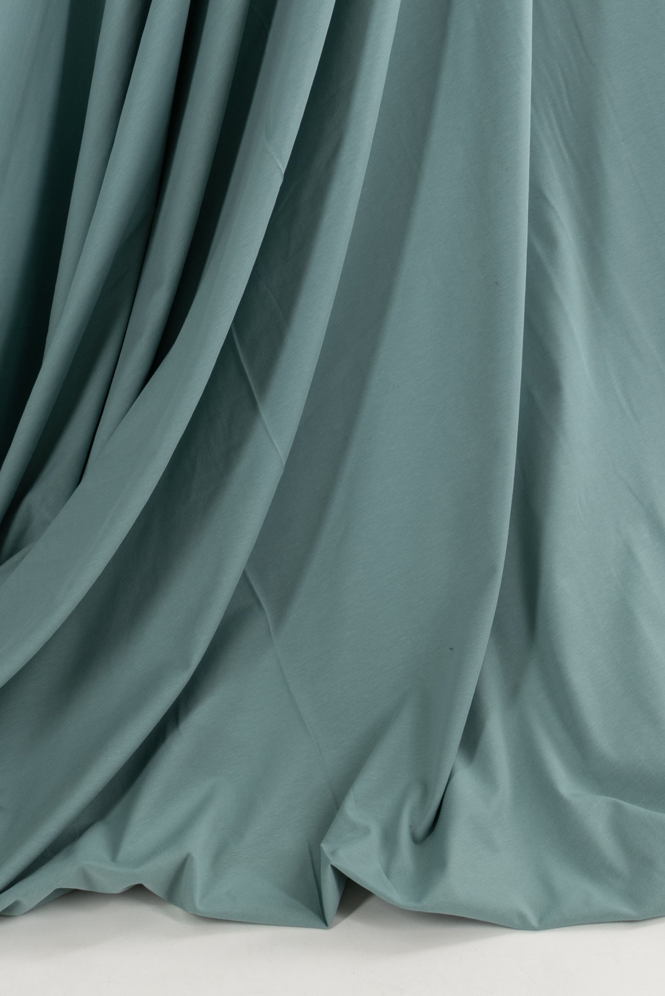 Muted pastel turquoise in an impeccable European quality cotton/spandex jersey knit, produced in Denmark. Light/mid-weight, opaque, and will skim the body in a flattering way. It has a soft, smooth hand, fluid drape, 4-way stretch and some rolling at the cut edge. Right for a variety of garments: t-shirt, tunic, dress, soft pants, leggings, cardigan, caftan, skirt, or lounge-wear, as well as children's and men's clothing. Oeko-Tex® certified.