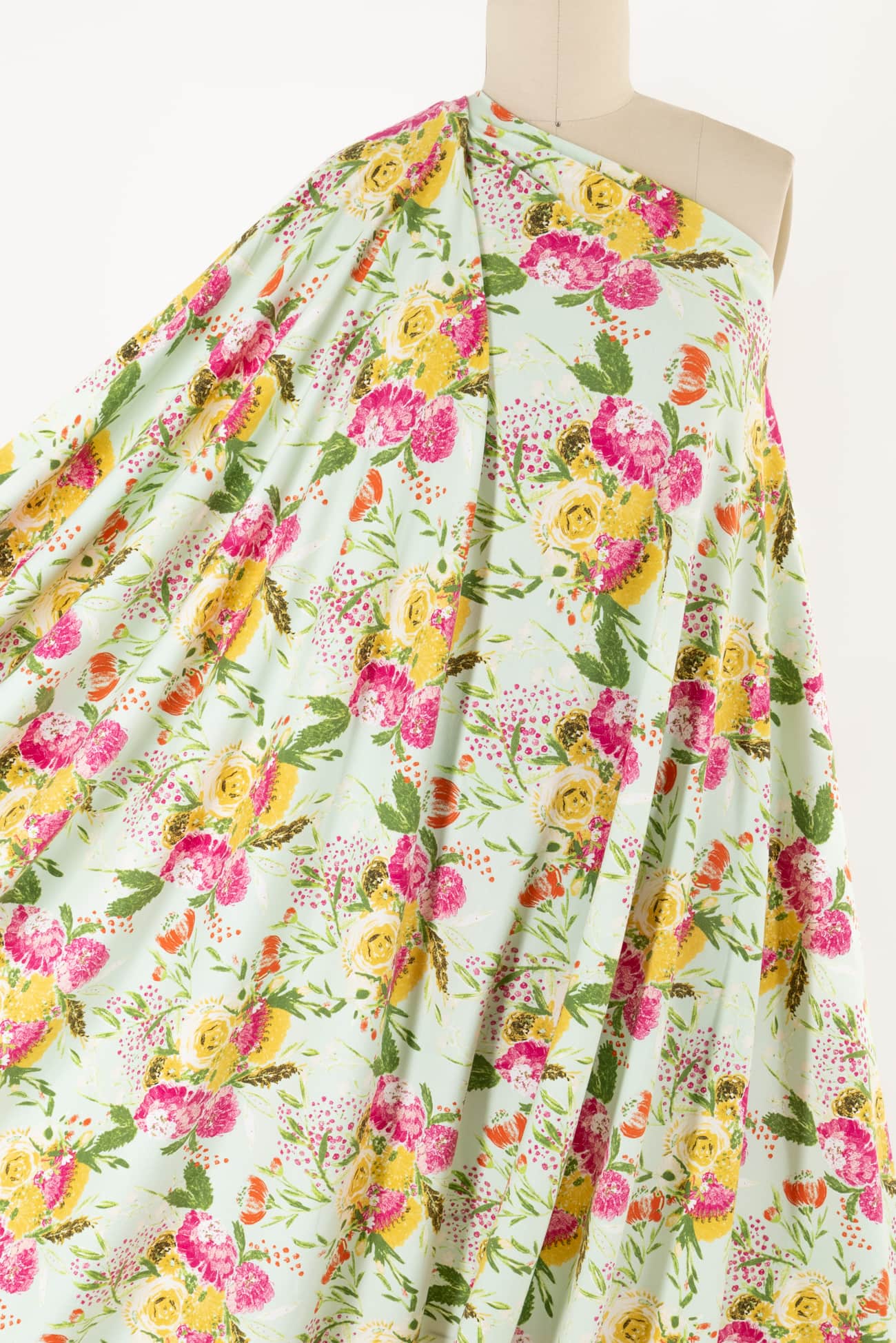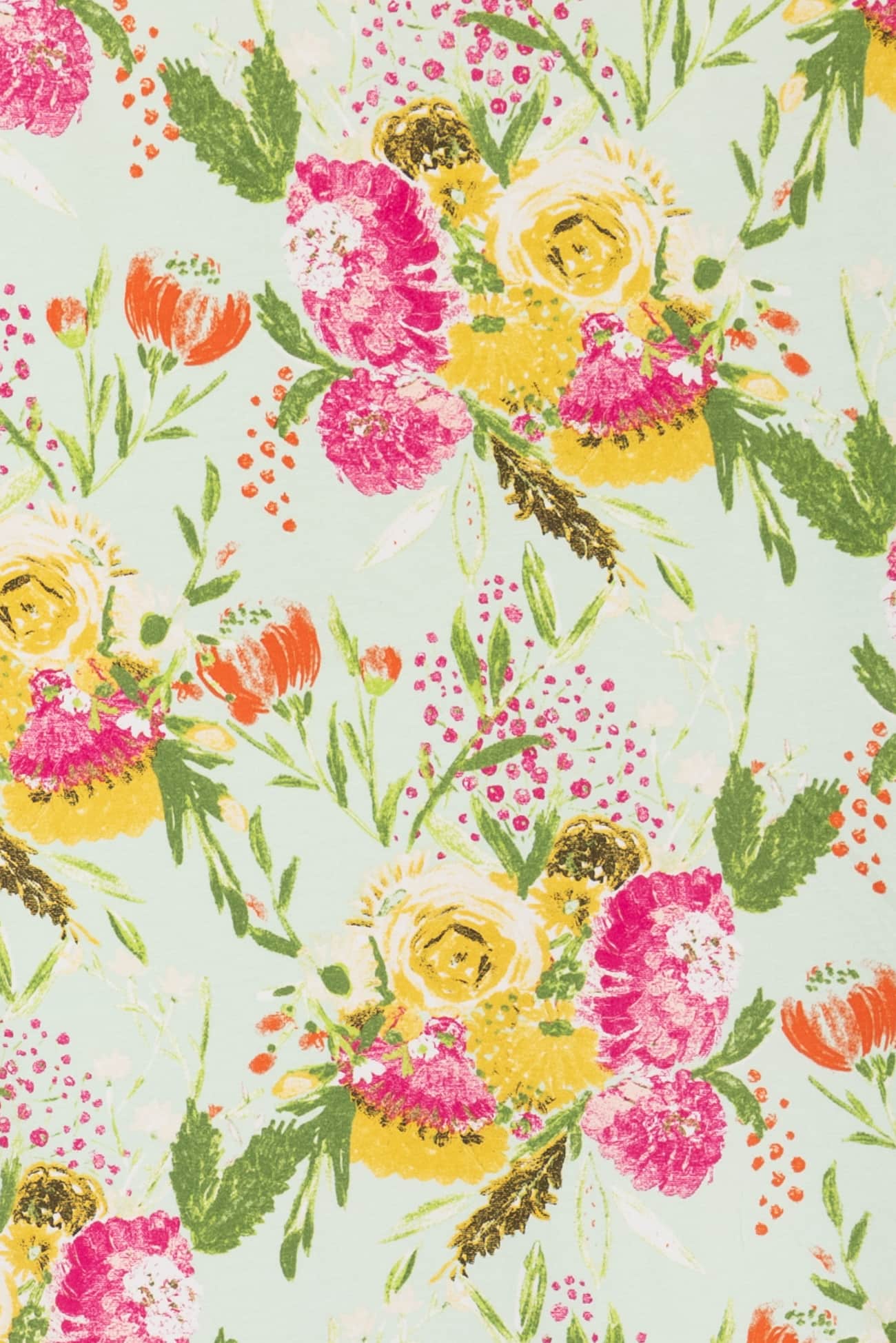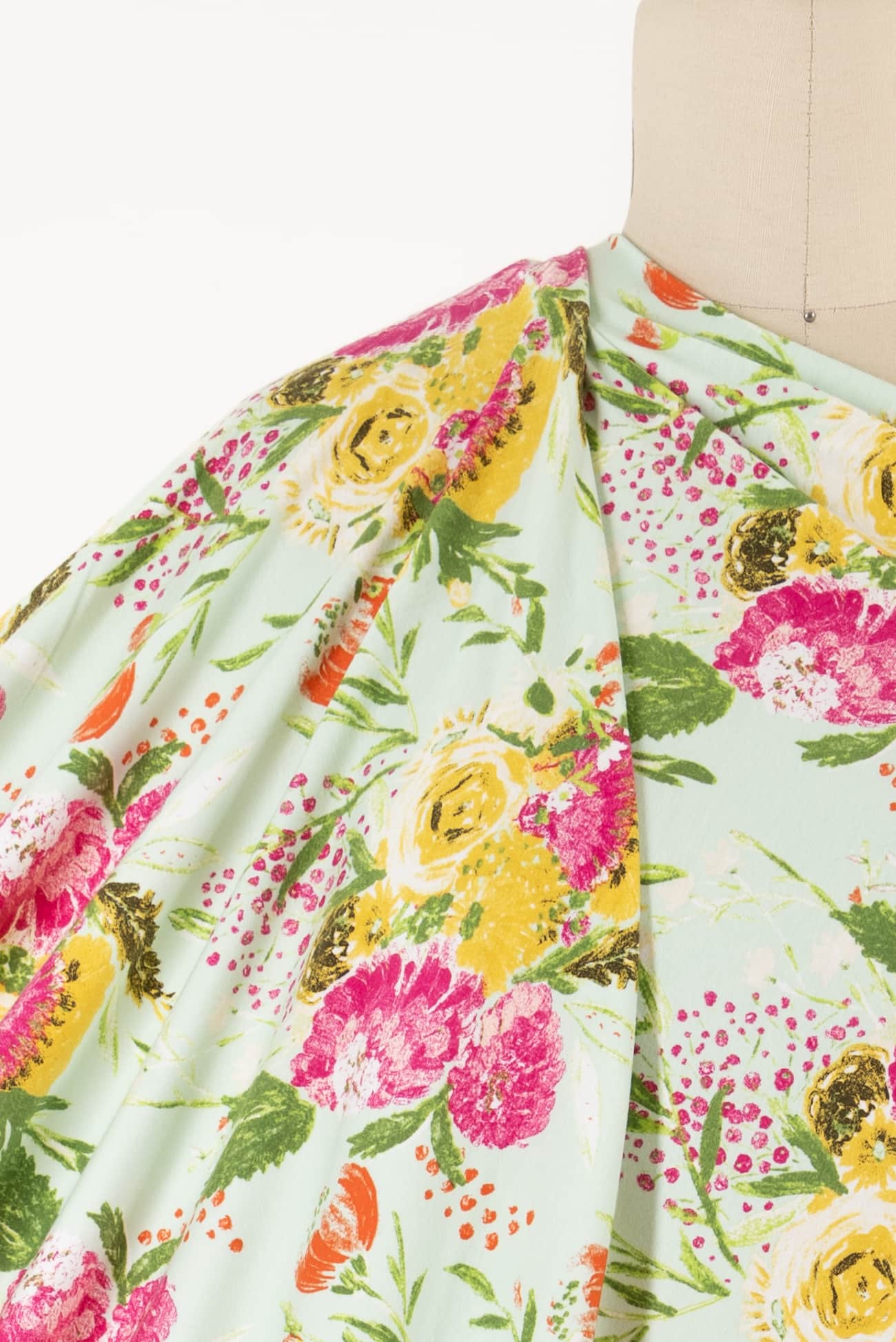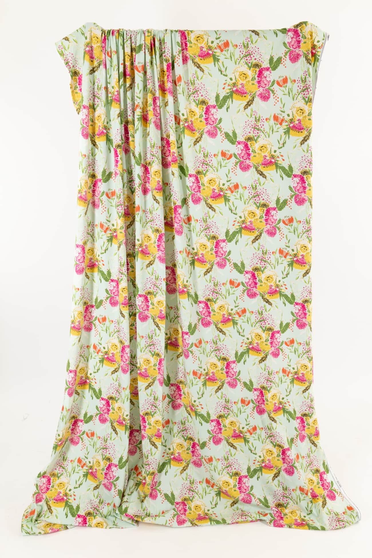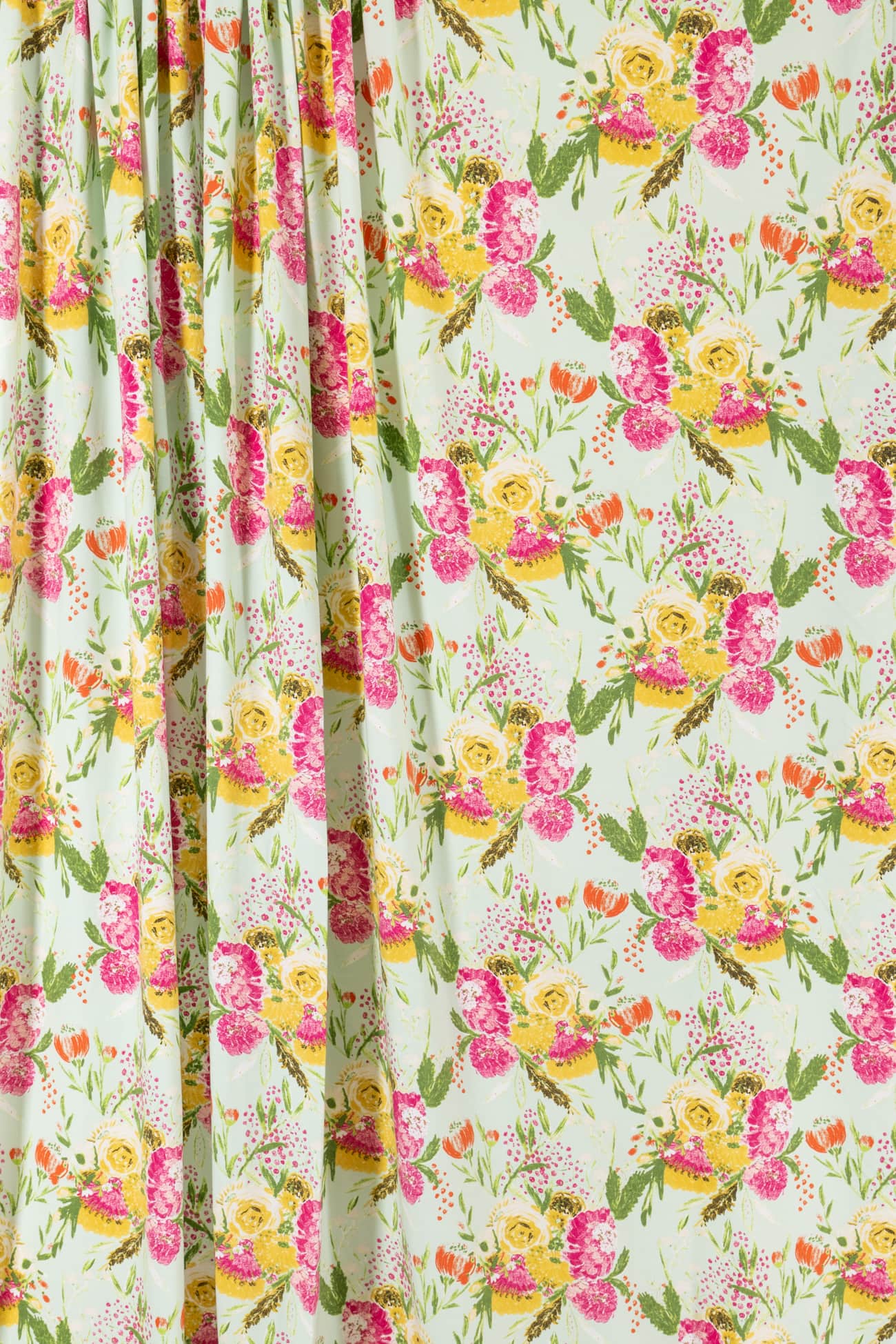 Charming multicolored floral on a pale green background with a vintage vibe, printed on a fine quality Oeko-Tex® certified cotton/spandex knit. Mid/lightweight, with an appealing soft hand and drape, 4-way stretch, 16" repeat and some rolling at the cut edge. Right for a t-shirt, top, tunic, dress, skirt, soft pants, leggings, loungewear and children's clothes.