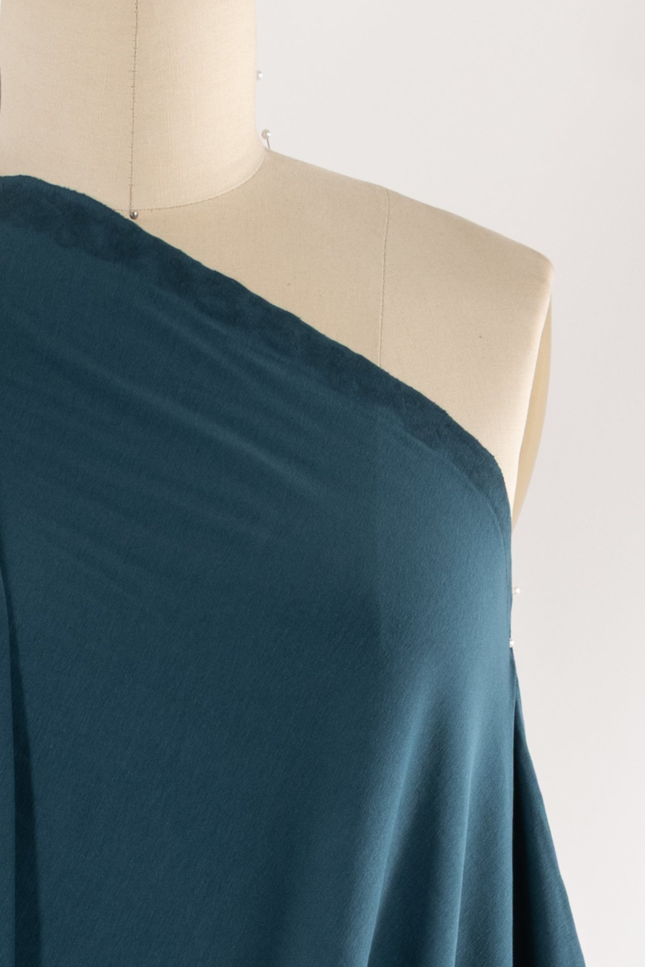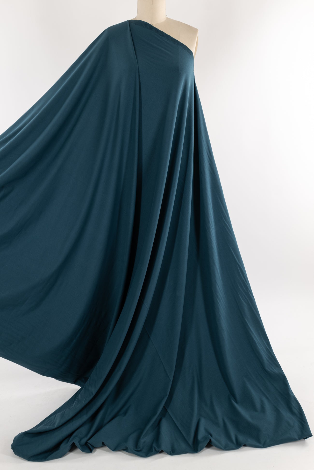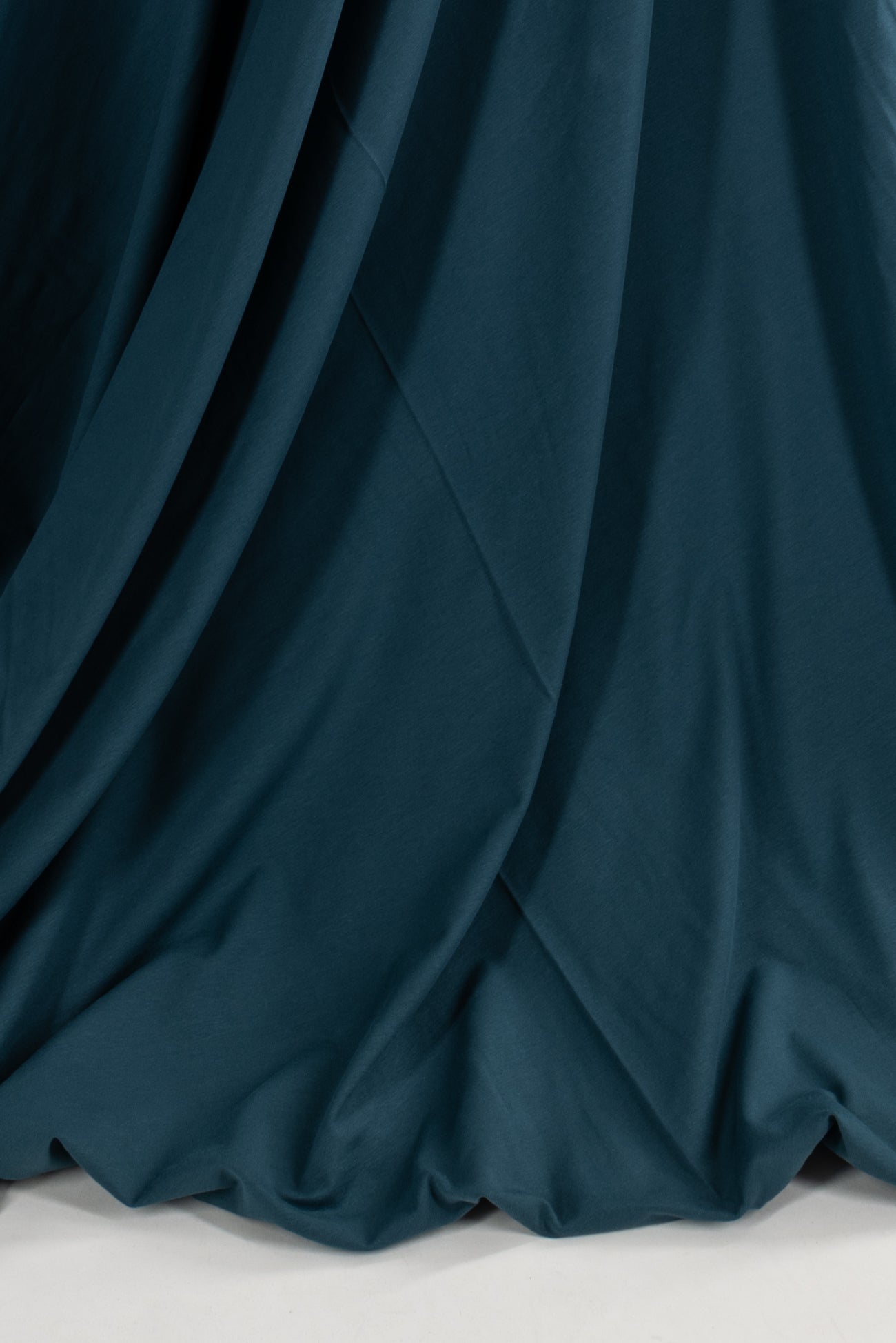 Clear rich teal in an impeccable European quality cotton/spandex jersey knit, produced in Denmark. Light/mid-weight, opaque, and will skim the body in a flattering way. It has a soft, smooth hand, fluid drape, 4-way stretch and some rolling at the cut edge. Right for a variety of garments: t-shirt, tunic, dress, soft pants, leggings, cardigan, caftan, skirt, or lounge-wear, as well as children's and men's clothing. Oeko-Tex® certified.