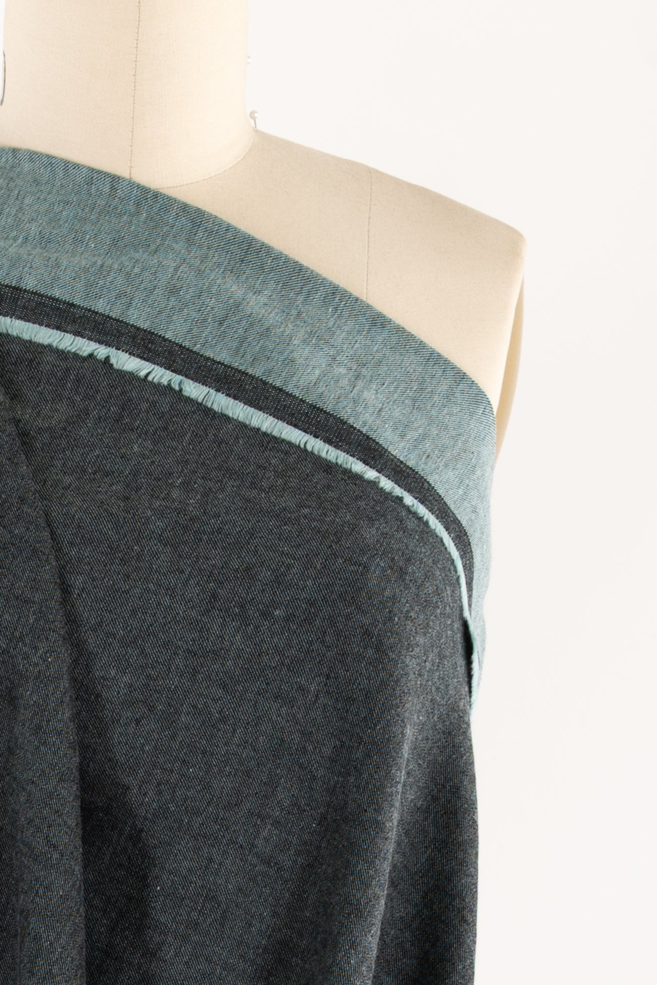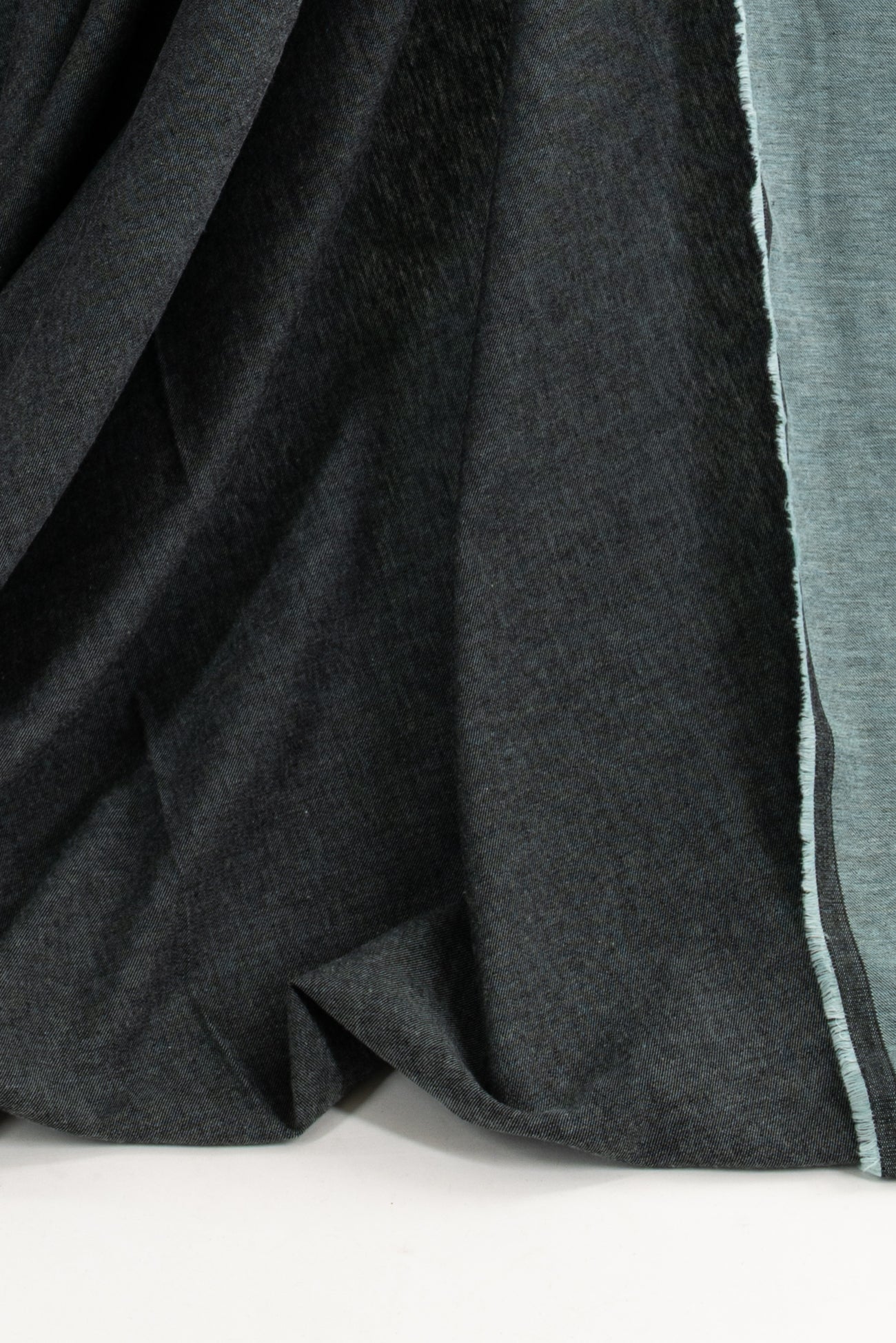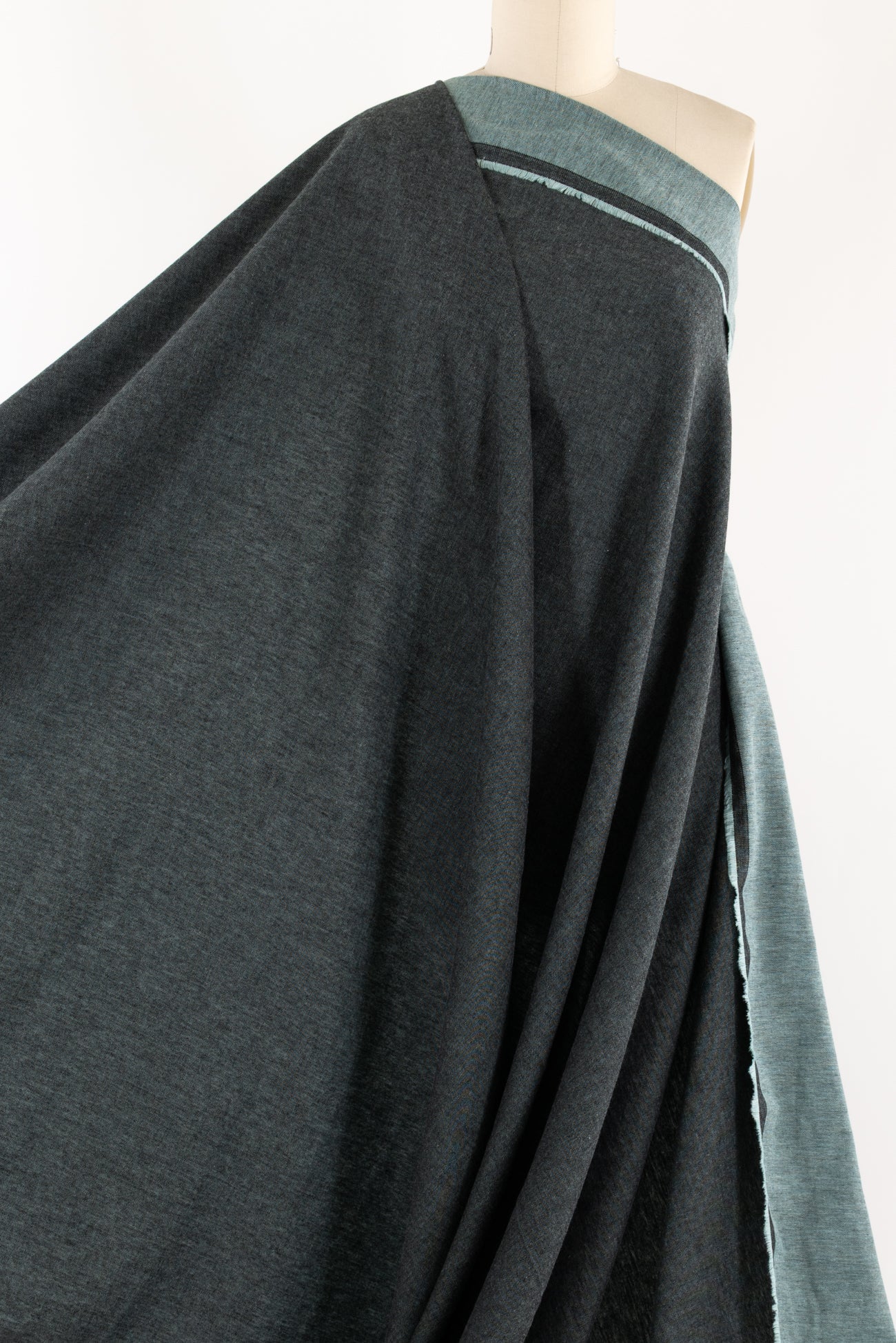 Delicate tourmaline and black double sided flannel in a fine quality deadstock from a Southern California designer. Light/mid-weight woven cotton with a softly brushed hand on both sides, one side more aqua, the other more black and a soft drape. Use either or both sides. Right for a shirt, light jacket, dress, top, tunic, skirt, soft pant, men's or children's.