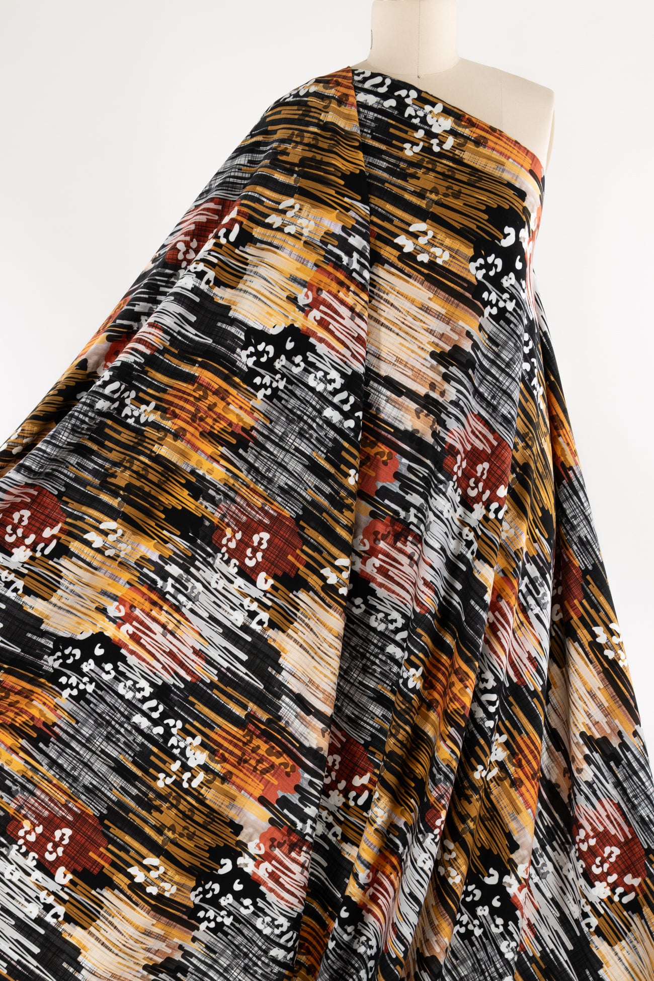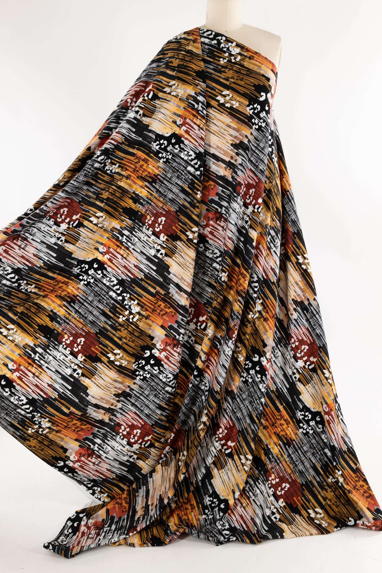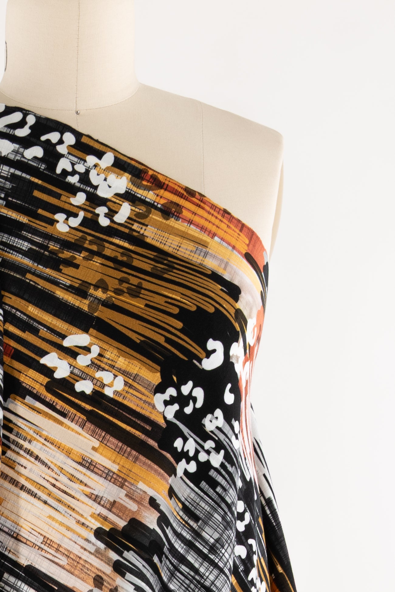 Striking arty abstract in camel, apricot, ochre, gray, white and black, digitally printed on luxurious cotton knit jersey in the Netherlands. Impeccable quality, light/mid-weight, opaque, with a flattering body-skimming flow, appealing soft hand, fluid drape, crosswise stretch, some lengthwise stretch, a 25½" repeat and some rolling at the cut edge. Ideal for a wide range of garments, t-shirt, tunic, dress, skirt, soft pants, loungewear, caftan, kimono, or children's. Oeko-Tex® certified.