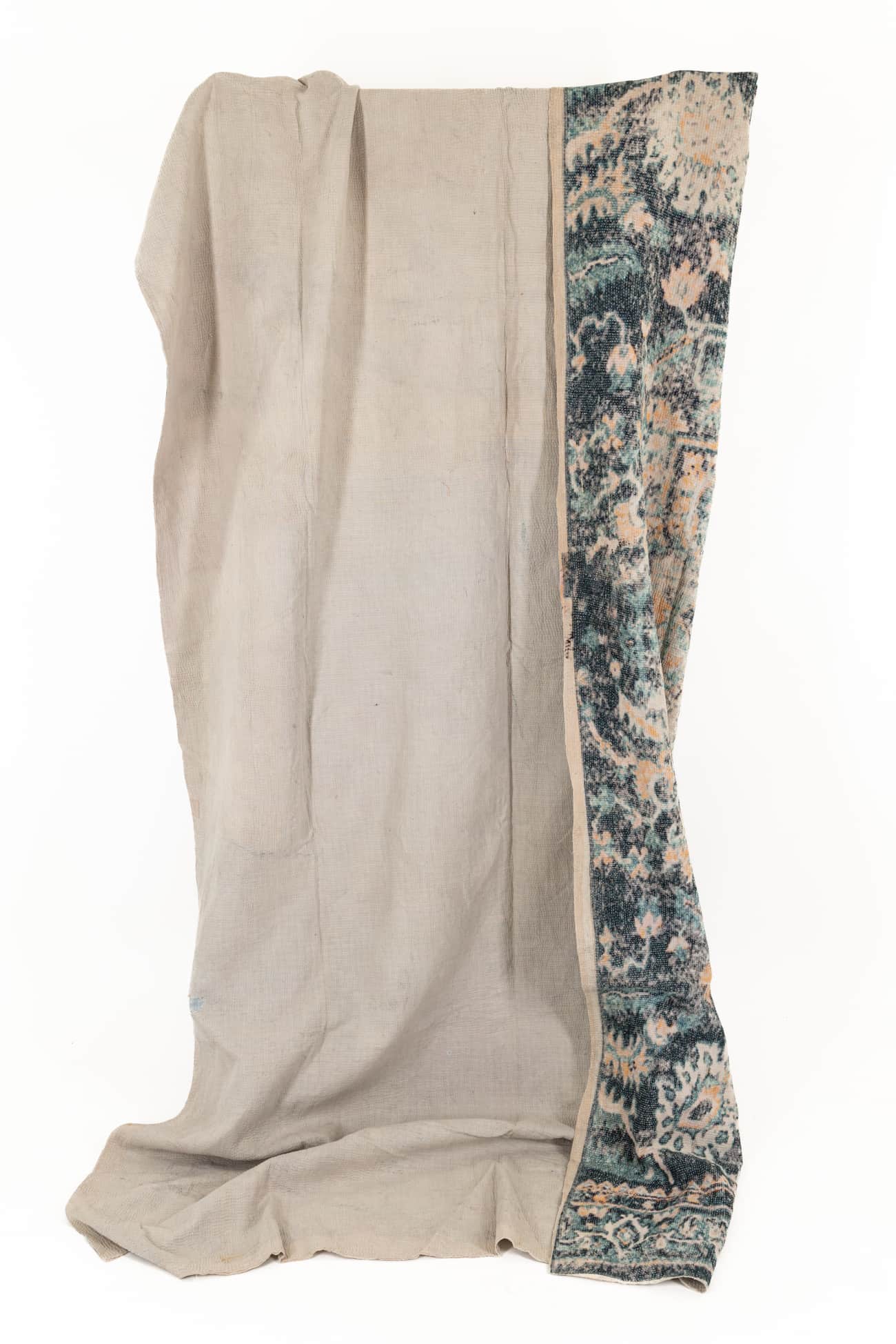Spectacular one of a kind artisan kantha quilts made from vintage saris are hand stitched, reversible and different on each side. Some are patched, over-dyed, over-printed or embroidered - the colors and designs indicate their age, history and the design sense of the maker. Soft and supple, they feel delicious, the fine overall stitching is appealing to the touch and creates a subtle texture. The colors mix in surprisingly beautiful ways, some bright, some soft. Some are pieced front and back, some are one fabric on the front, some have a solid color on the reverse. Weight and size vary with each quilt. Weights in this collection vary from 24 oz to 66 oz. Sizes range from 56" x 57" to 64" x 93". All possess a rare and deep beauty. Use as a throw or blanket, or as fabric for garments or accessories.