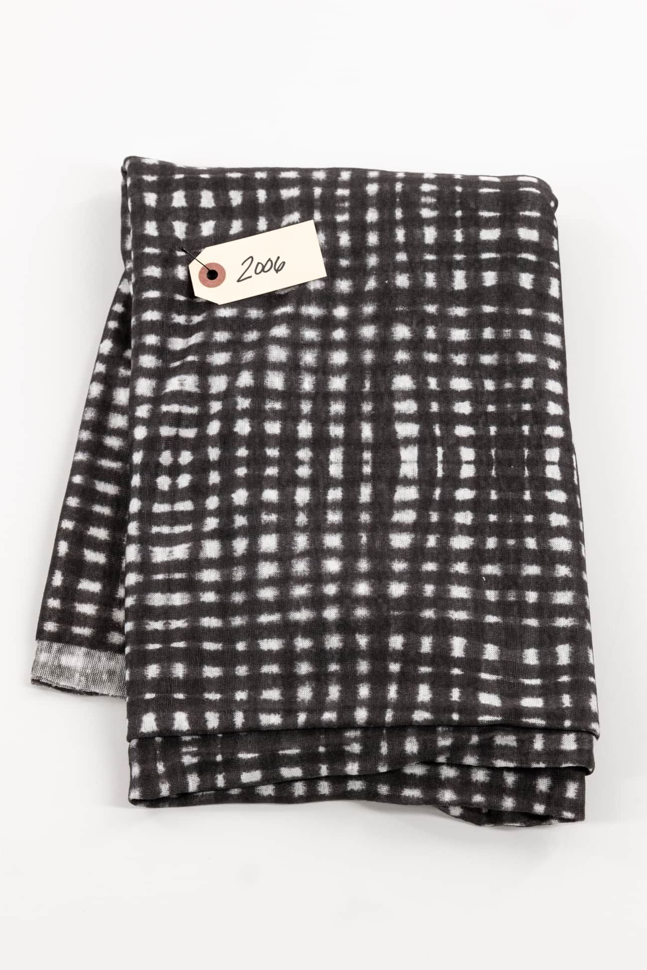 One of a kind from Marcy's stash. Linen knit, opaque, hand drawn effect checks printed soft black on white. Deadstock from LA designer 3 Dot, produced in Italy.