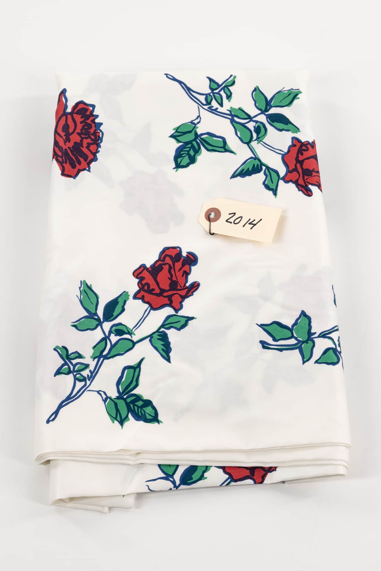 One of a kind from Marcy's stash. Red roses on white poly crepe smooth hand and fluid drape. Deadstock produced in Italy.