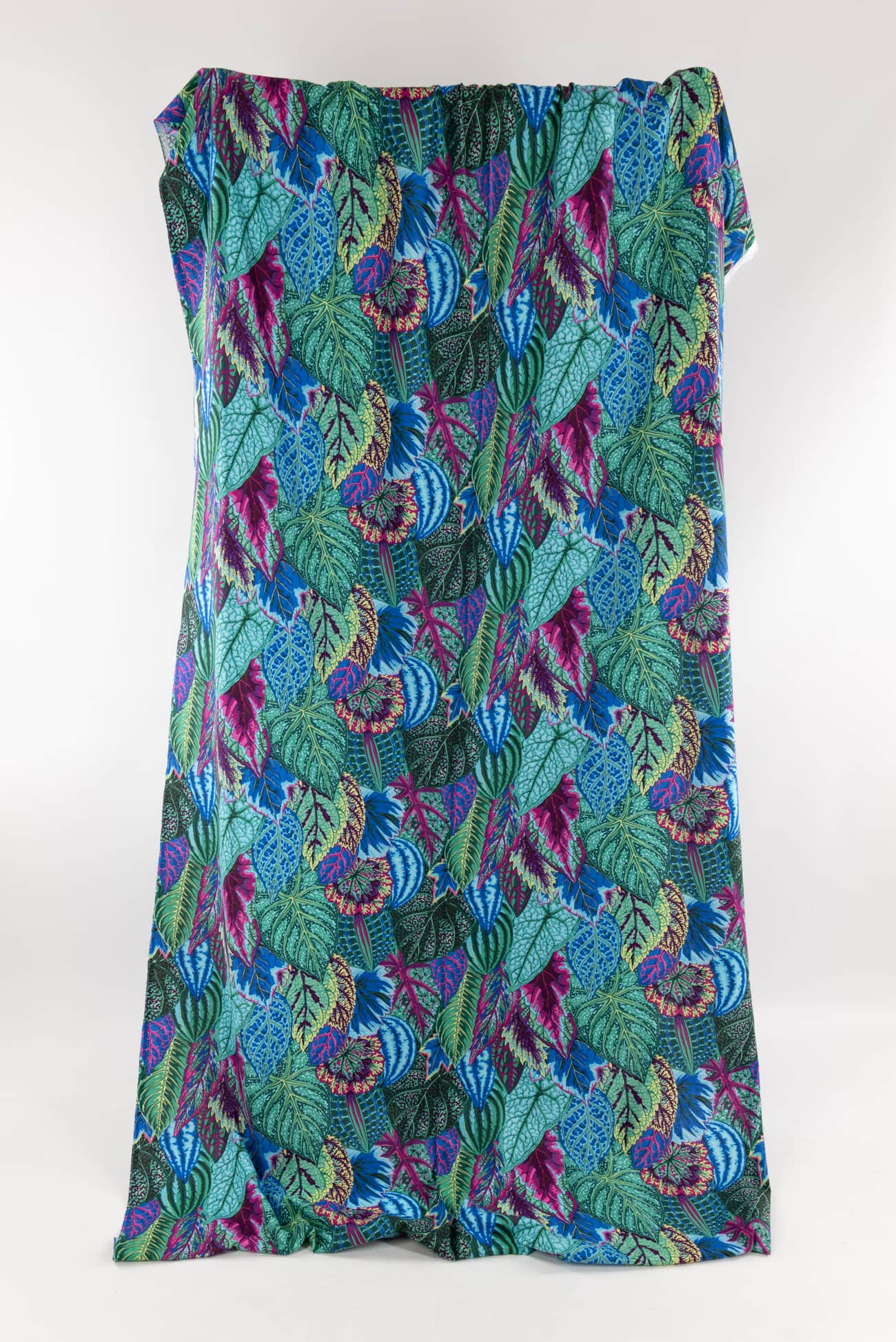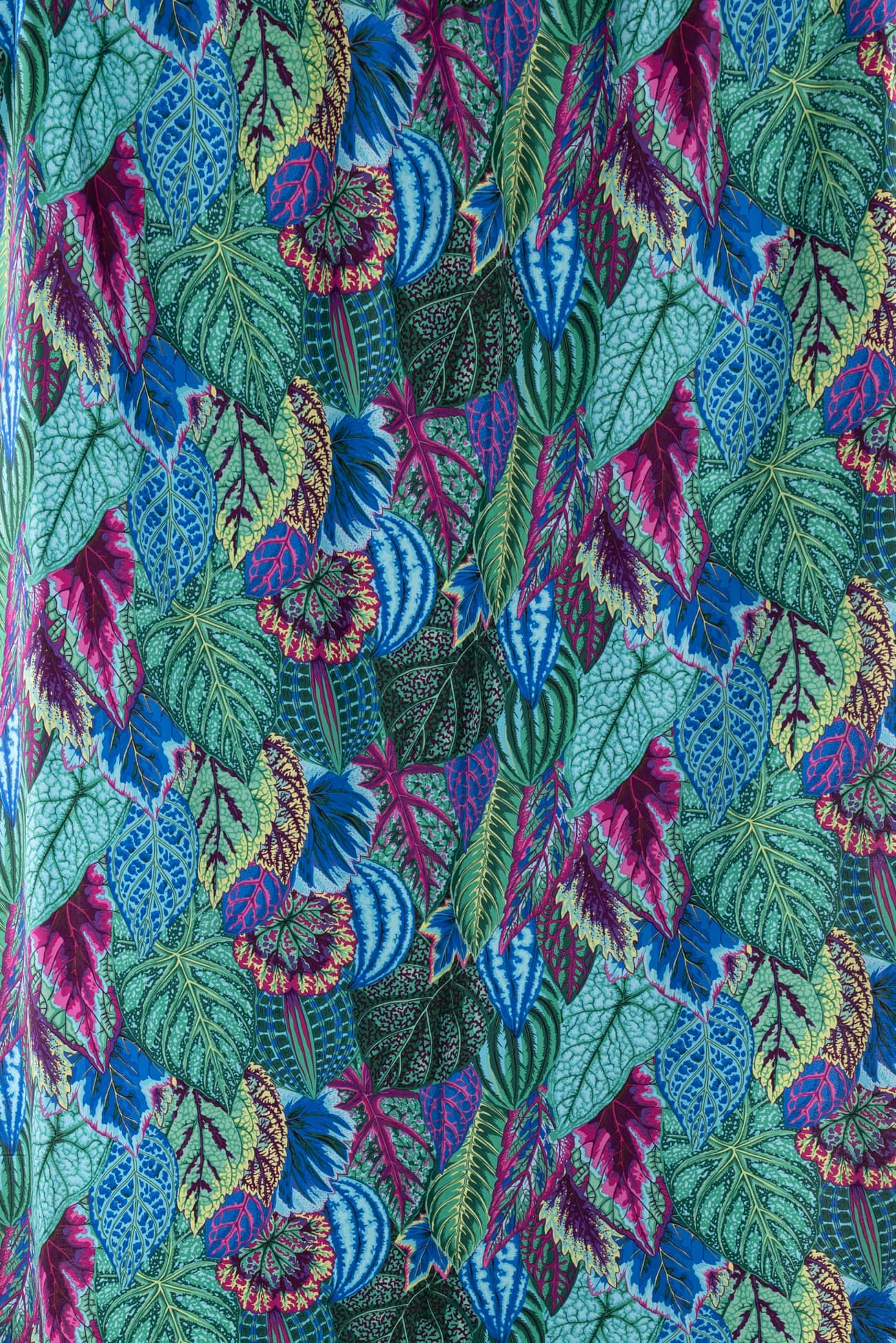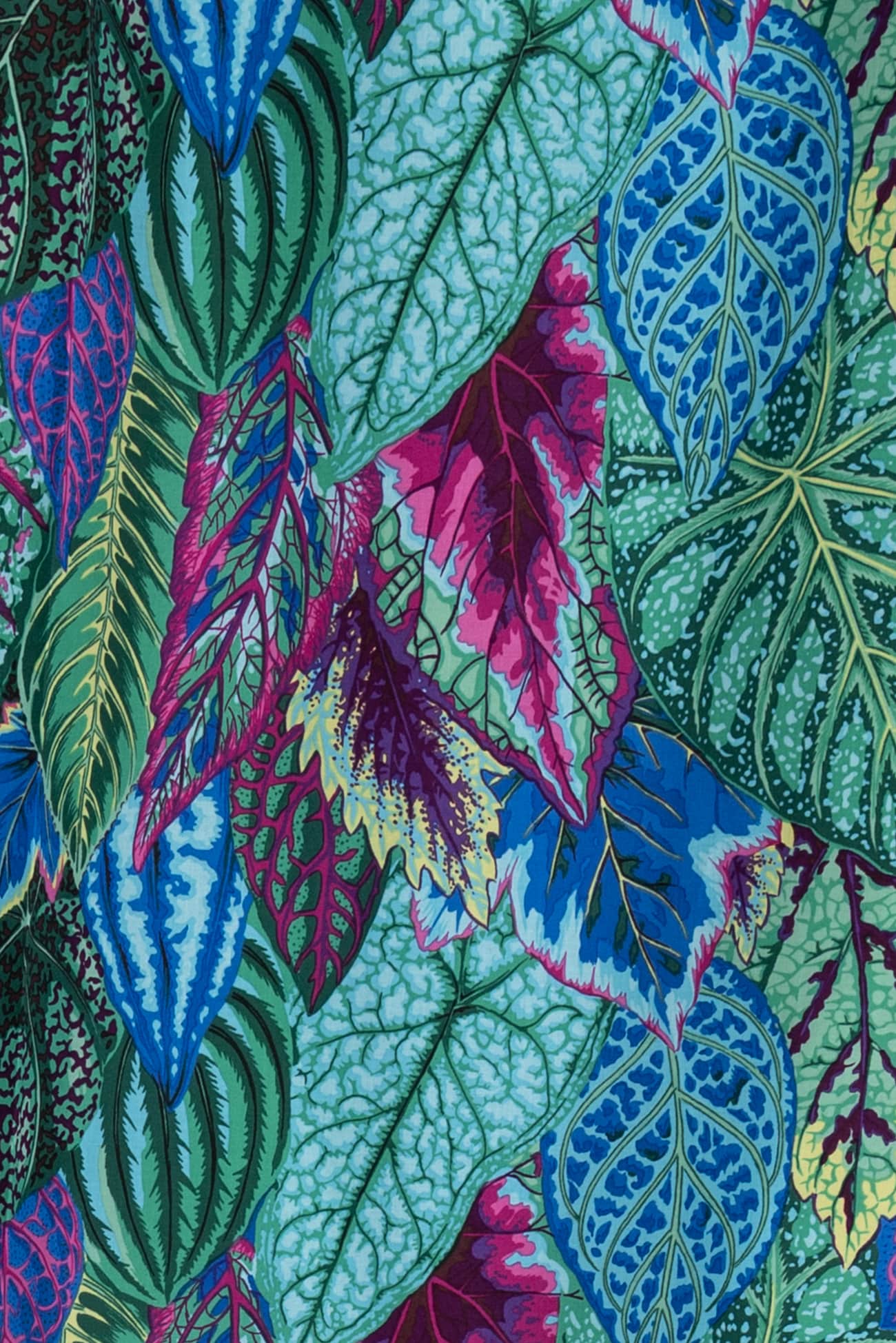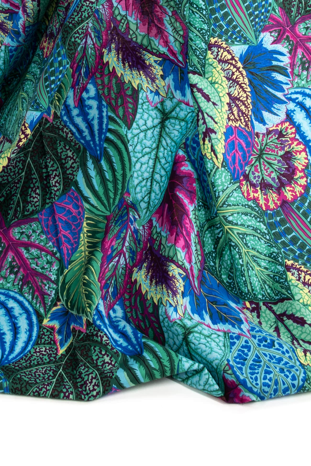 Lush and lively leaves in shades of blue and green with bright accents in a fine-grained cotton woven, from the studio of renowned colorist Kaffe Fassett. Lightweight, opaque with a smooth matte hand, an 11¾" repeat and light drape. Right for a dress, shirt, skirt, tunic, top, soft pant, caftan, kimono, loungewear, men's or children's.