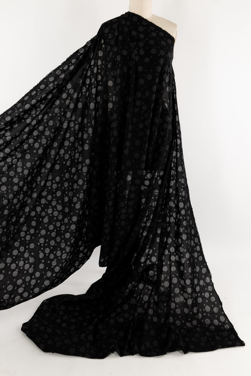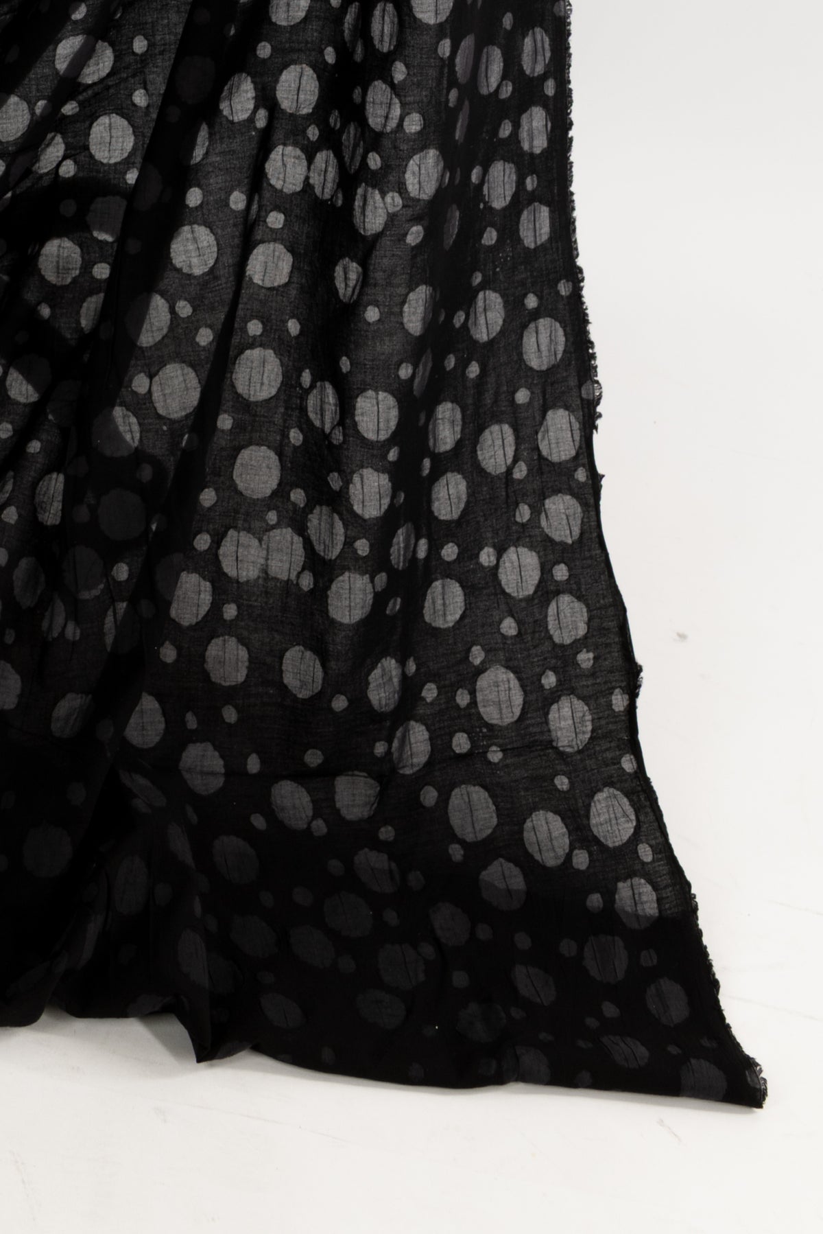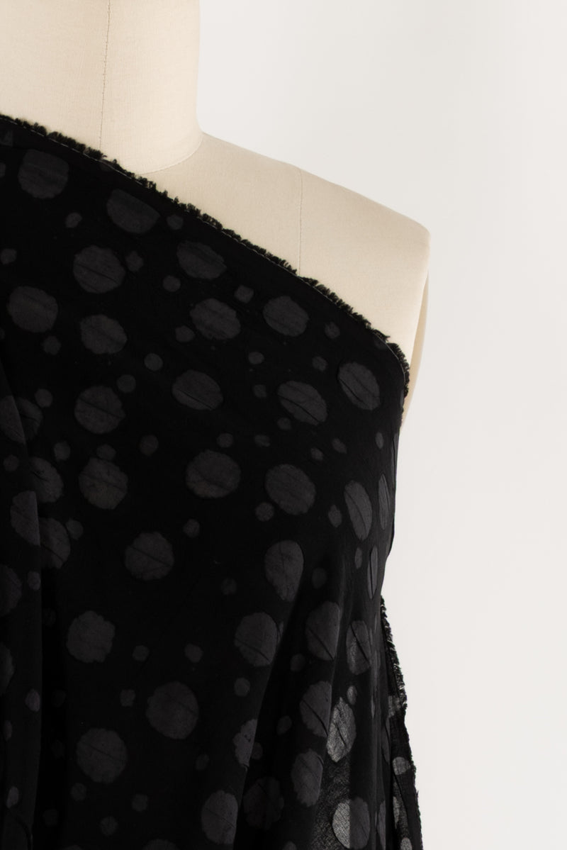 Beautiful quality lightweight cotton in black with hand-batiked all over charcoal large and small semi-opaque dots. Softly textured, with an appealing cool dry hand and light airy drape. The supple weight is right for a shirt, tunic, blouse, dress, skirt, soft pants, jumpsuit, kimono, caftan, men's, or children's. Also great for quilting, home dec, and crafting.