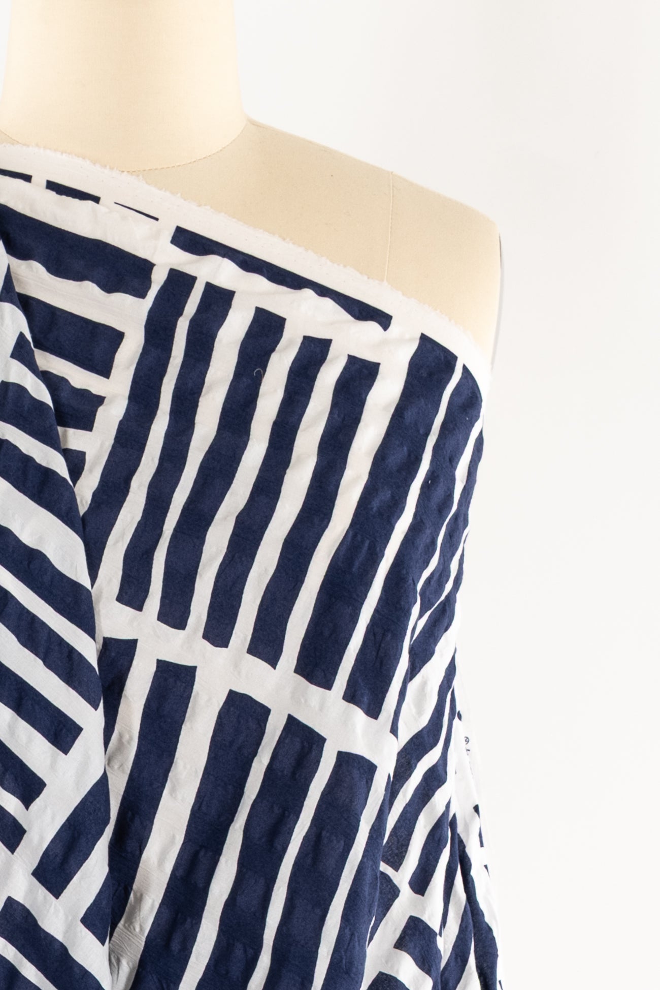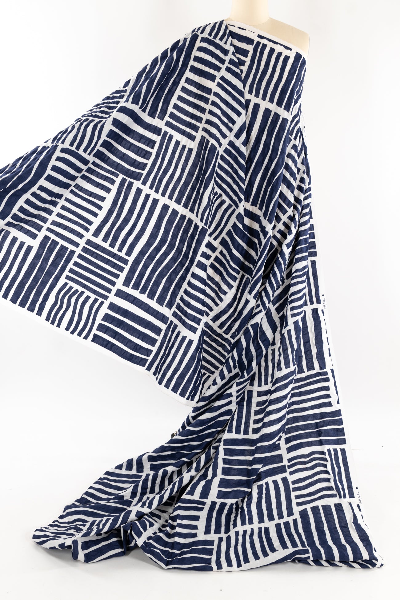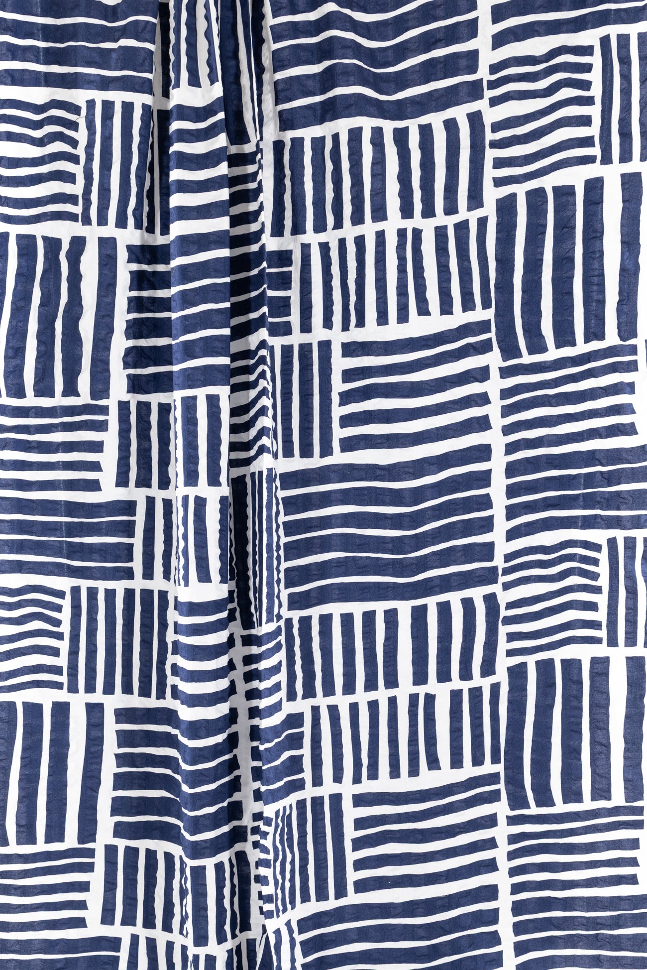 A gorgeous grid of navy blue stripes on a wide white seersucker, impeccable quality deadstock from a Japanese mill. The softly crimped texture of seersucker ensures it does not cling, delivering cool comfort even in the hottest climates. Perfect for the heat whether you are in city or country. Lovely shirting/dress weight with an appealing soft cool lightly textured hand, supple drape and 22" repeat. Perfect for a shirt, blouse, dress, tunic, soft pants, caftan, kimono, men's or children's. Limited quantity.