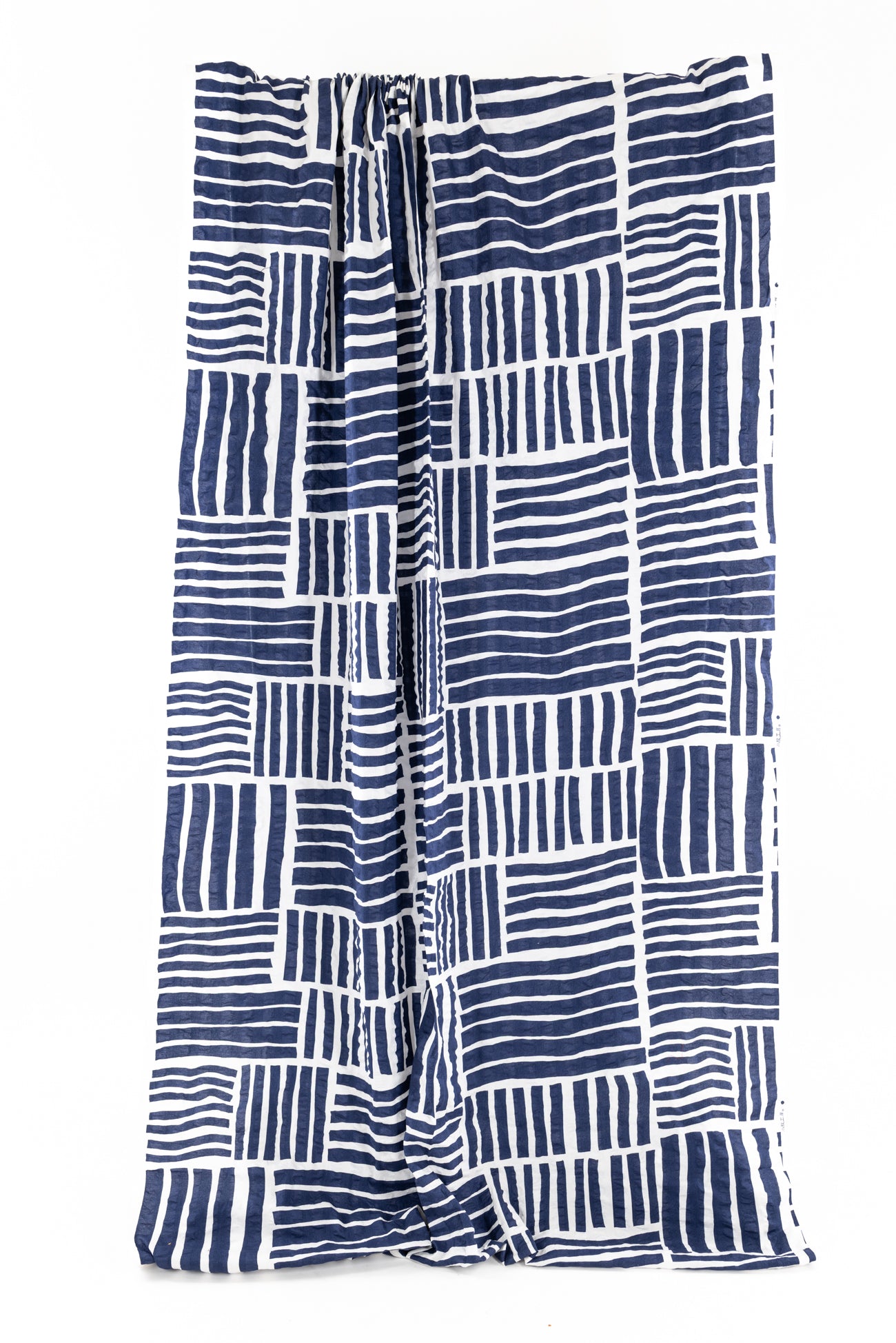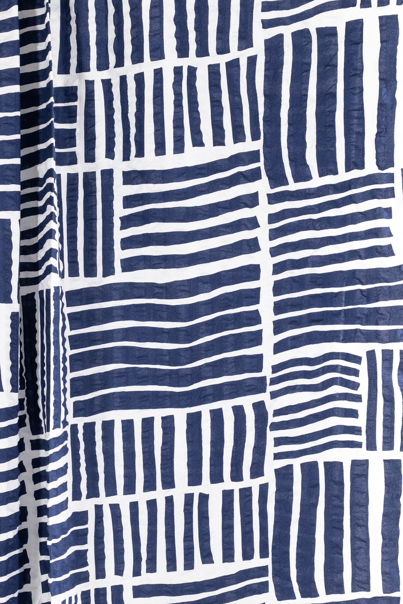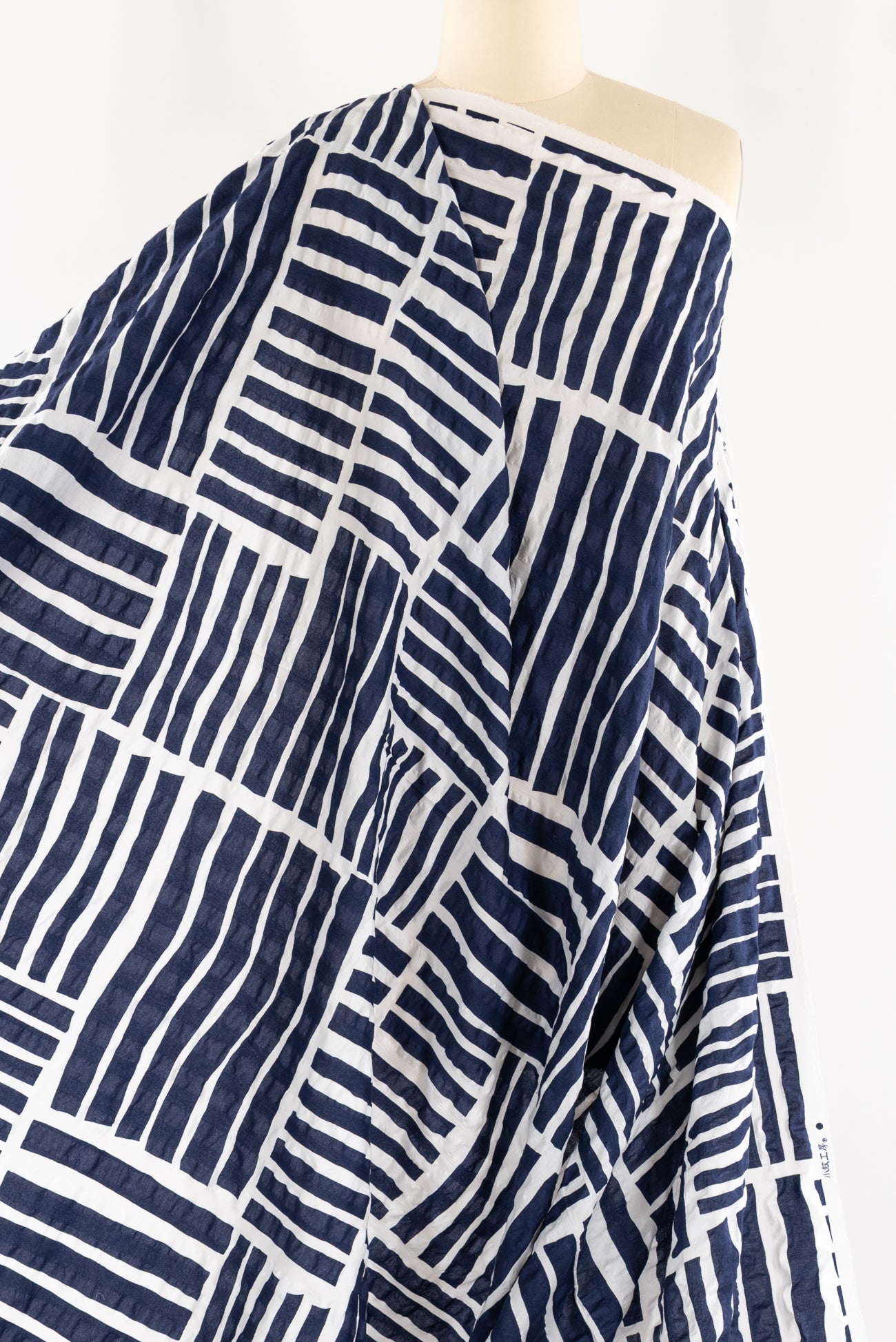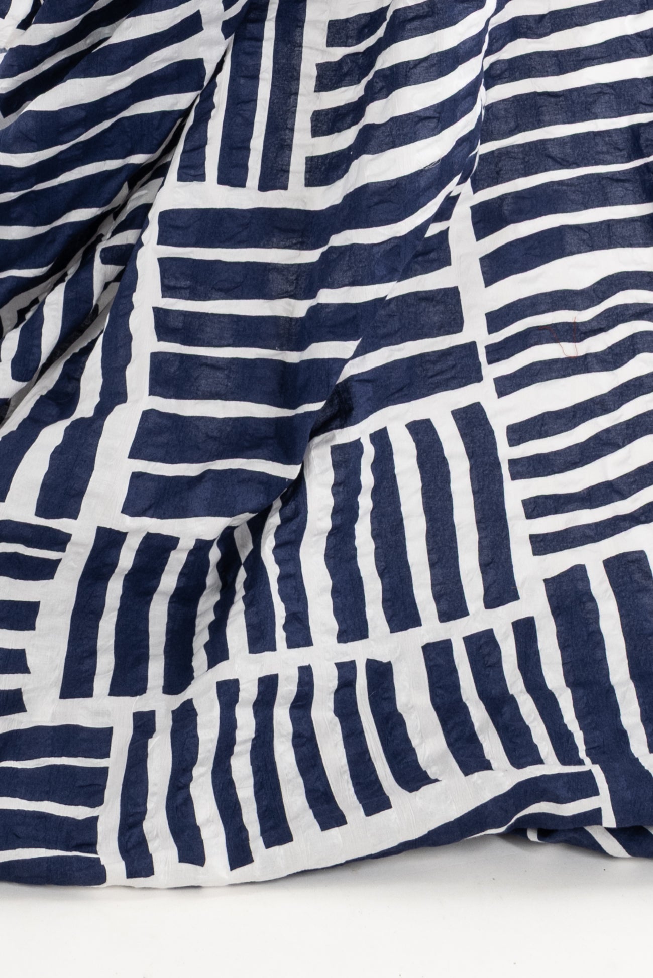 A gorgeous grid of navy blue stripes on a wide white seersucker, impeccable quality deadstock from a Japanese mill. The softly crimped texture of seersucker ensures it does not cling, delivering cool comfort even in the hottest climates. Perfect for the heat whether you are in city or country. Lovely shirting/dress weight with an appealing soft cool lightly textured hand, supple drape and 22" repeat. Perfect for a shirt, blouse, dress, tunic, soft pants, caftan, kimono, men's or children's. Limited quantity.