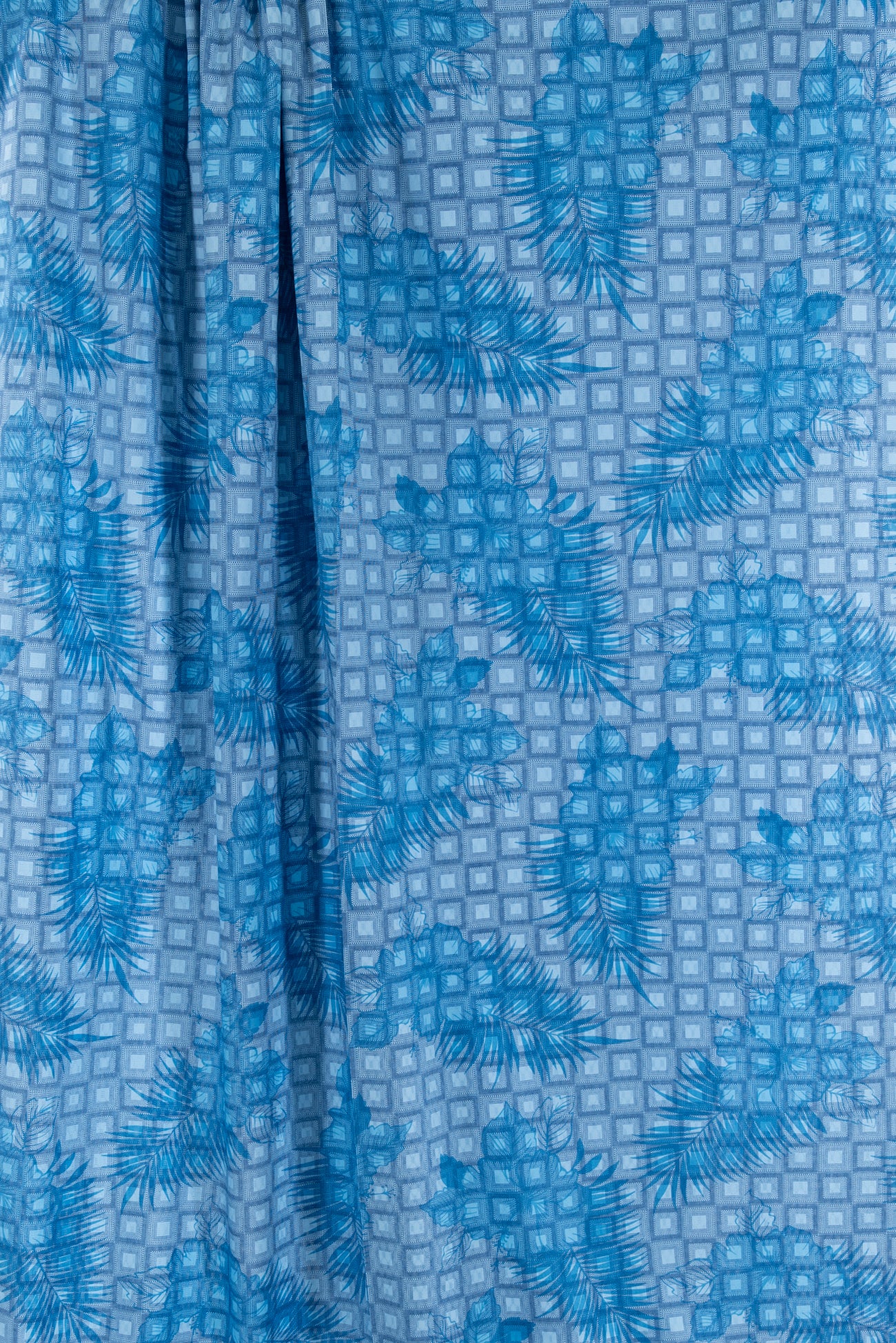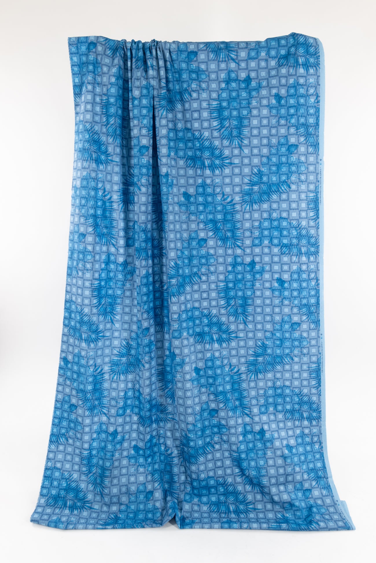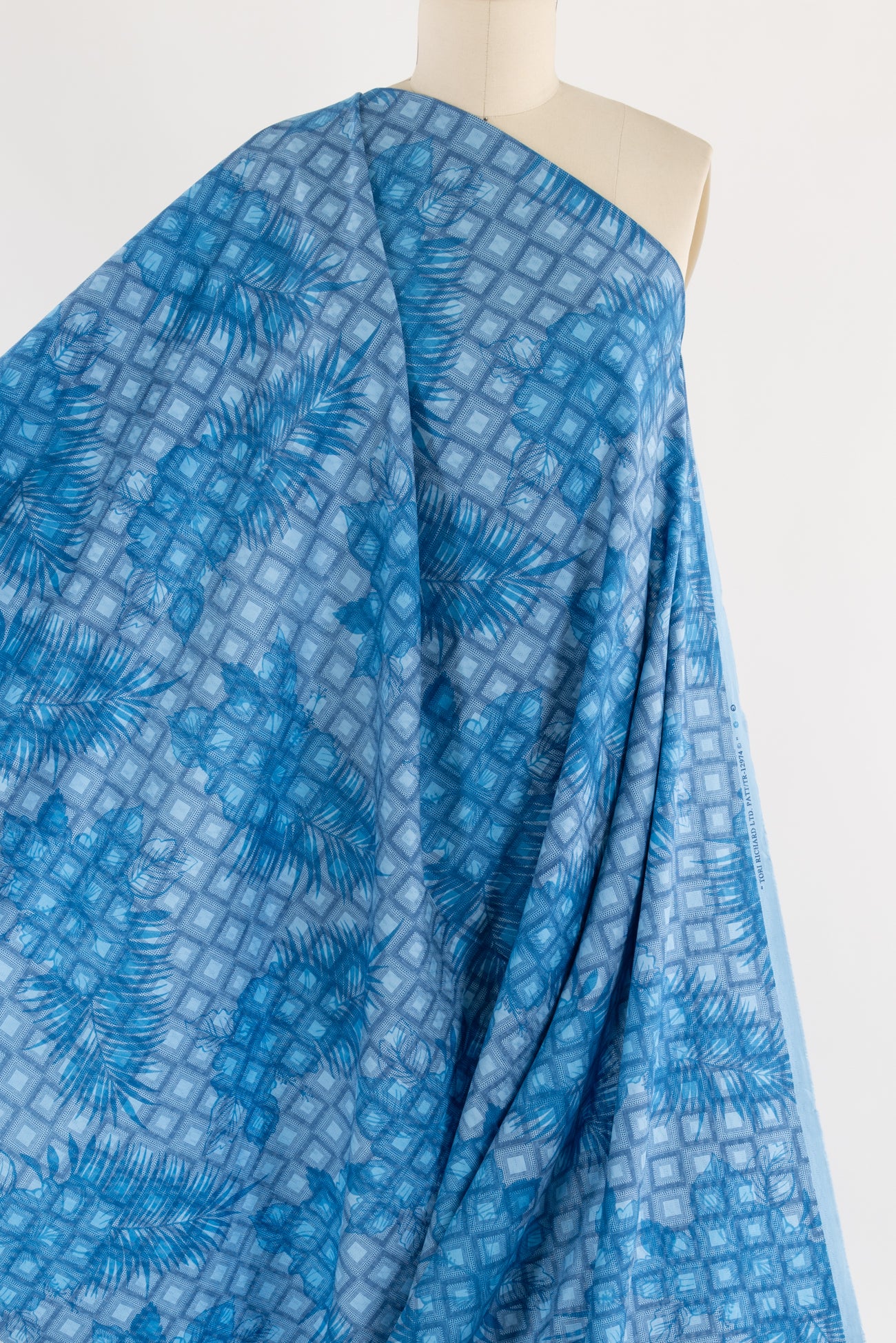 Flowers and ferns in shades of blue on a grid of squares, printed on a cotton dobby weave, fine quality deadstock from resort wear designer Tori Richard. Fun light/shirting weight, with a cool lightly textured hand, a 24" repeat and fluid drape. Perfect for a shirt, dress, skirt, tunic, soft pant, caftan, loungewear, men's or children's. Limited quantity available.