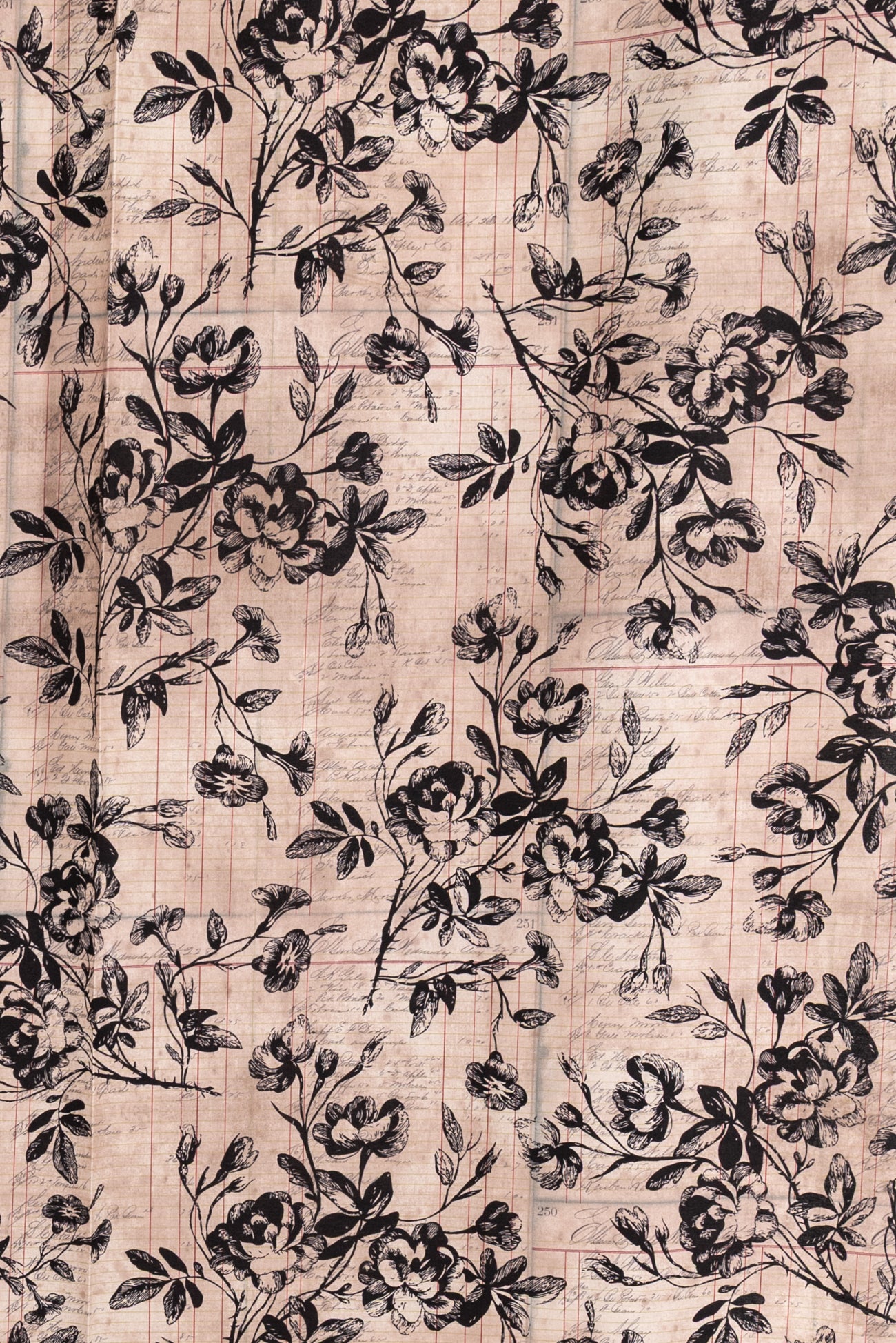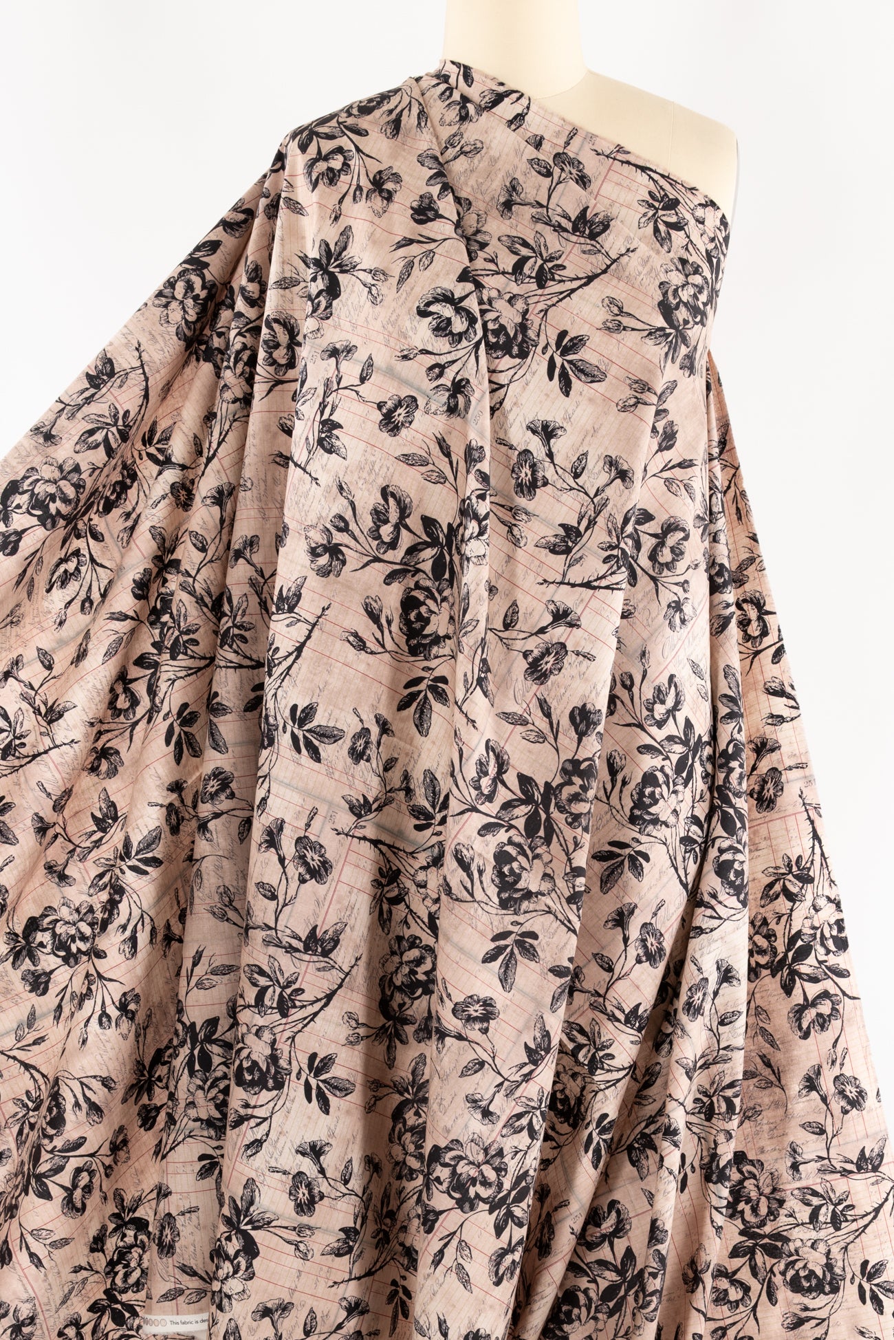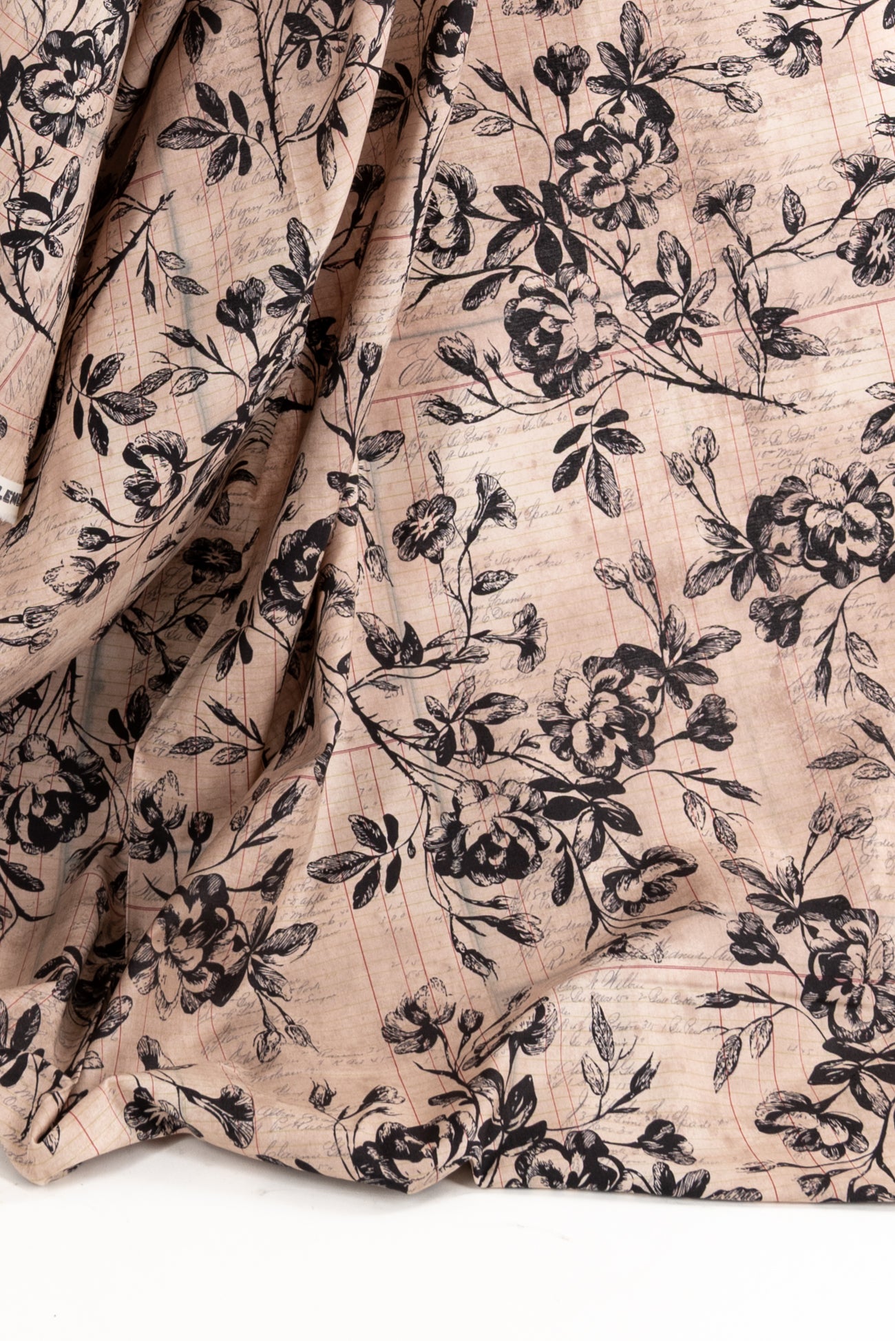 A romance of roses in black float over an artfully faded gardener's ledger printed on a fine-grained cotton woven. Lightweight, opaque with a smooth matte hand, a 24½" repeat and light drape. Right for a dress, shirt, skirt, tunic, top, soft pant, caftan, kimono, loungewear or children's.