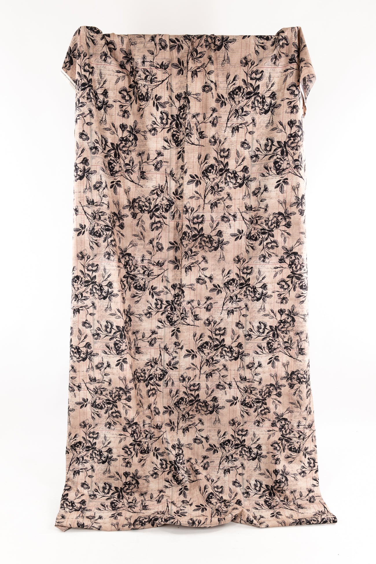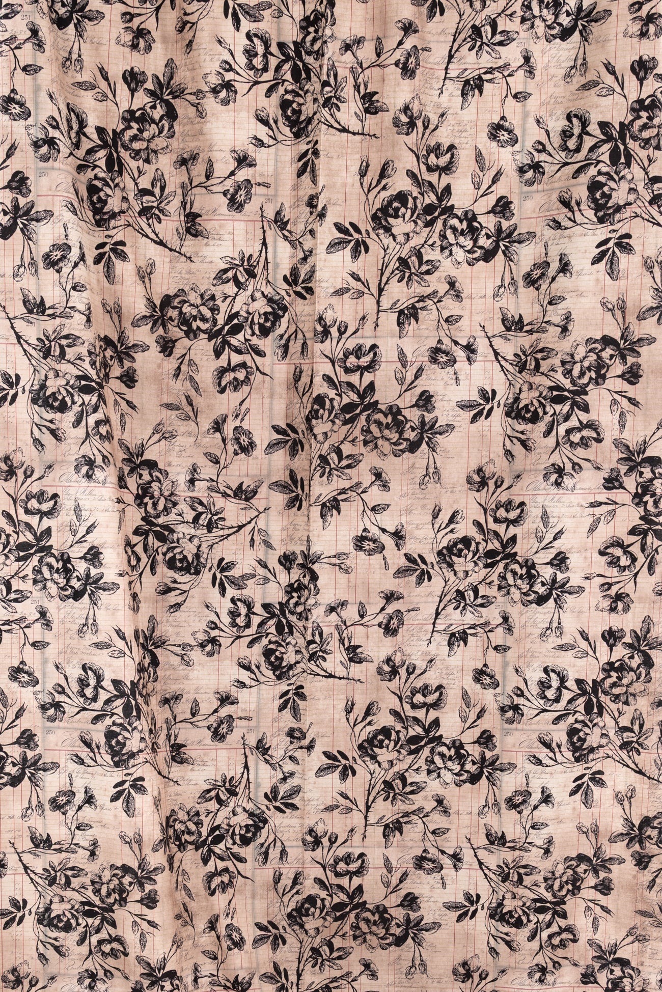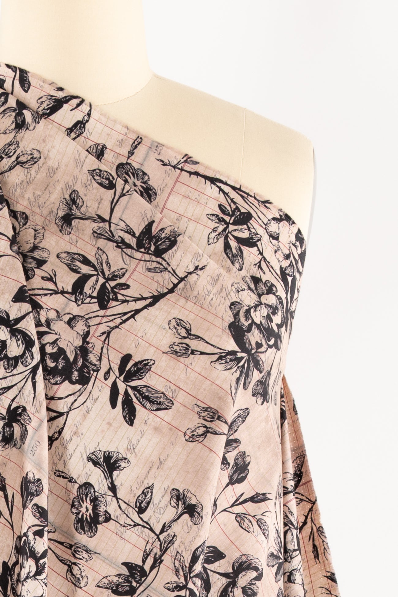 A romance of roses in black float over an artfully faded gardener's ledger printed on a fine-grained cotton woven. Lightweight, opaque with a smooth matte hand, a 24½" repeat and light drape. Right for a dress, shirt, skirt, tunic, top, soft pant, caftan, kimono, loungewear or children's.