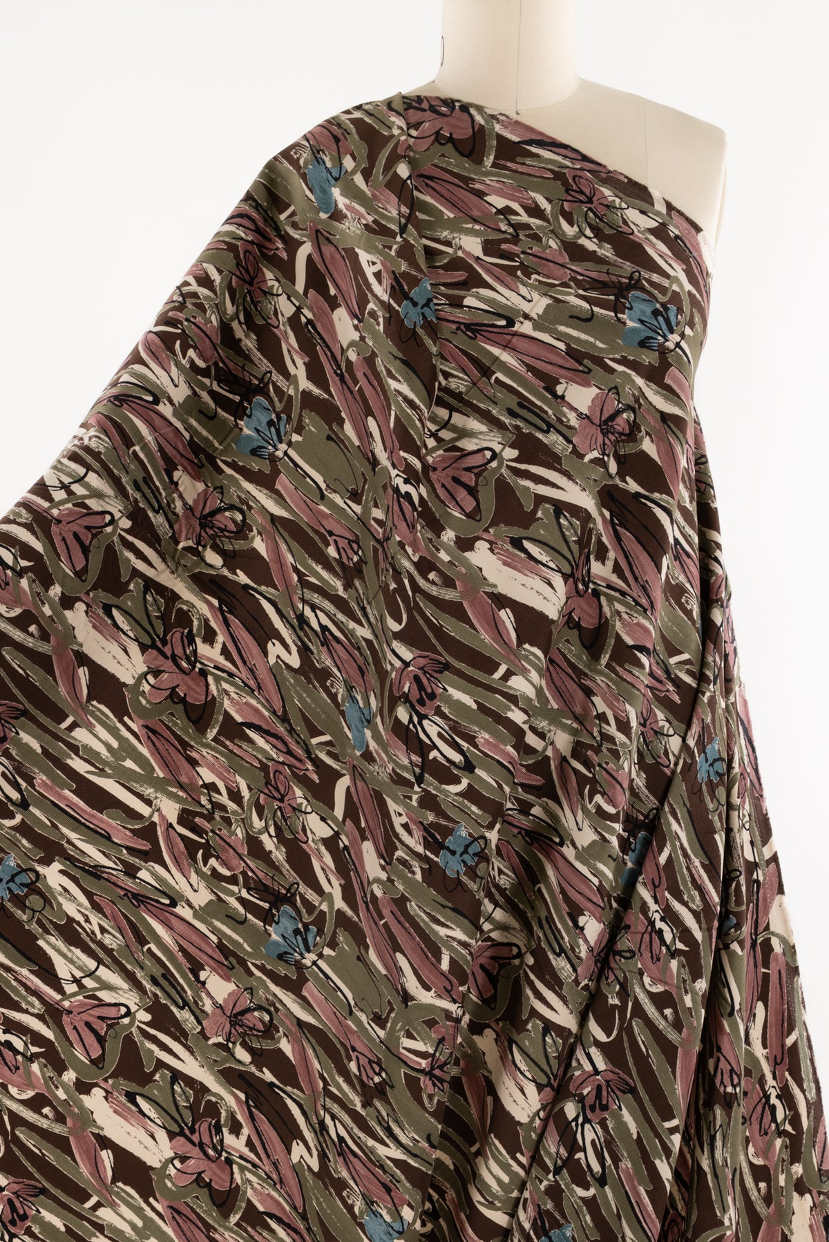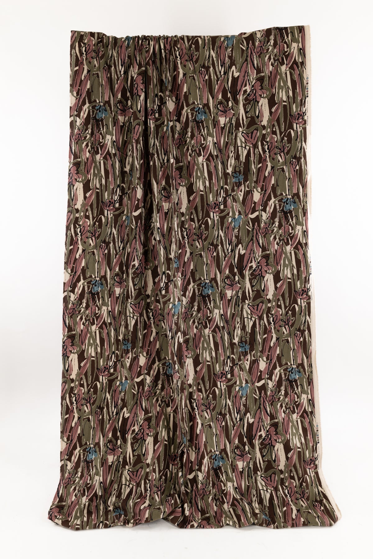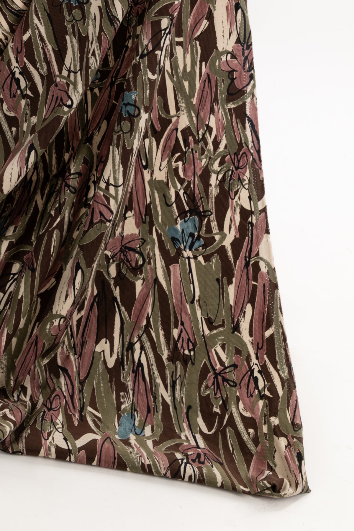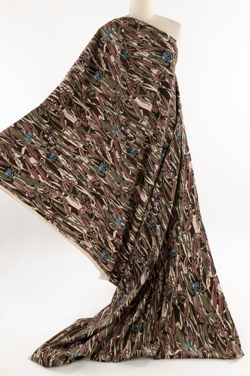 Hand-painted floral in brown, rose, olive, teal, and sand in a super fine wale buttery corduroy from a Japanese mill. Lightweight, with a deliciously soft hand and drape, smooth on the back side. Cut with the nap, 24" repeat. Lush, lovely, versatile, and just right for a jacket, vest, coat, shirt, skirt, pant, men's or children's wear, or accessories.