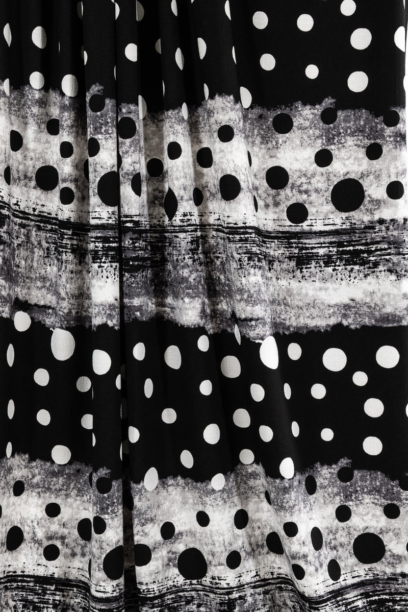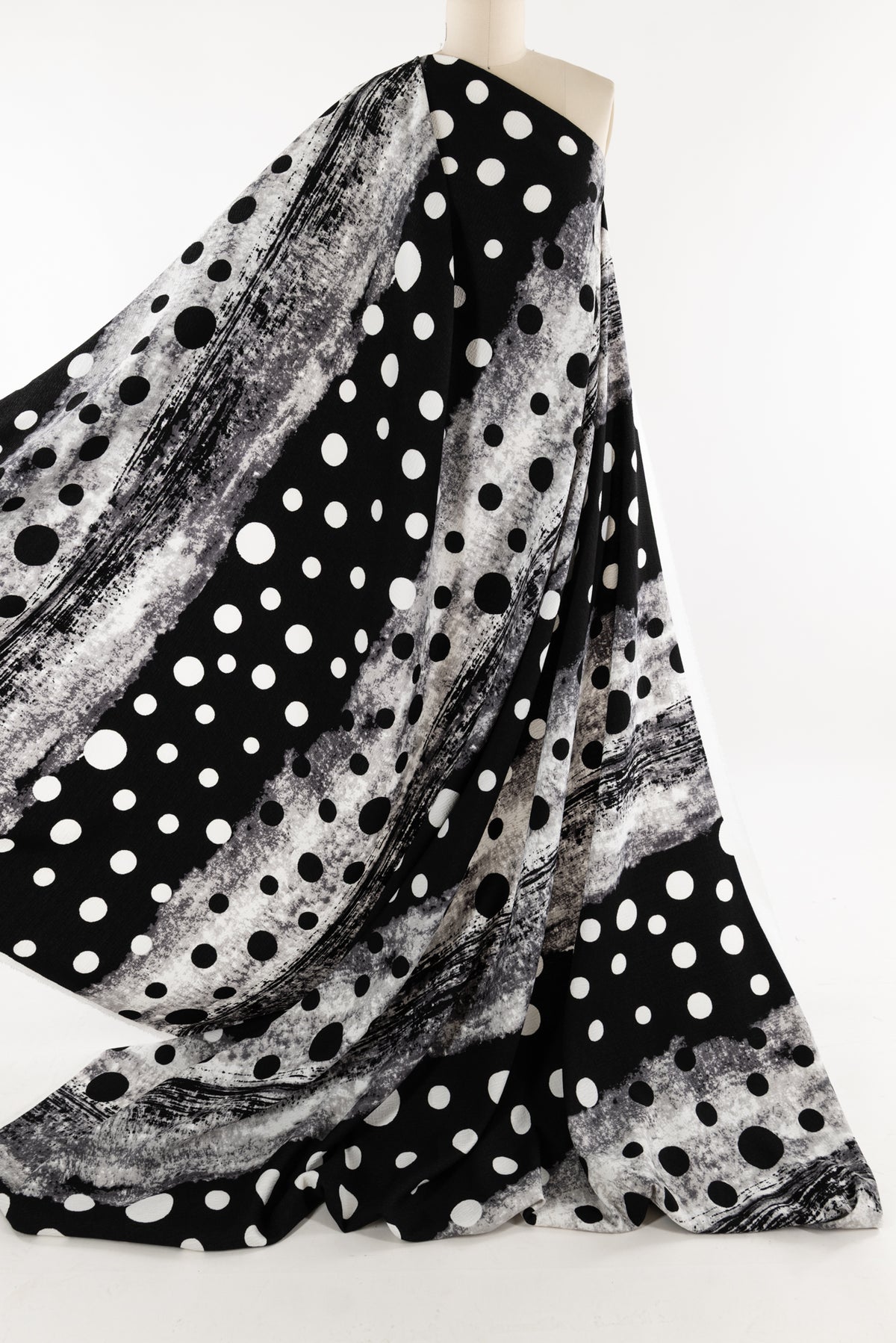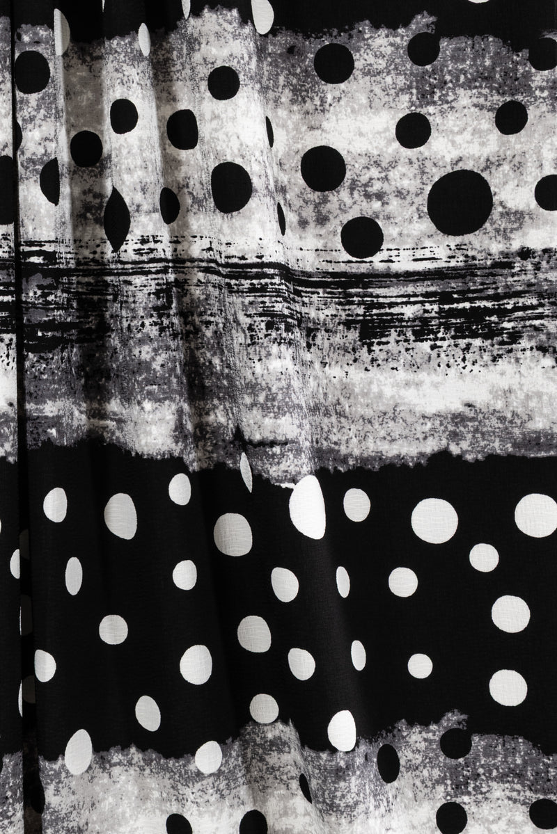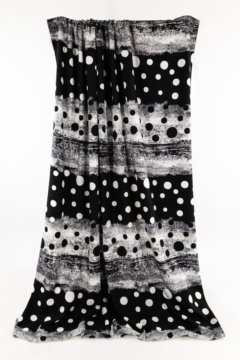 Bands of black and white dots, alternate with dappled sections on a fine poly blend woven. Elegant deadstock from an LA designer. Light/mid-weight with a lightly textured crepe hand, a 26" repeat, and soft drape. Right for a tunic, shirt, dress, light jacket or coat, cardi, kimono, caftan, or soft pant.