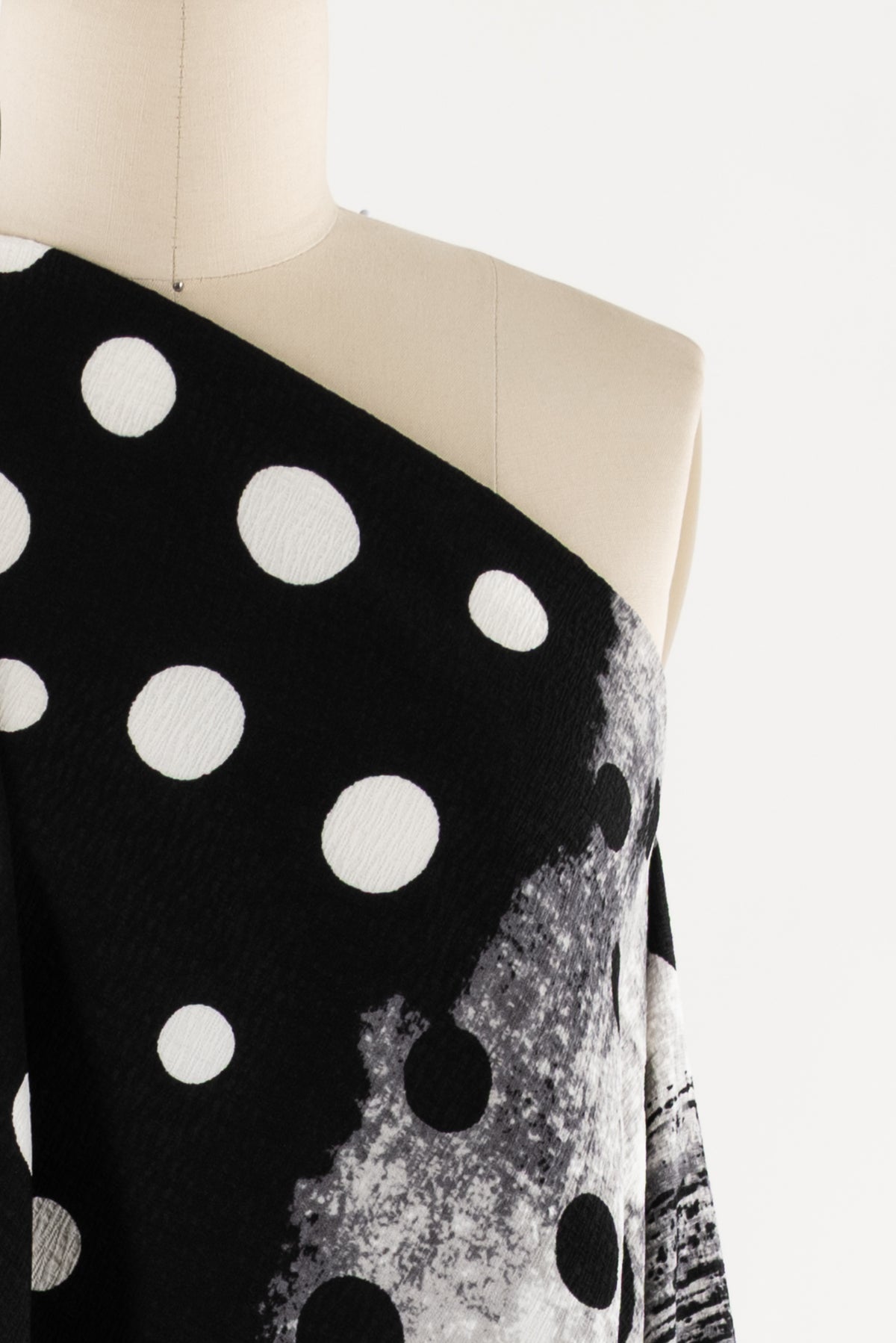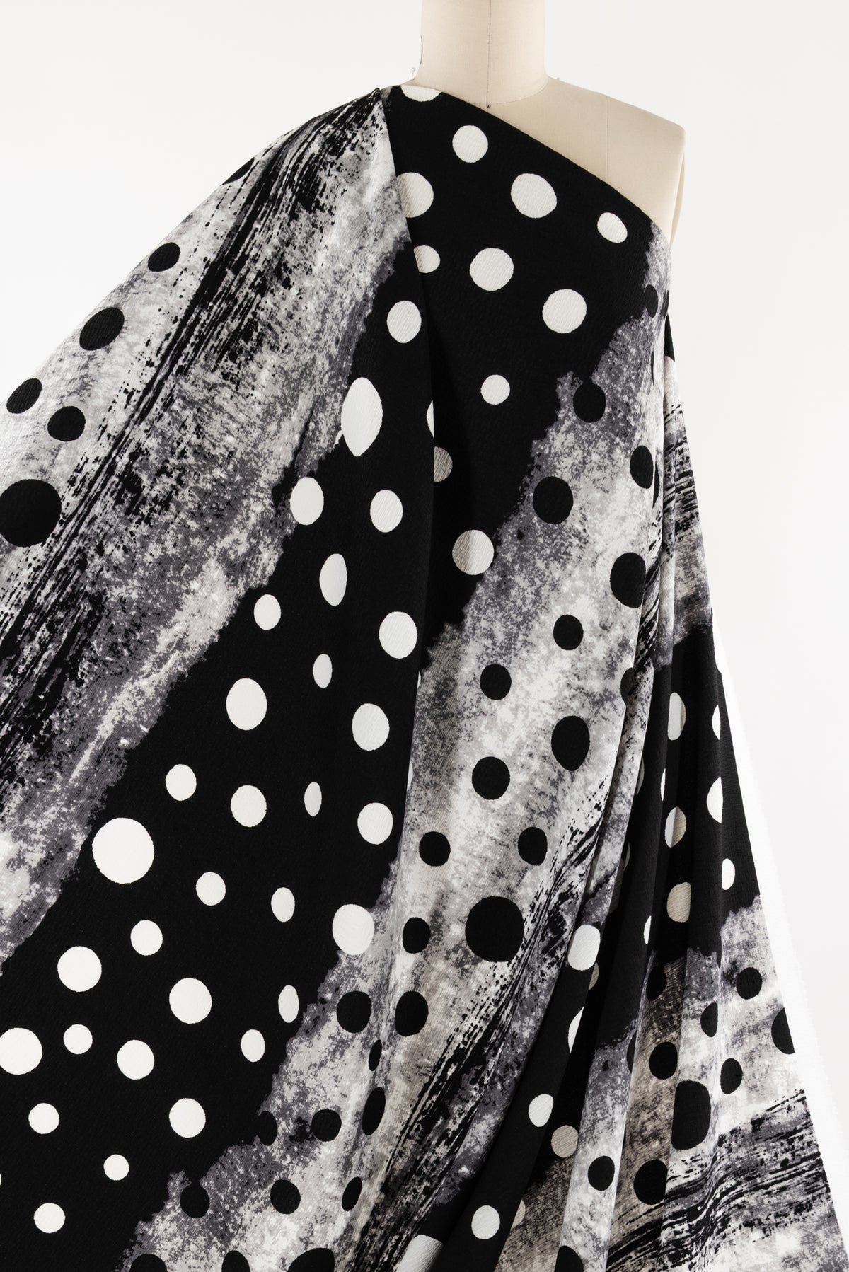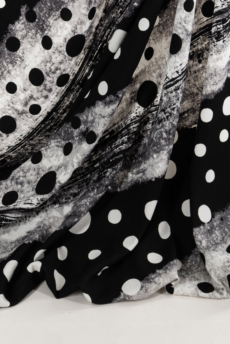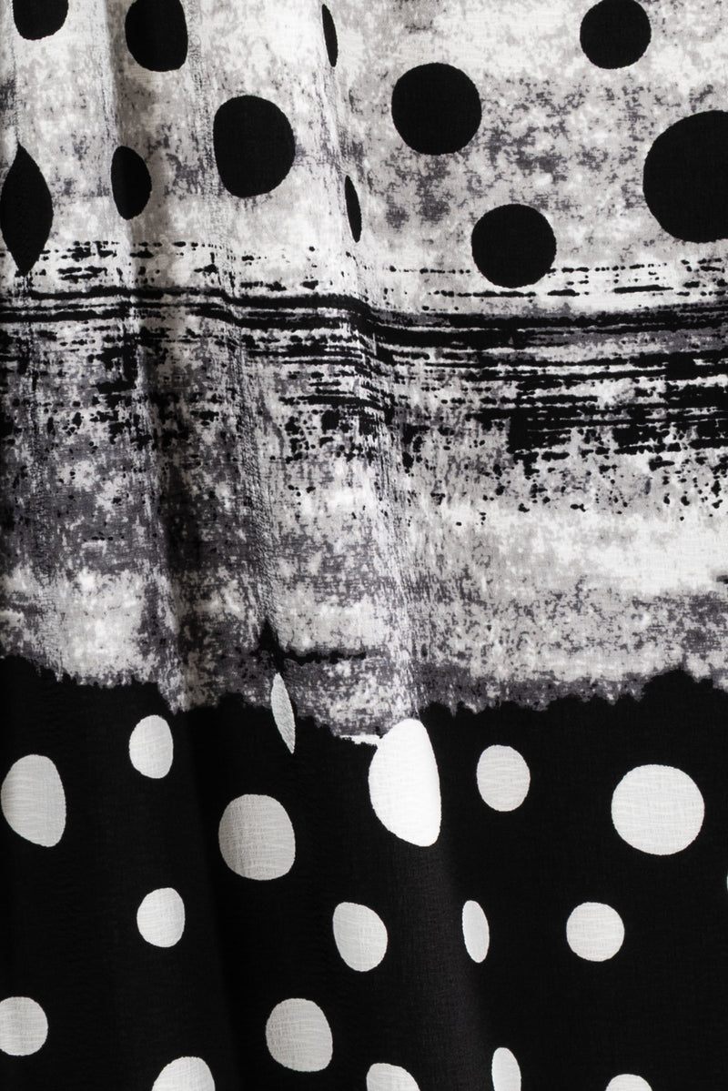 Bands of black and white dots, alternate with dappled sections on a fine poly blend woven. Elegant deadstock from an LA designer. Light/mid-weight with a lightly textured crepe hand, a 26" repeat, and soft drape. Right for a tunic, shirt, dress, light jacket or coat, cardi, kimono, caftan, or soft pant.