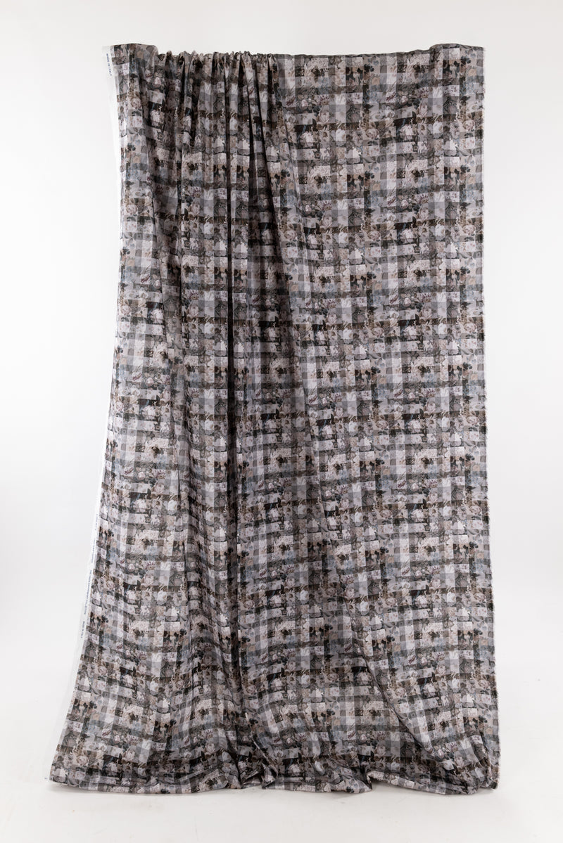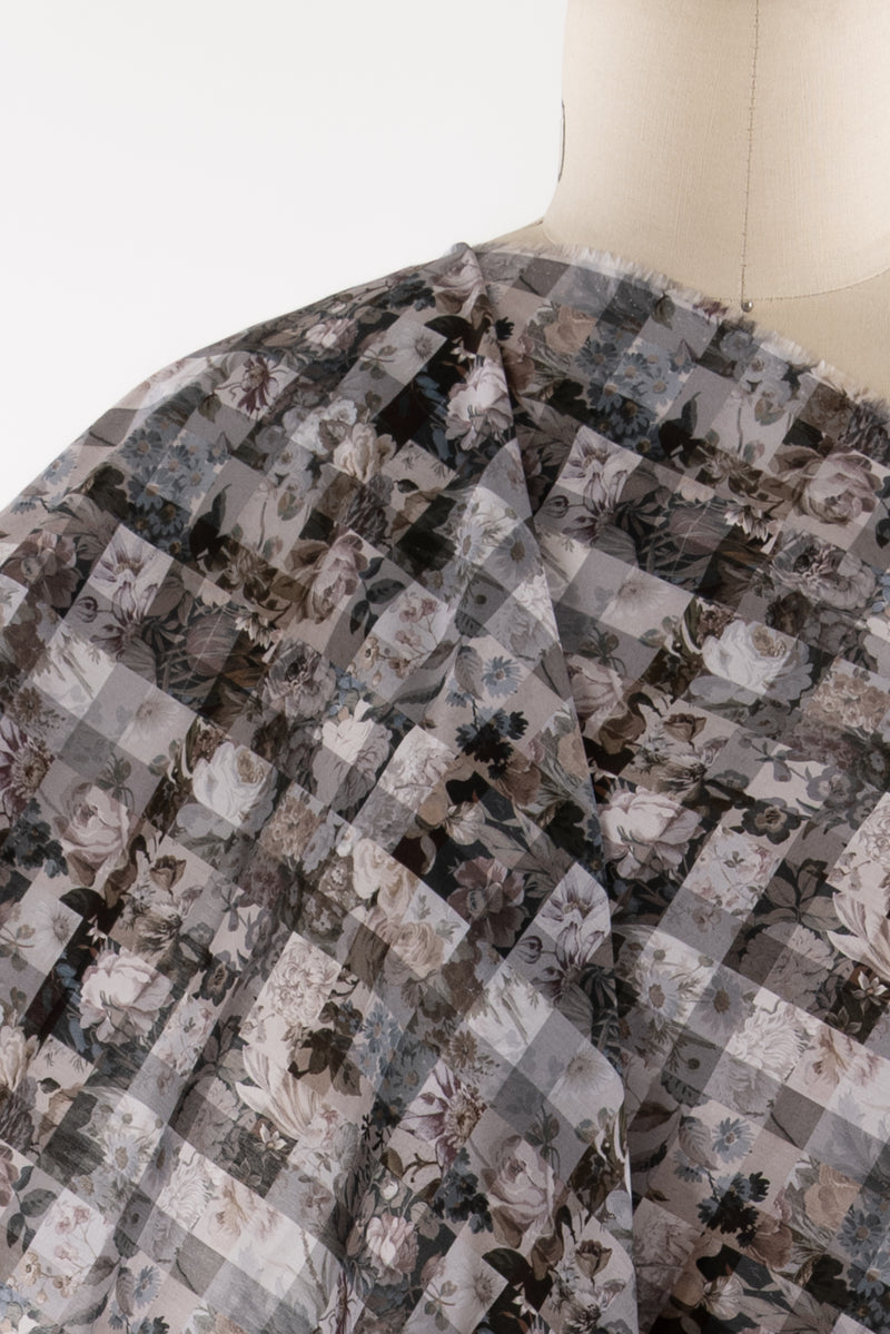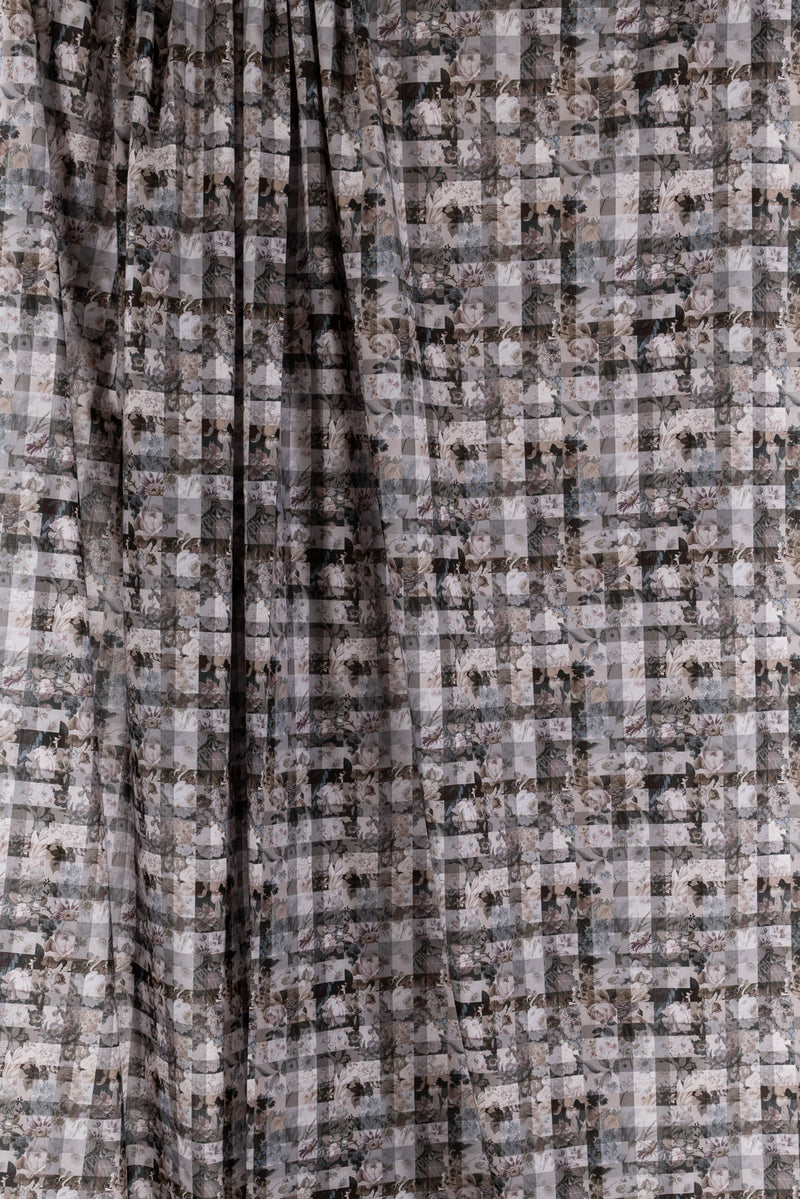 A contemporary transformation of vintage Liberty floral prints in shades of black and mocha, overlaid with a checked geometric grid, produced in Northern Italy for Liberty of London, printed on the renowned and exceptional Tana Lawn, the cotton that behaves and feels like silk. Fine-grained, with a cool, smooth, soft hand, fluid drape, and depth of color. Perfect for a shirt, dress, skirt, tunic, soft pant, caftan, loungewear, children's or men's clothes, accessories, or home decor. Right to wear everyday or for statement pieces. One-way design 8¼" repeat. OEKO-TEX® certified.