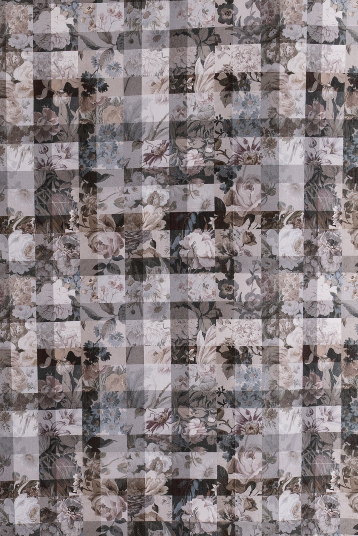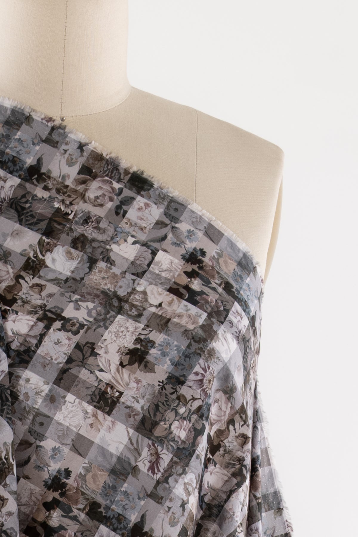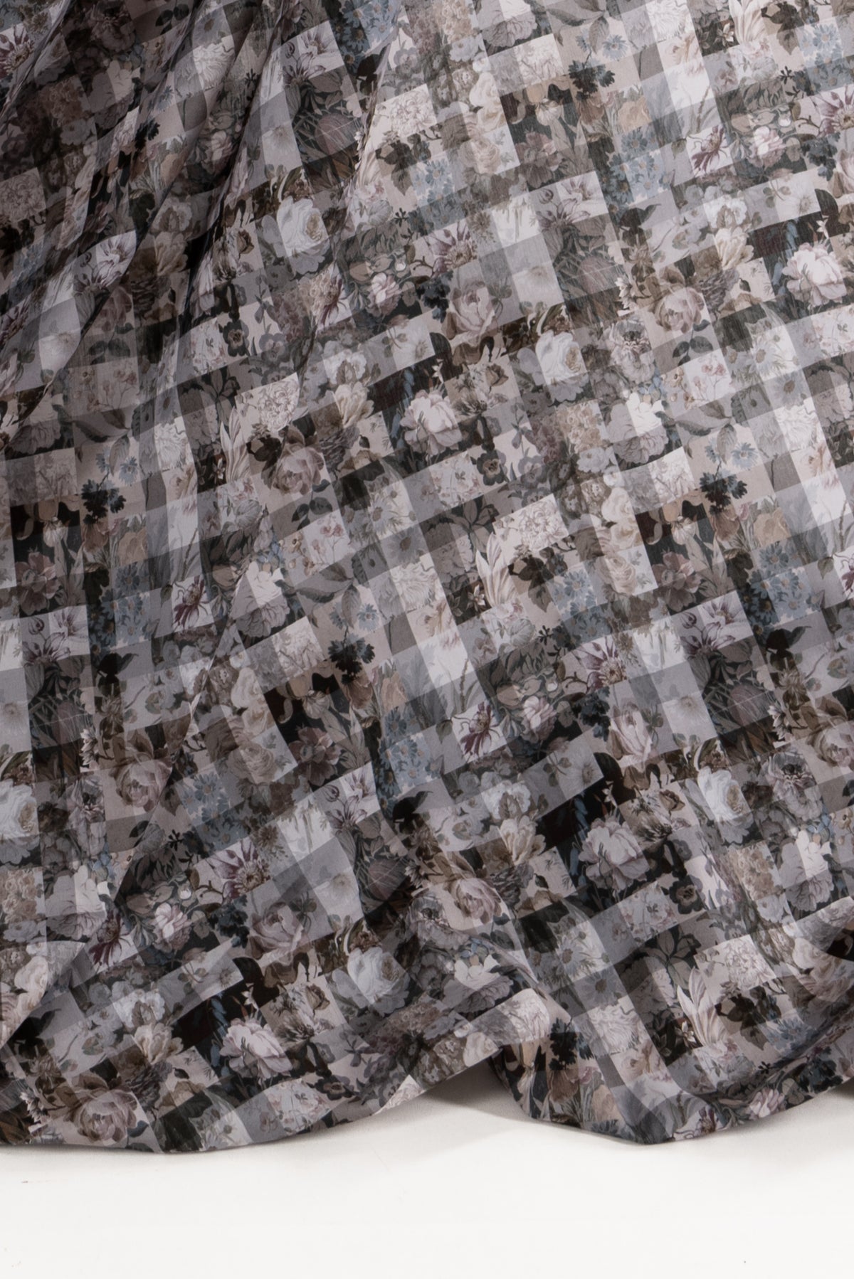 A contemporary transformation of vintage Liberty floral prints in shades of black and mocha, overlaid with a checked geometric grid, produced in Northern Italy for Liberty of London, printed on the renowned and exceptional Tana Lawn, the cotton that behaves and feels like silk. Fine-grained, with a cool, smooth, soft hand, fluid drape, and depth of color. Perfect for a shirt, dress, skirt, tunic, soft pant, caftan, loungewear, children's or men's clothes, accessories, or home decor. Right to wear everyday or for statement pieces. One-way design 8¼" repeat. OEKO-TEX® certified.