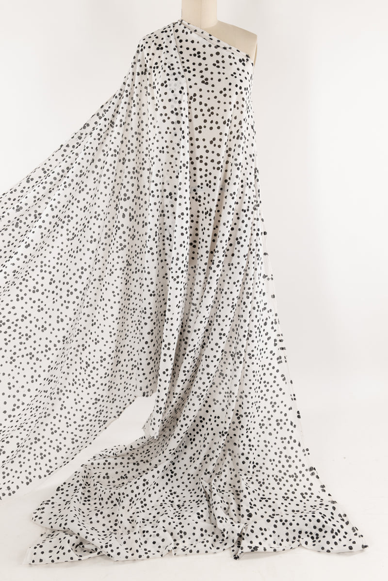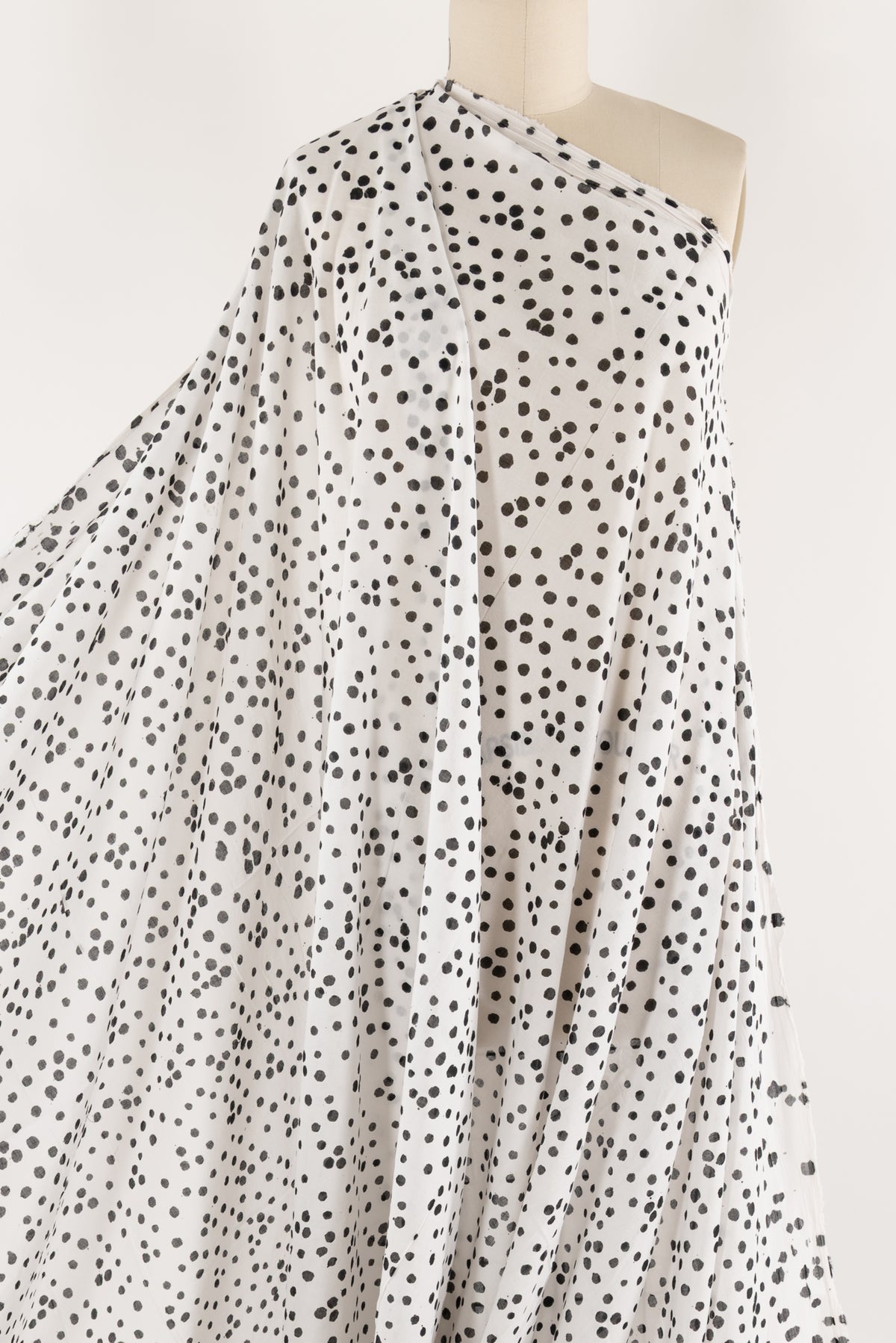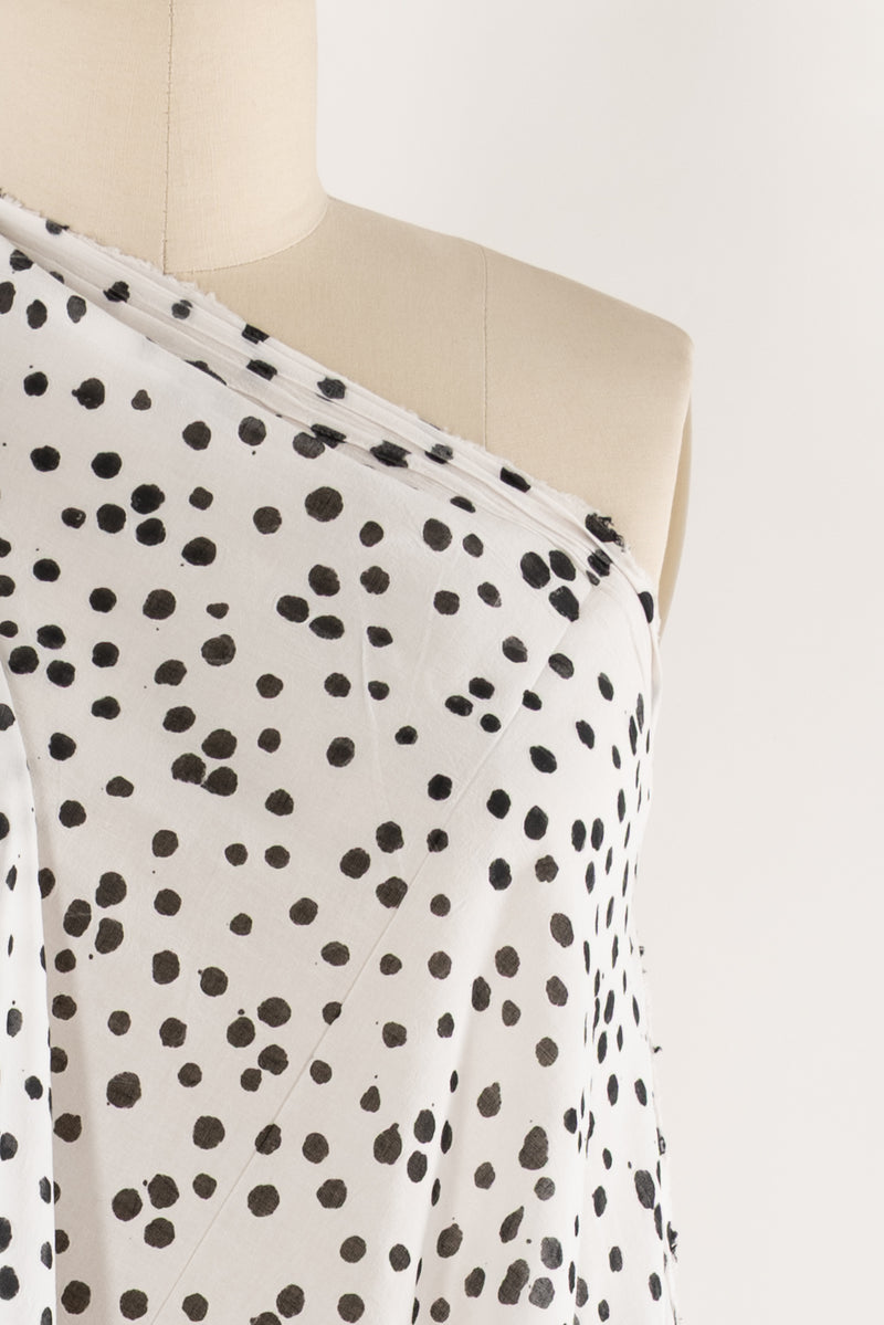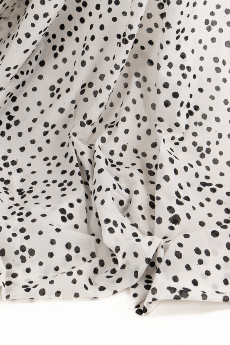 Beautiful quality lightweight cotton in white with all over hand-batiked soft black smallish dots. Softly textured, semi-opaque, with an appealing cool dry hand, light airy drape. The supple weight is right for a shirt, tunic, blouse, dress, skirt, soft pants, jumpsuit, kimono, caftan, men's, or children's. Also great for quilting, home dec, and crafting.
