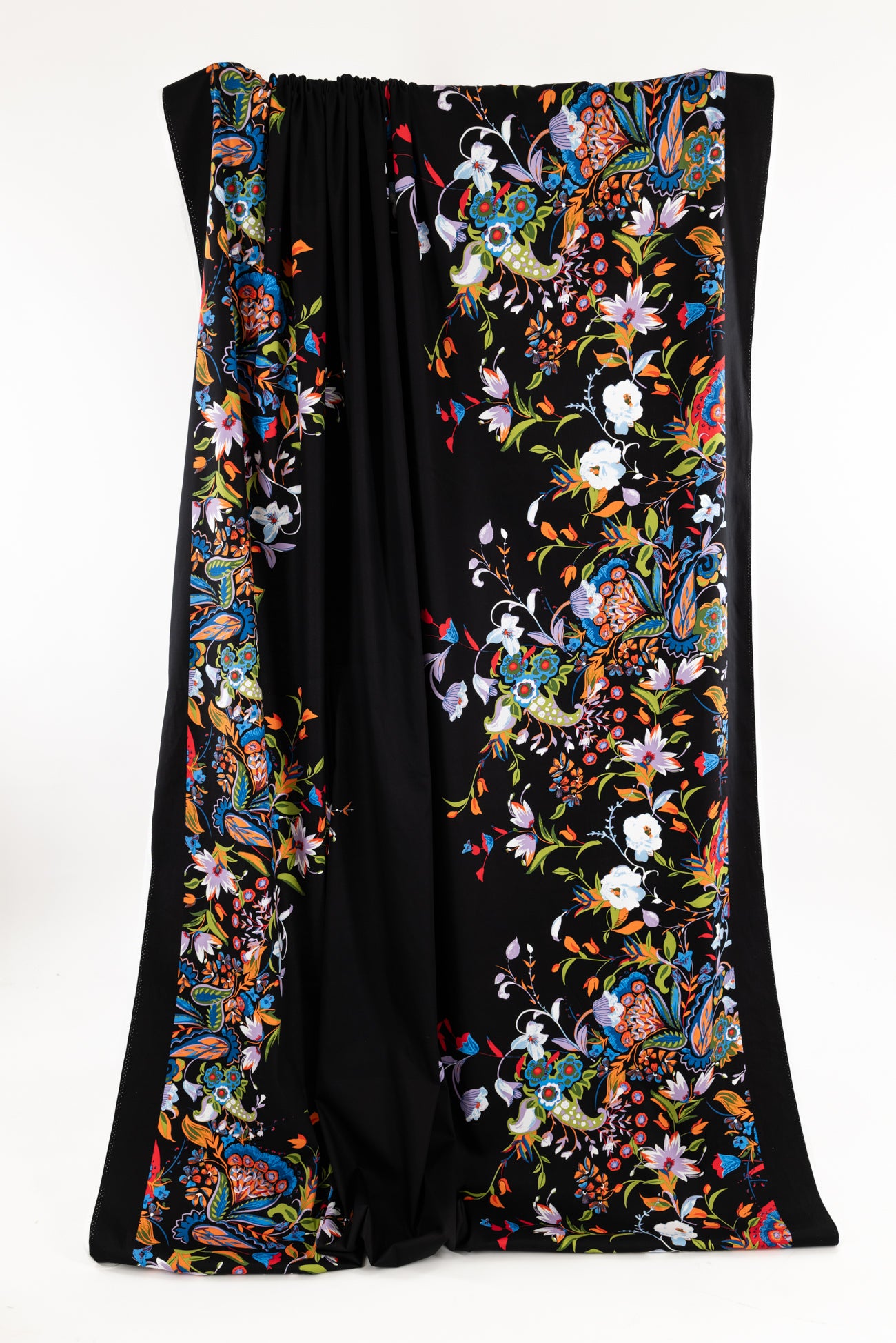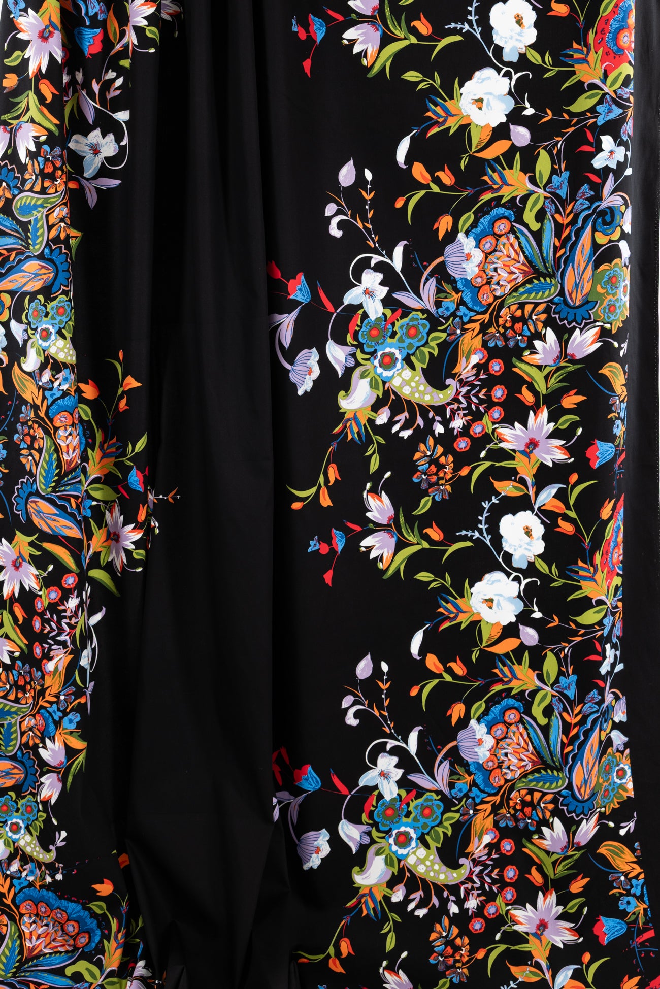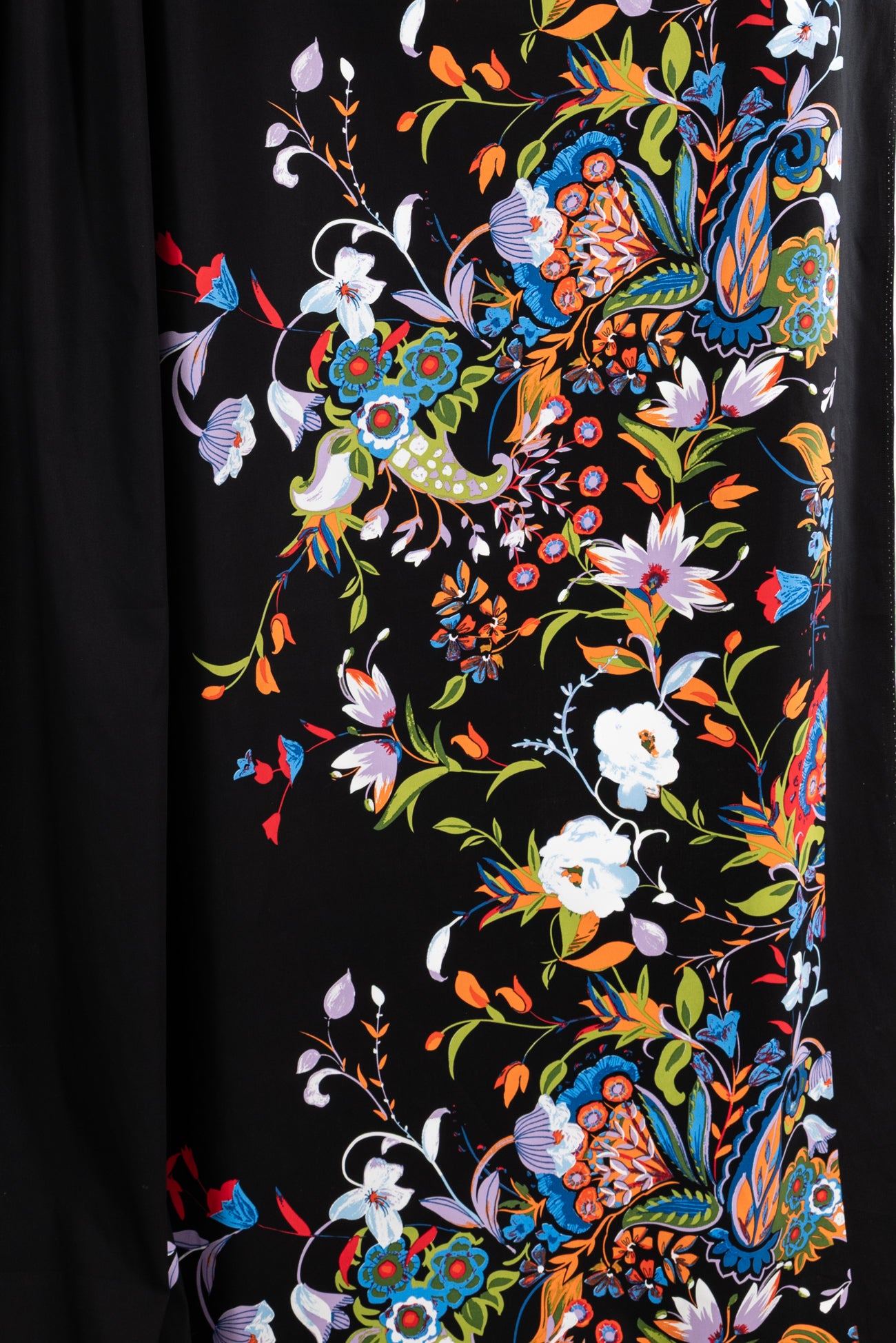 Striking floral in a kaleidoscope of color with a double border, printed on black, on cotton woven, deadstock from an LA designer. Light/mid-weight, opaque, with a cool soft hand, 24½" repeat and soft drape. One border is 26" wide, the other is 17½", with 2" of black along each selvedge. Right for a dress, shirt, blouse, tunic, skirt, caftan, kimono, loungewear or children's clothes.