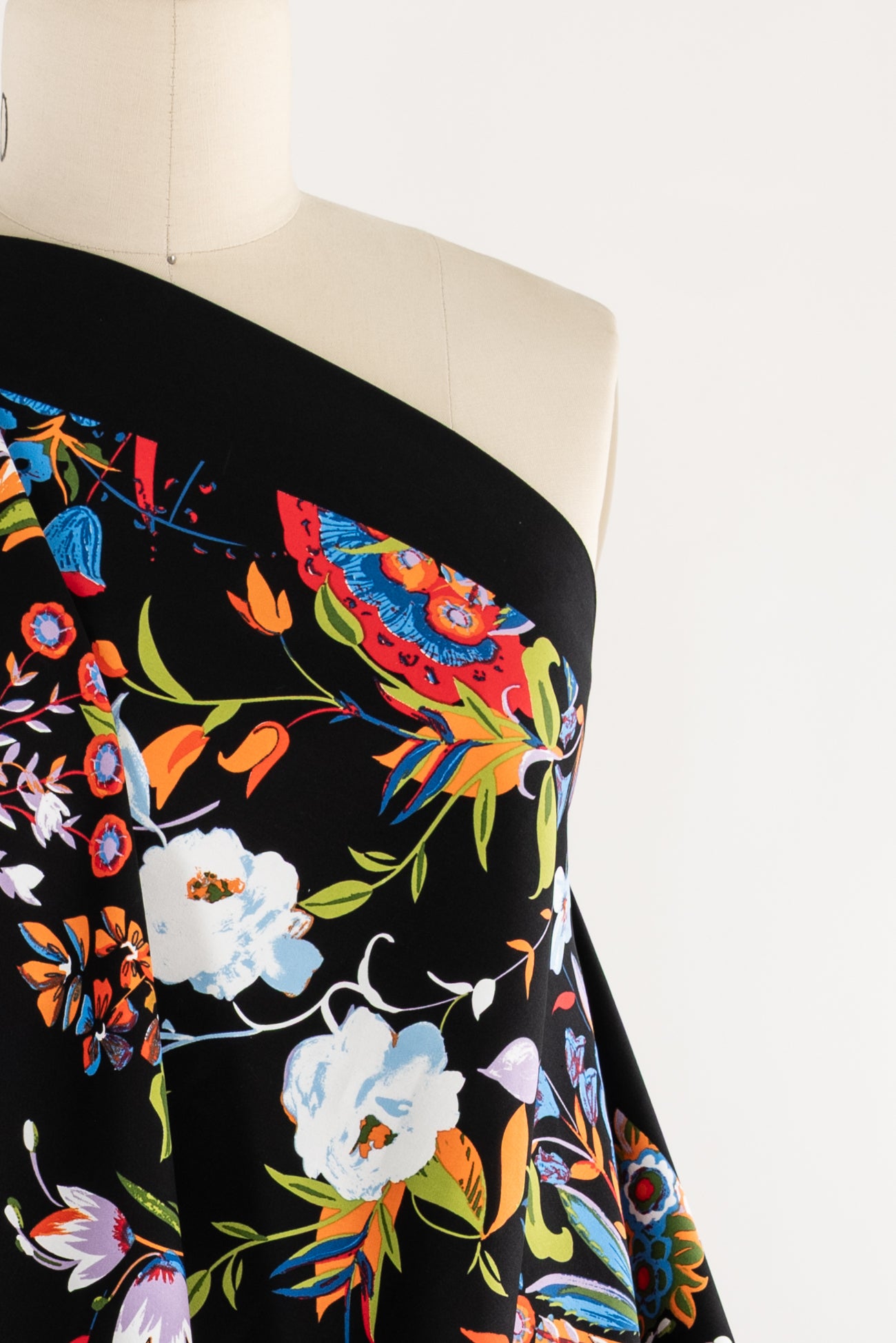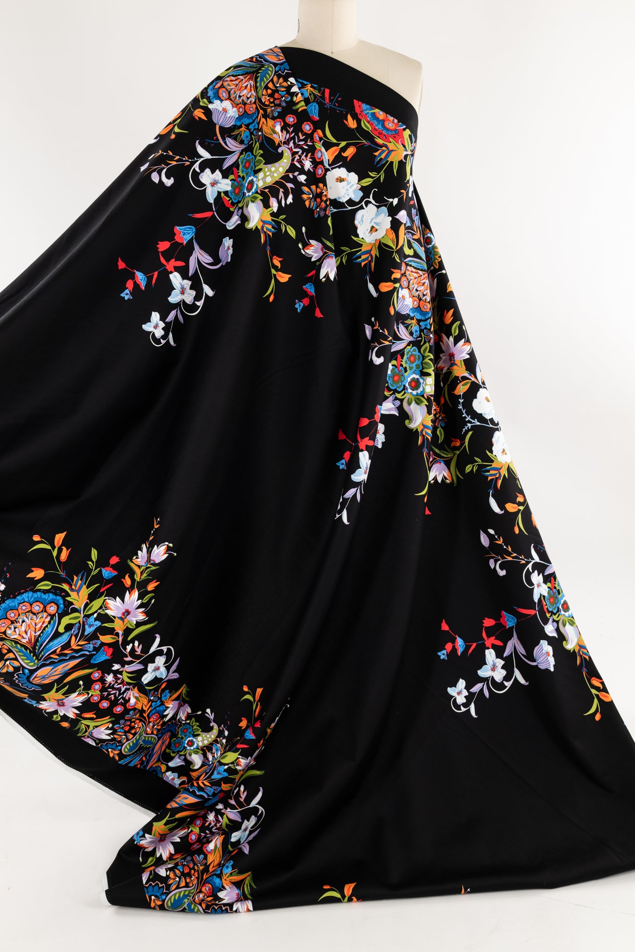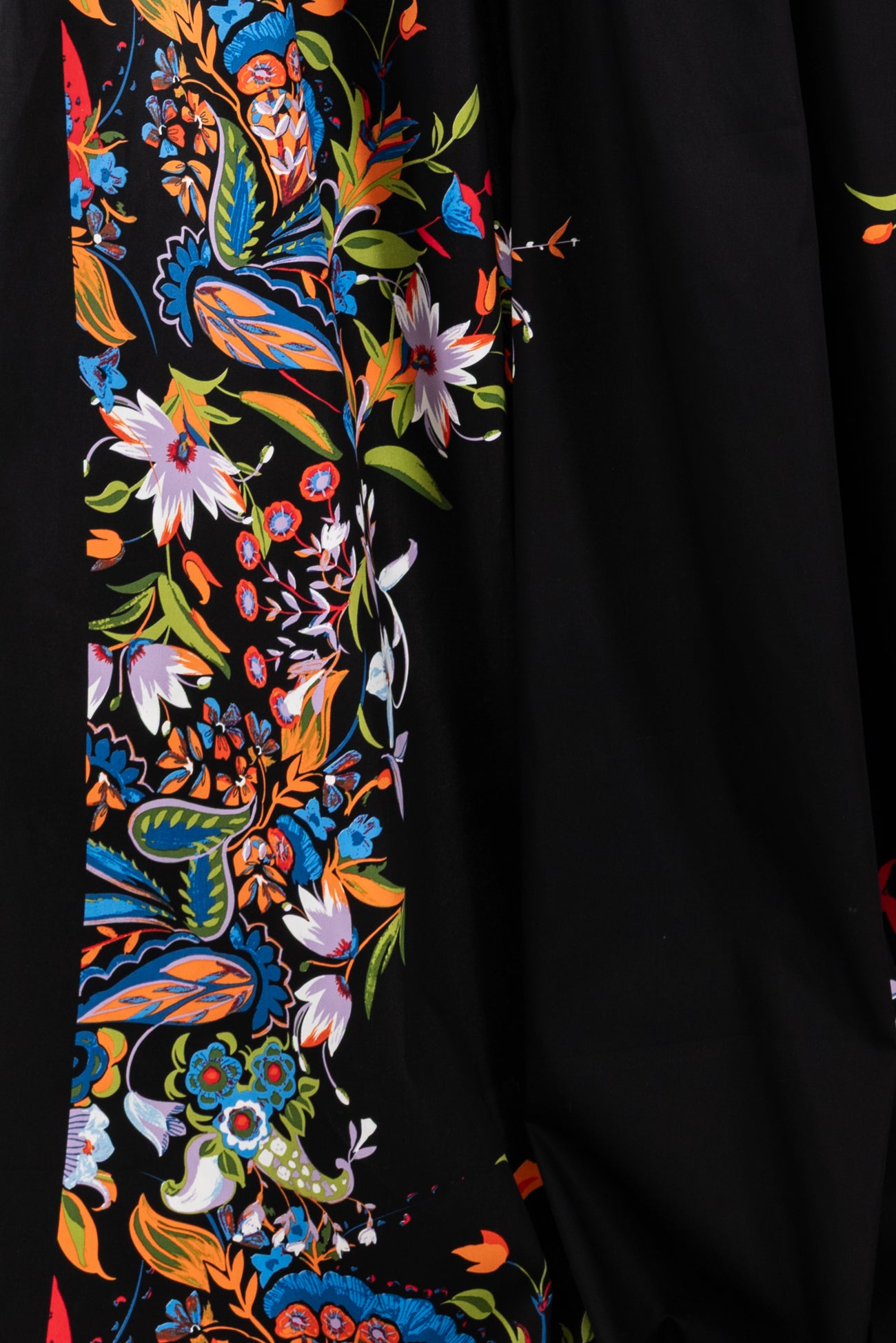 Striking floral in a kaleidoscope of color with a double border, printed on black, on cotton woven, deadstock from an LA designer. Light/mid-weight, opaque, with a cool soft hand, 24½" repeat and soft drape. One border is 26" wide, the other is 17½", with 2" of black along each selvedge. Right for a dress, shirt, blouse, tunic, skirt, caftan, kimono, loungewear or children's clothes.