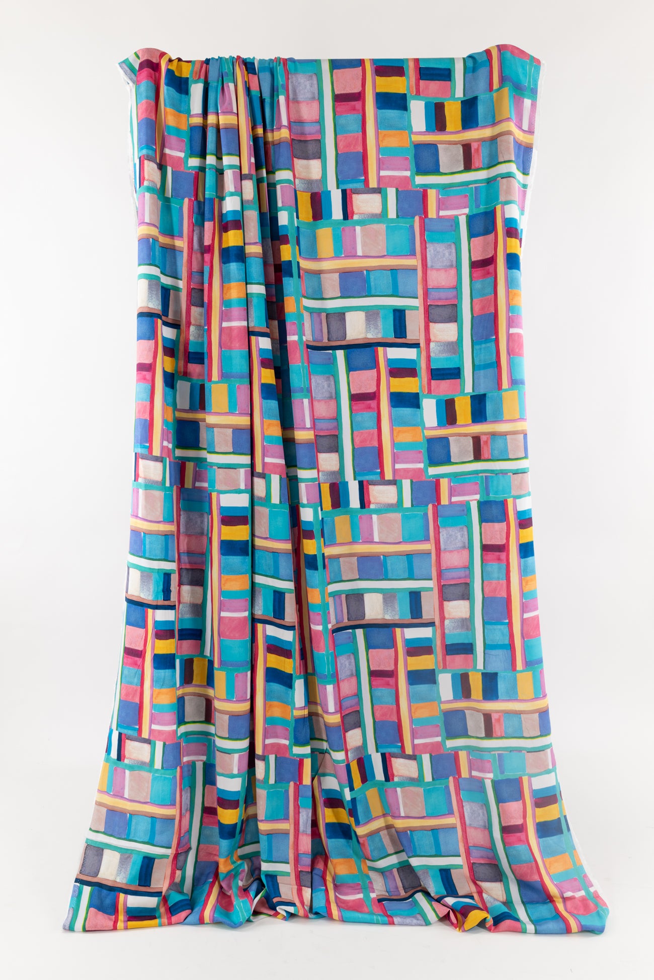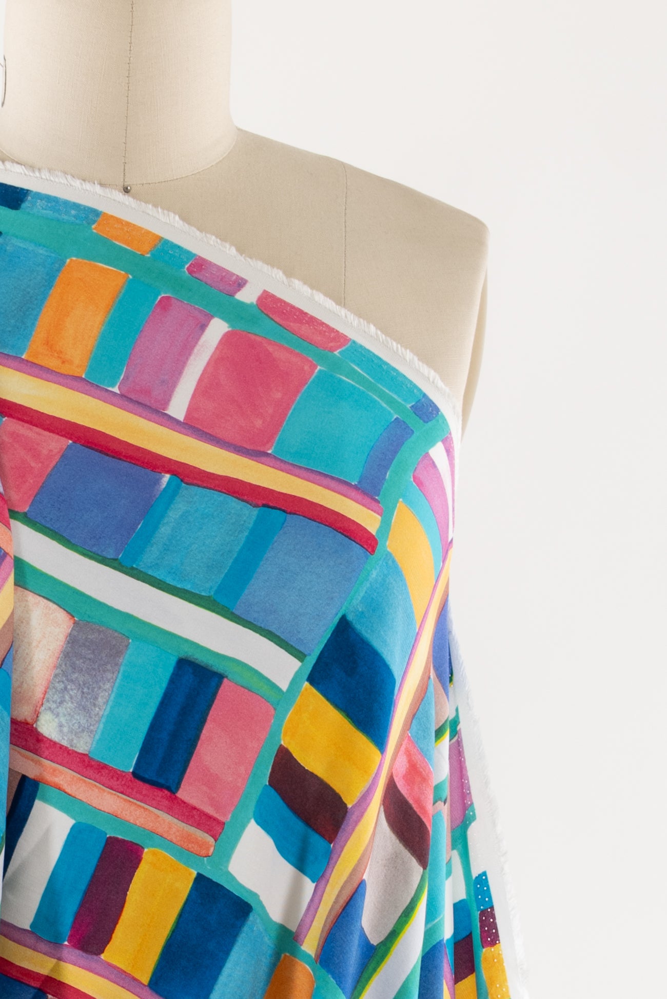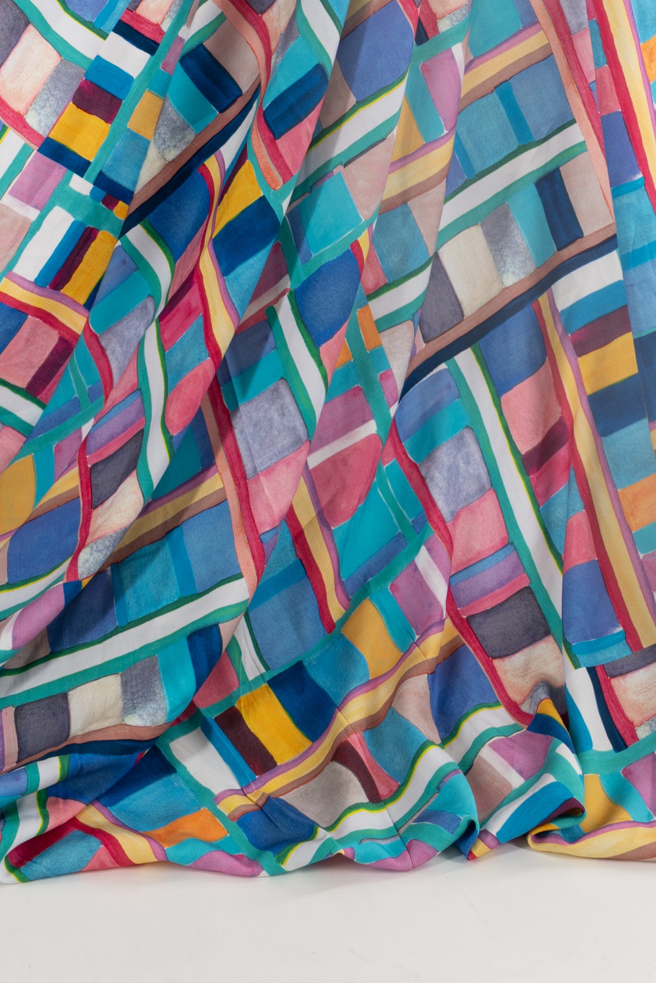 Dramatic, painterly, rainbow-hued geometric, digitally printed on a supple fine-grained rayon. Lightweight, opaque, with a smooth, cool, dry hand, and fluid liquid drape. Right for a dress, blouse, tunic, skirt, soft pant, jumpsuit, caftan, kimono, children's, and men's clothes. One way design, 22" repeat. OEKO-TEX certified.