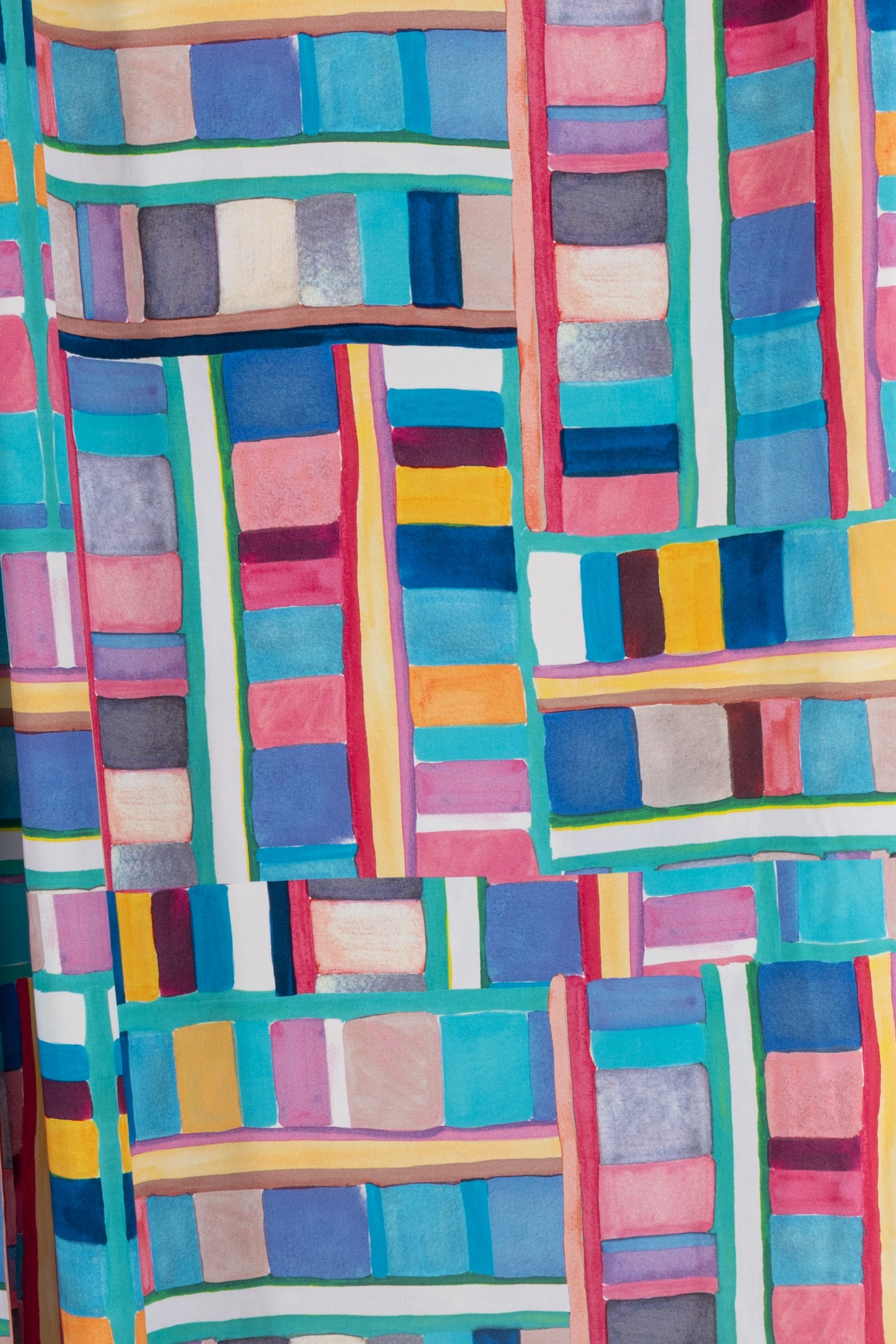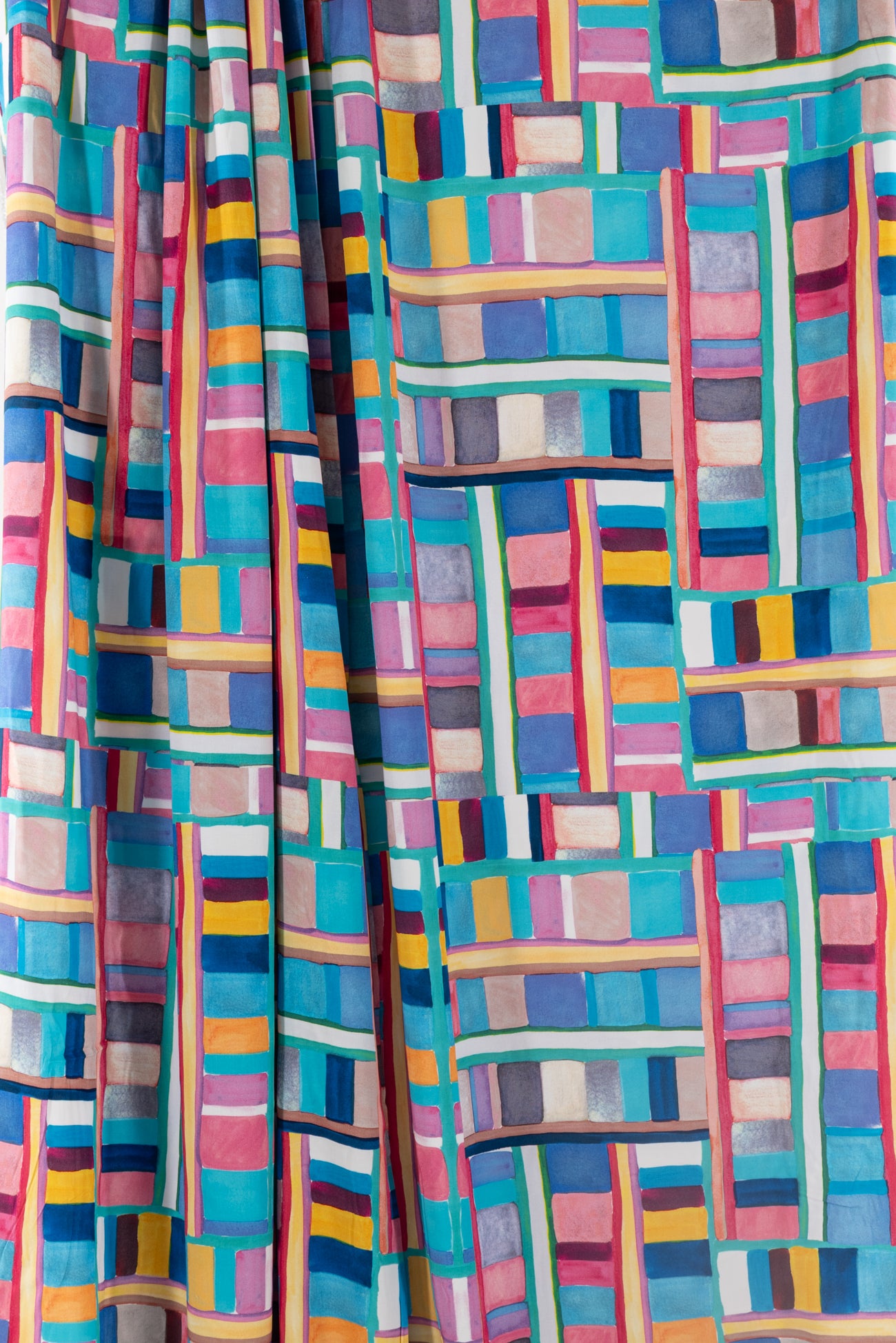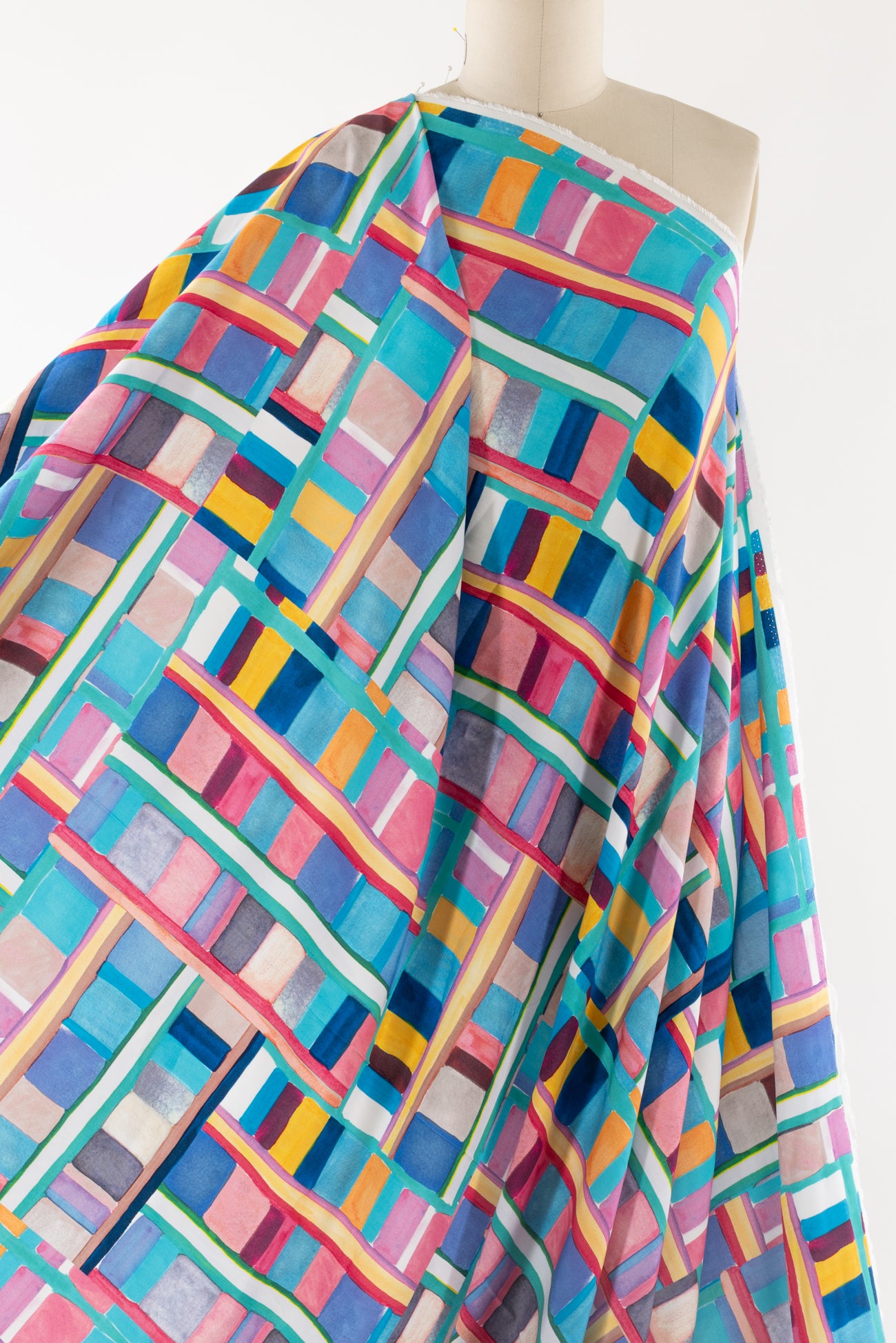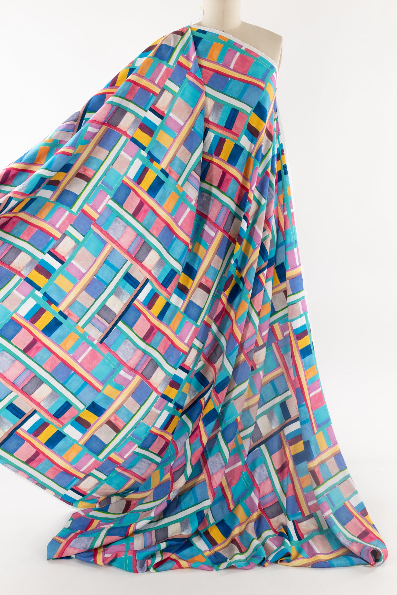 Dramatic, painterly, rainbow-hued geometric, digitally printed on a supple fine-grained rayon. Lightweight, opaque, with a smooth, cool, dry hand, and fluid liquid drape. Right for a dress, blouse, tunic, skirt, soft pant, jumpsuit, caftan, kimono, children's, and men's clothes. One way design, 22" repeat. OEKO-TEX certified.