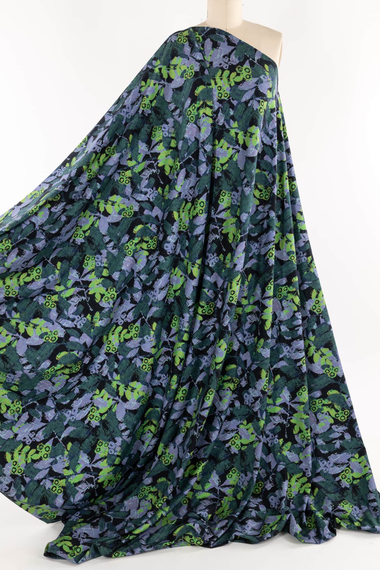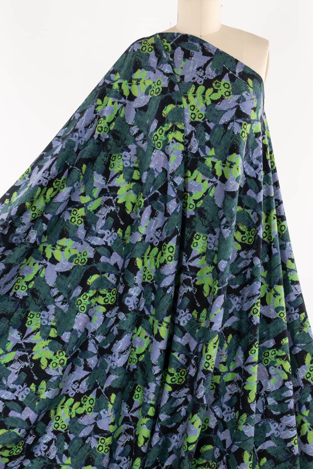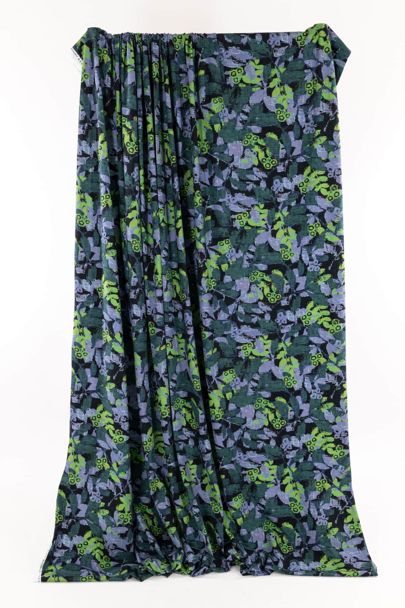 Charming contemporary floral in shades of blue, lavender, and green with touches of black in a digital print on an impeccable European quality cotton/spandex jersey knit, from Denmark. Light/mid-weight, opaque, and will skim the body in a flattering way. It has a soft, smooth texture, fluid drape, 4-way stretch, a 15¾" repeat, and some rolling at the cut edge. Right for a t-shirt, tunic, dress, soft pants, leggings, cardigan, skirt, or loungewear, as well as children's or men's clothing. Oeko-Tex® certified.
