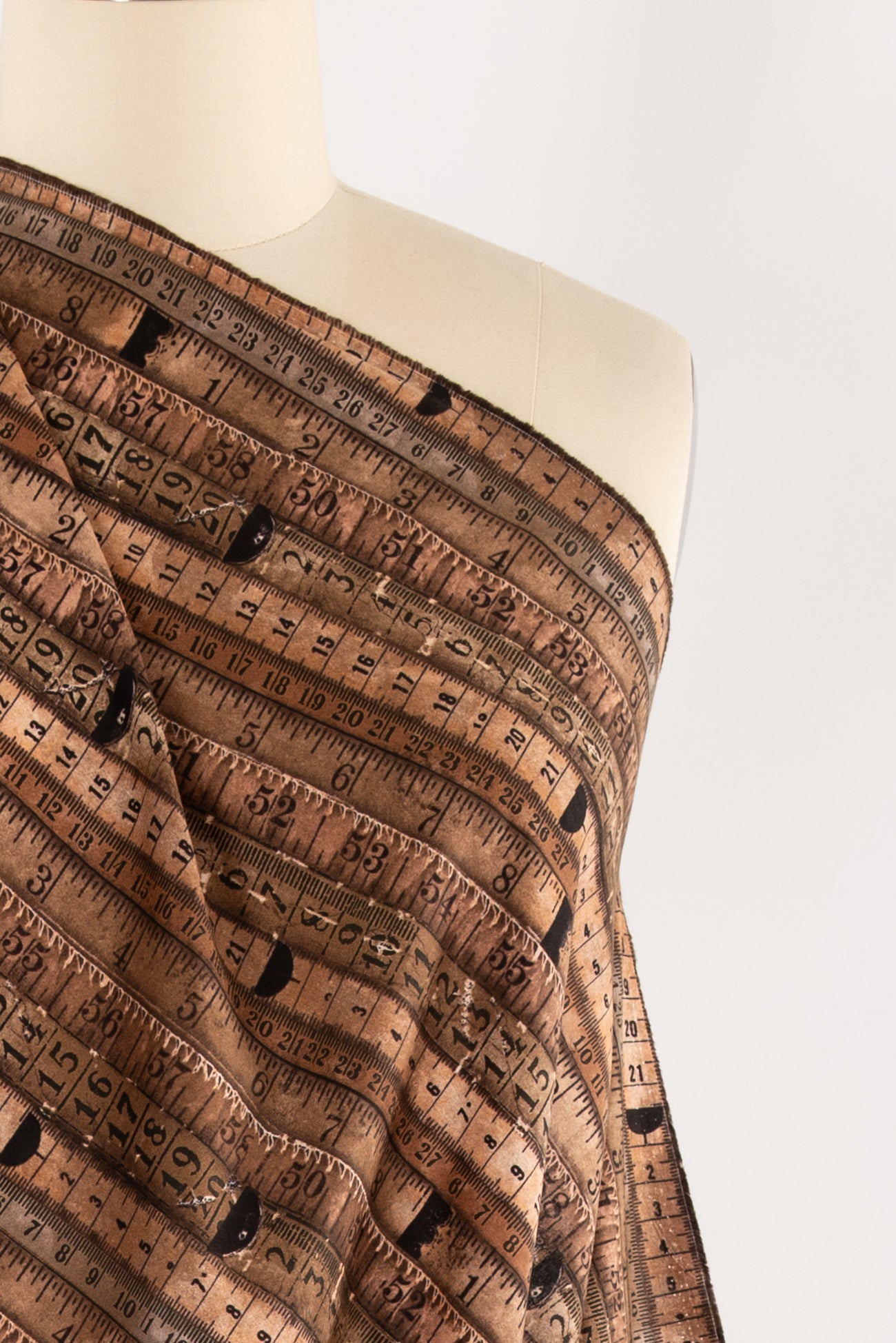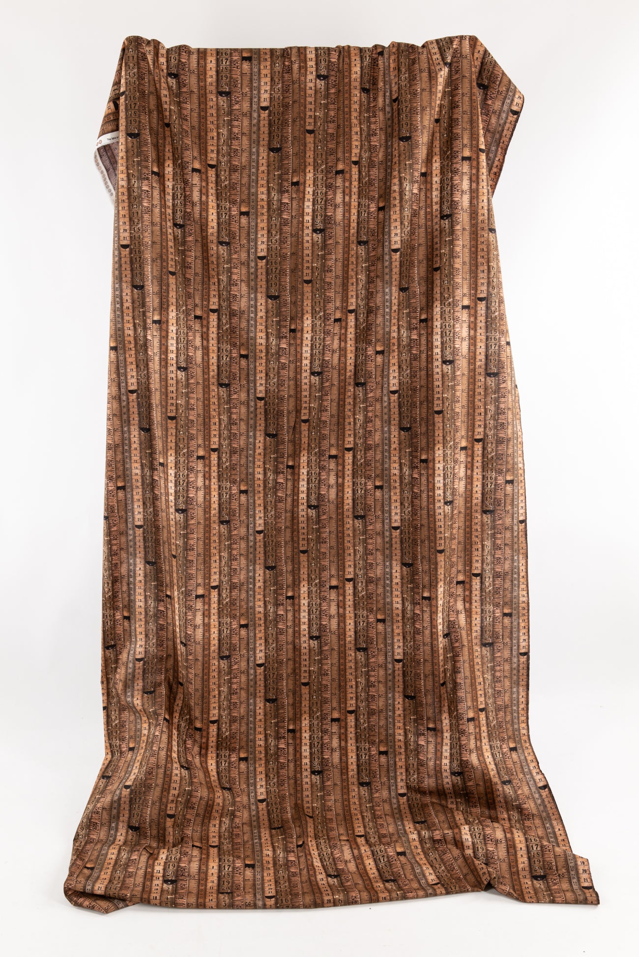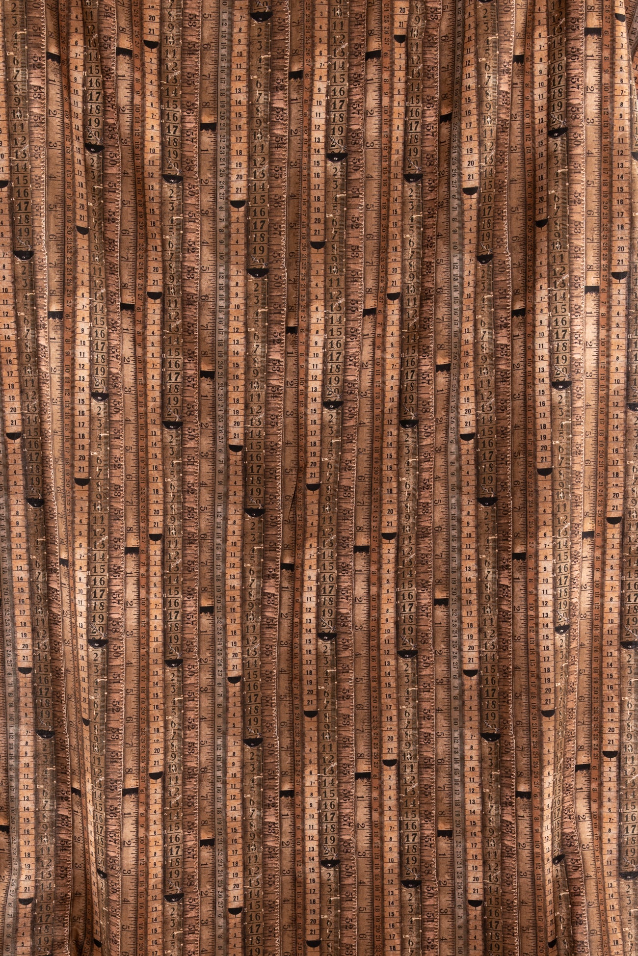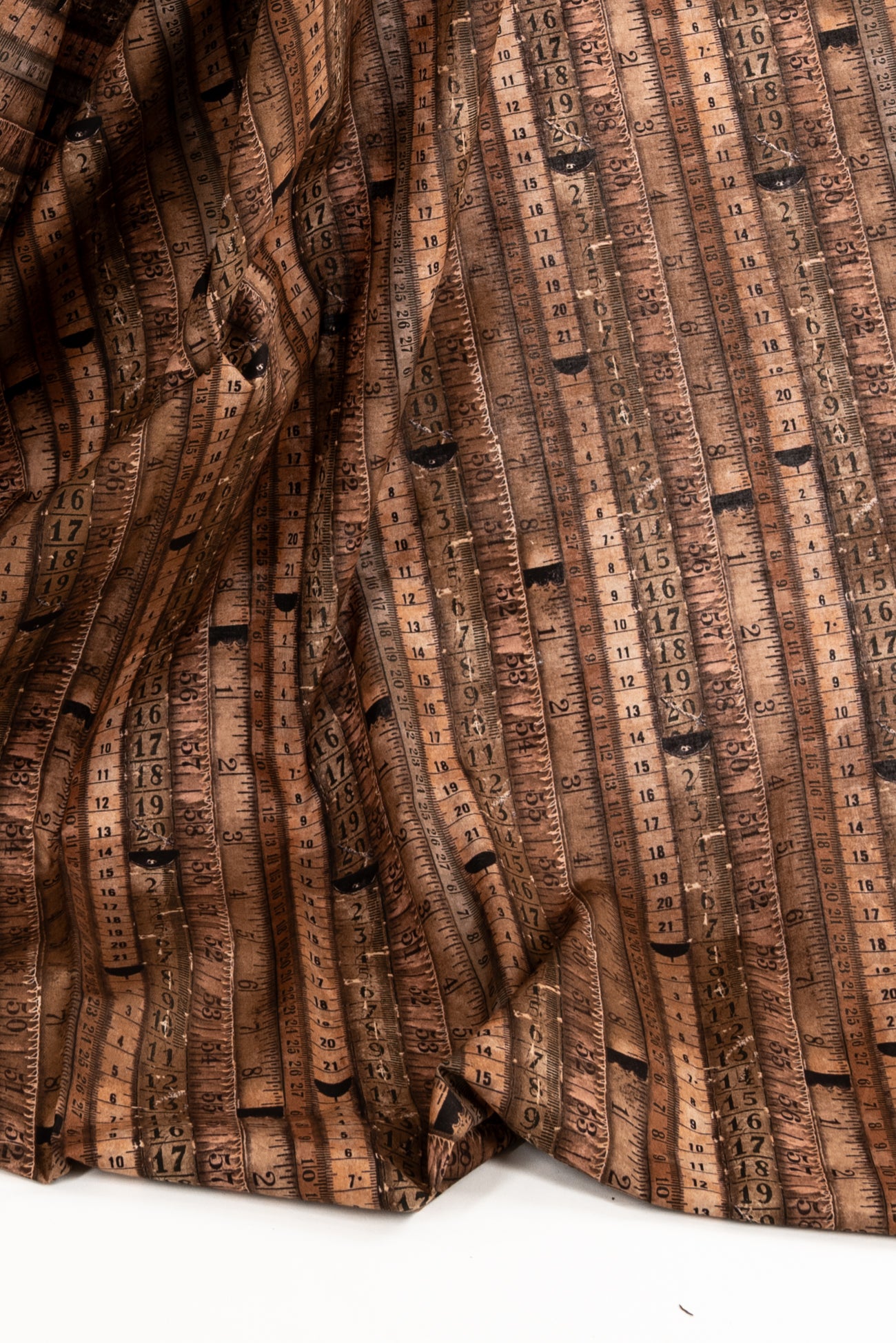 A variety of vertical tailor's tapes printed in antiqued woody tones accented with black, on a fine-grained cotton woven. Lightweight, opaque with a smooth matte hand, a 11¾" repeat and light drape. Right for a dress, shirt, skirt, tunic, top, soft pant, caftan, kimono, loungewear, men's or children's.
