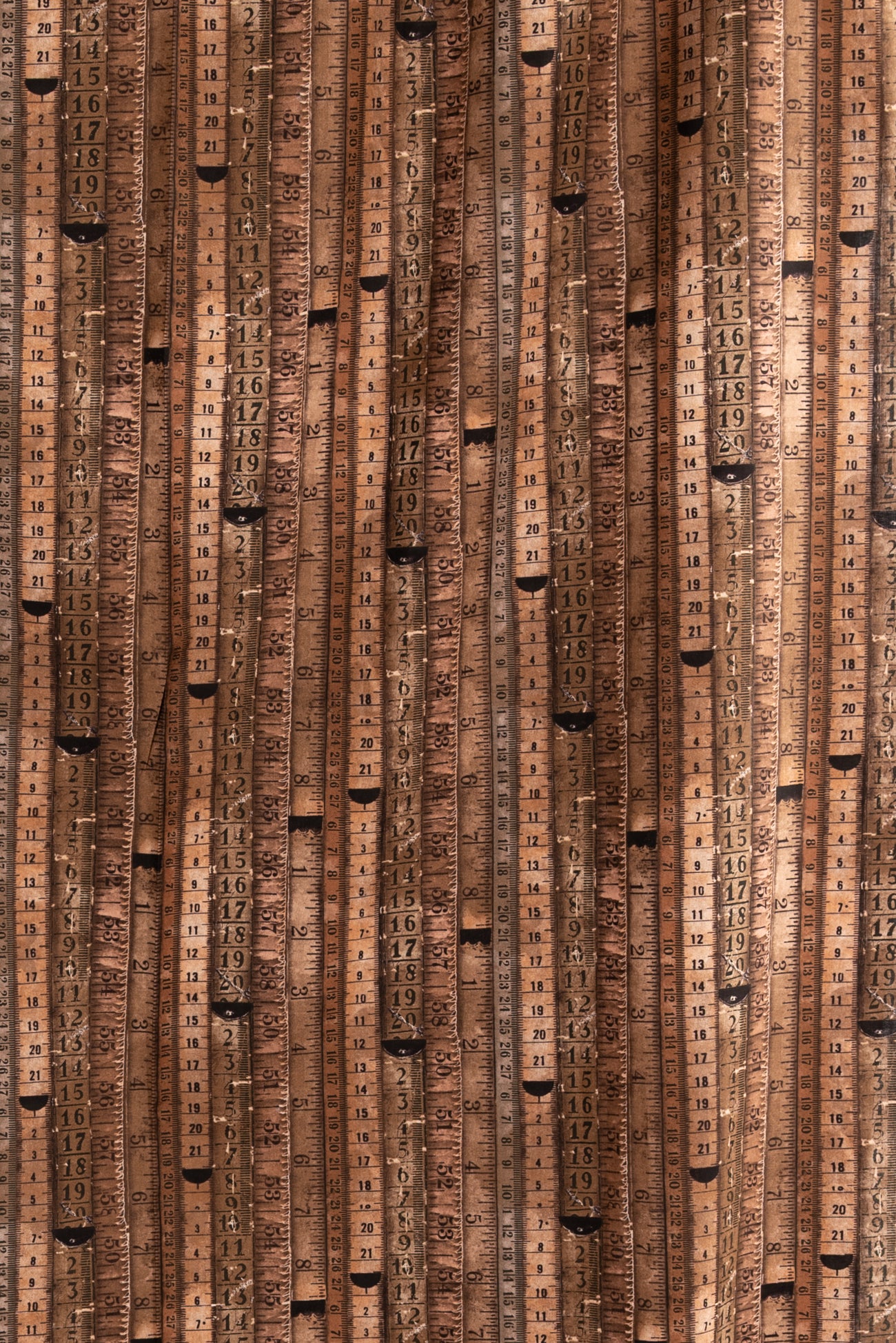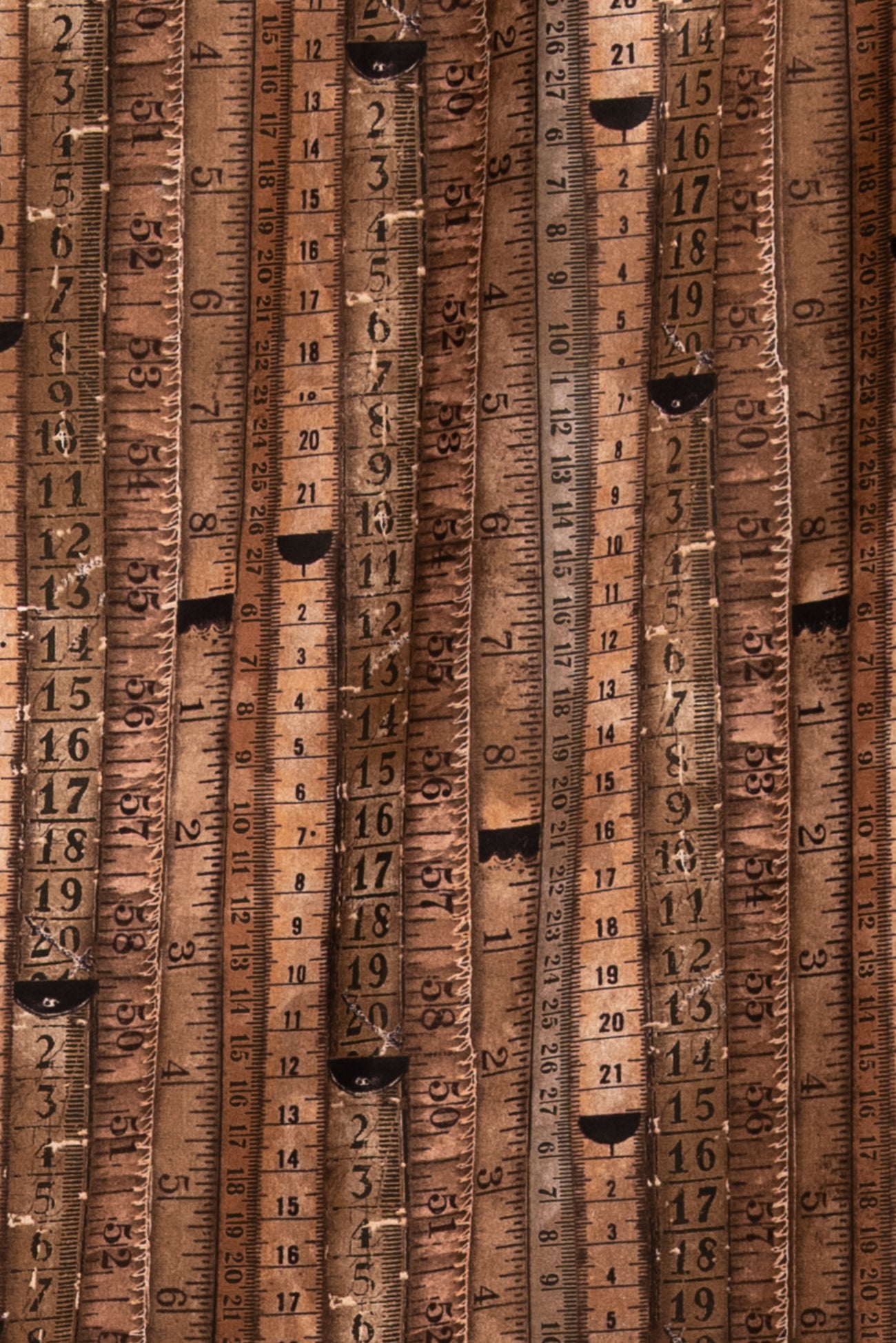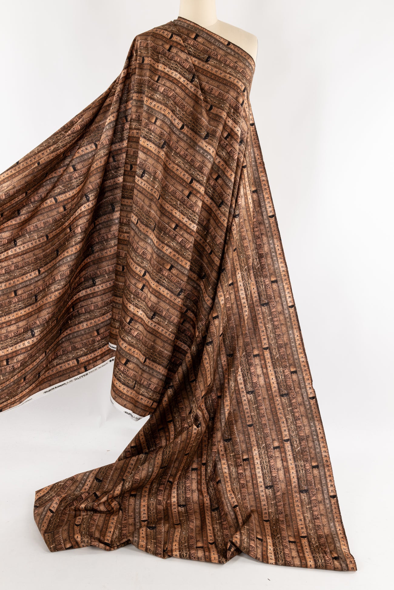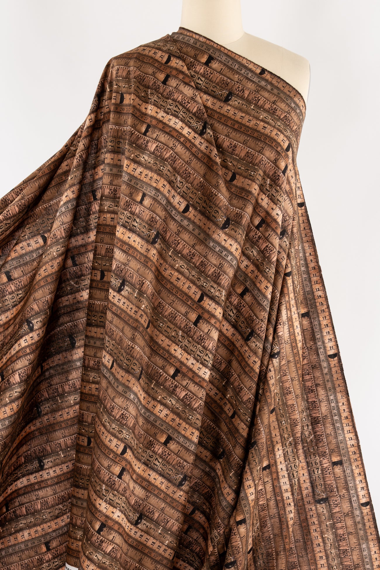A variety of vertical tailor's tapes printed in antiqued woody tones accented with black, on a fine-grained cotton woven. Lightweight, opaque with a smooth matte hand, a 11¾" repeat and light drape. Right for a dress, shirt, skirt, tunic, top, soft pant, caftan, kimono, loungewear, men's or children's.