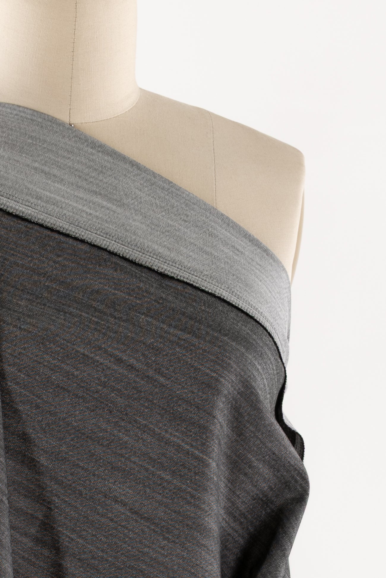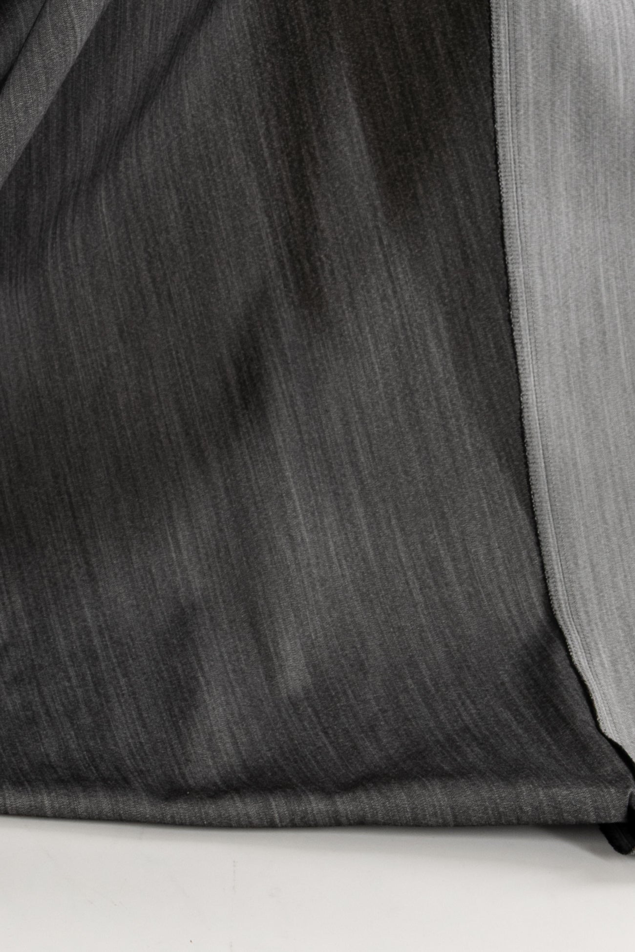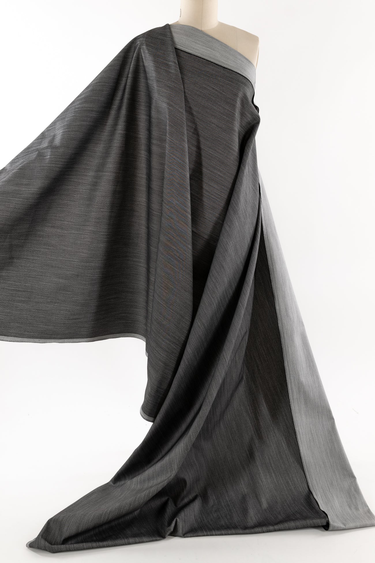 Charcoal gray striated stretch denim, deadstock from an LA designer. The striations, (parallel random vertical streaks), are formed by interweaving black and white yarns - a pleasing effect. Mid/light-weight, with an appealing, smooth hand and lightly crisp, supple drape, with good crosswise stretch and recovery. Right for a jacket, coat, vest, pants, jeans, jumpsuit, dress, skirt, workwear.