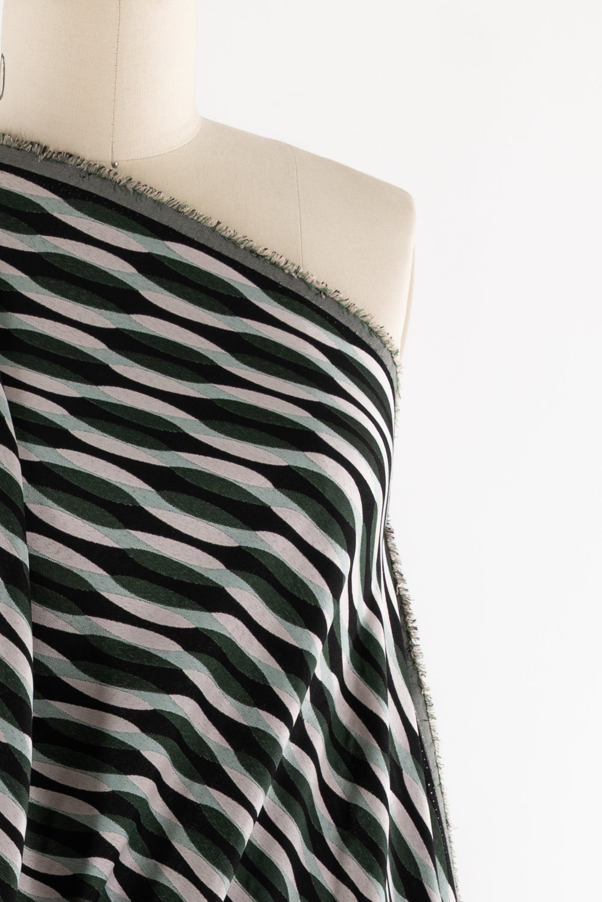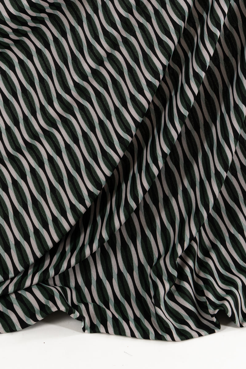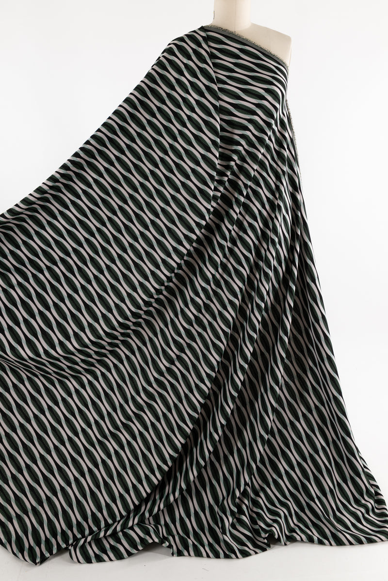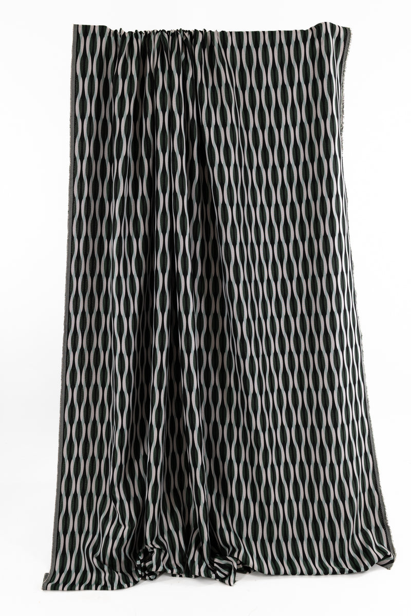 Striking jacquard with graceful undulating lines in forest, pale pistachio, black and white. Fine deadstock from LA designer Corey Lynn Calter. Light/mid-suiting weight with a subtle texture, soft hand, and malleable drape. Use either or both sides. Feels delicious, no wrinkling, ideal for a jacket, pants, vest, duster coat, or structured dress.