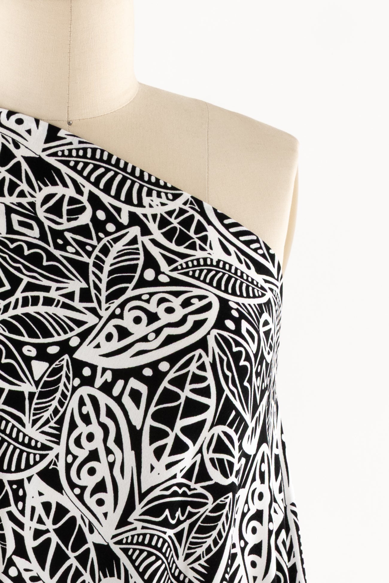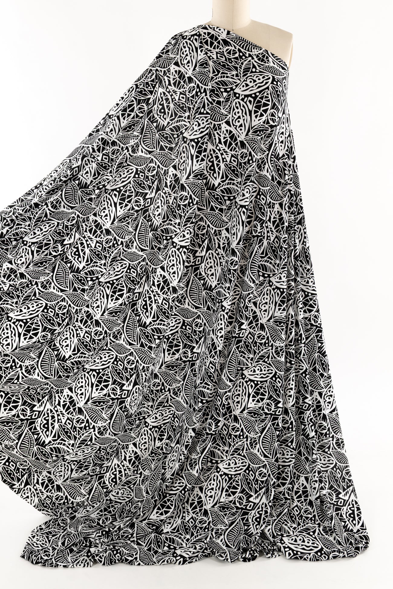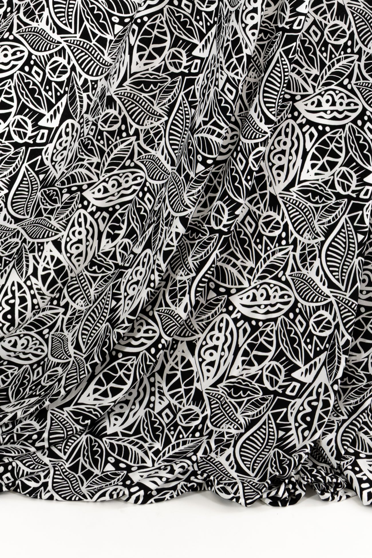 An elegant array of leaves printed in black on white in a fine quality viscose knit. Light/mid-weight, opaque with 4-way stretch, a cool dry hand, liquid drape, a 12¼" repeat, and some rolling at the cut edge. Just right for a t-shirt, top, tunic, dress, soft pants, loungewear, or children's.