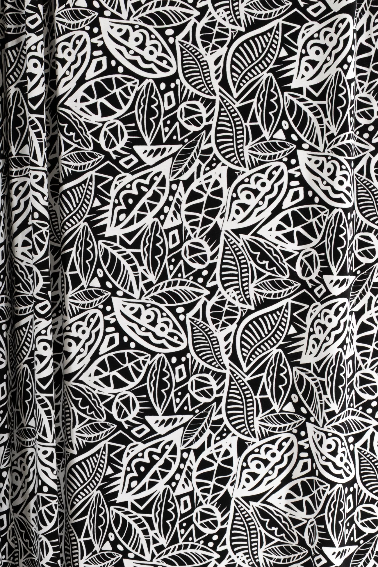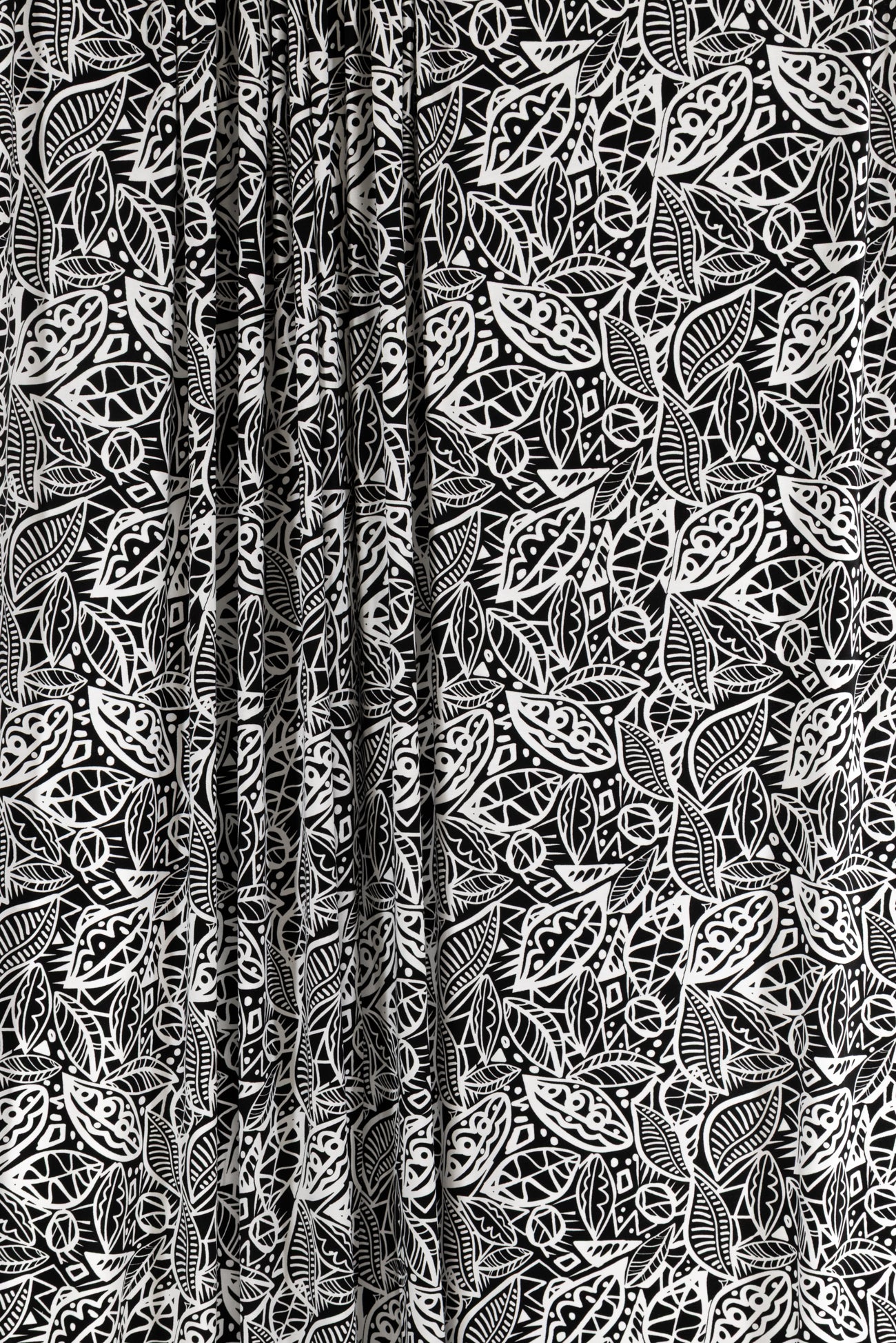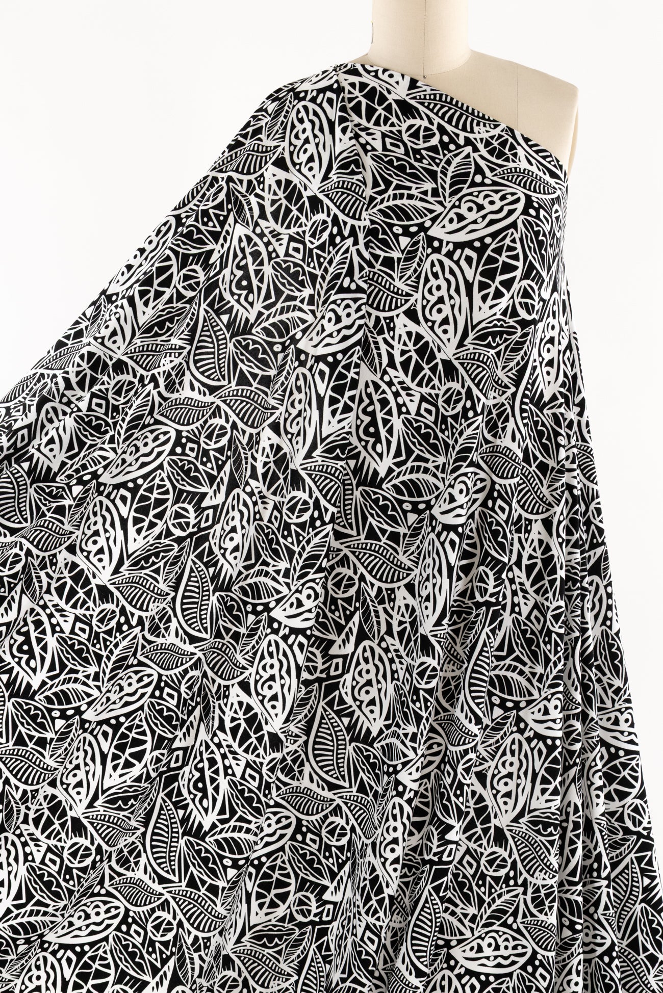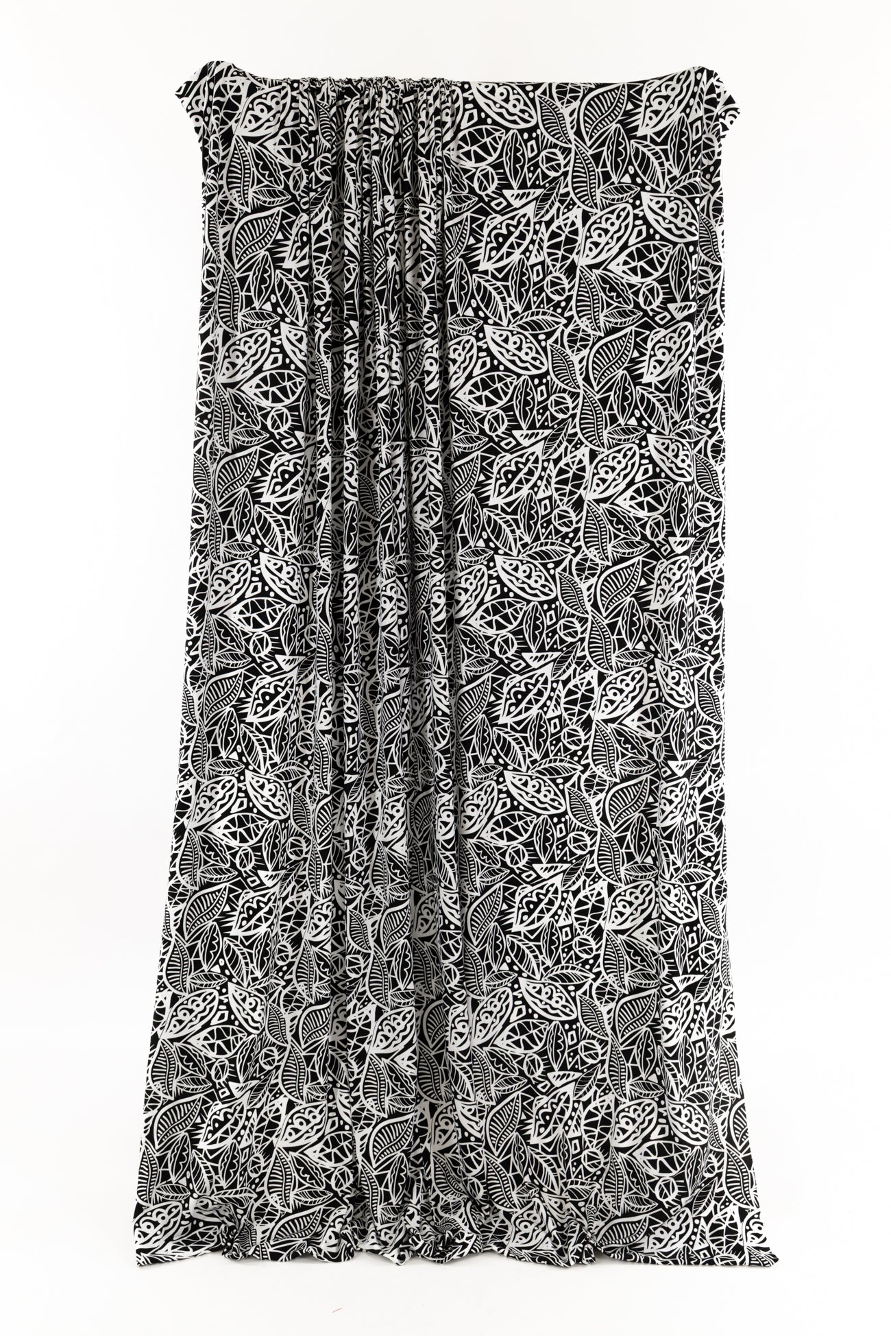 An elegant array of leaves printed in black on white in a fine quality viscose knit. Light/mid-weight, opaque with 4-way stretch, a cool dry hand, liquid drape, a 12¼" repeat, and some rolling at the cut edge. Just right for a t-shirt, top, tunic, dress, soft pants, loungewear, or children's.