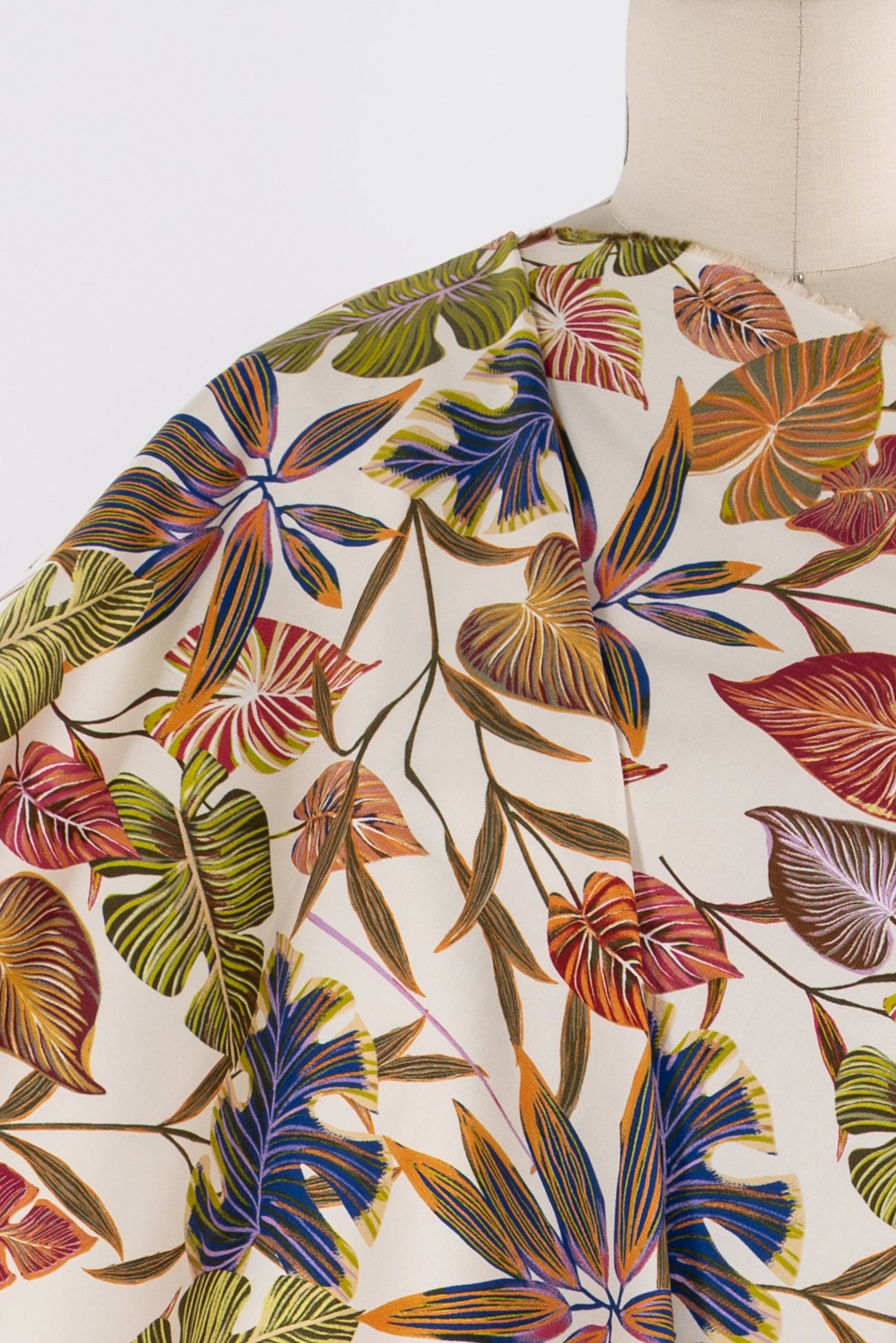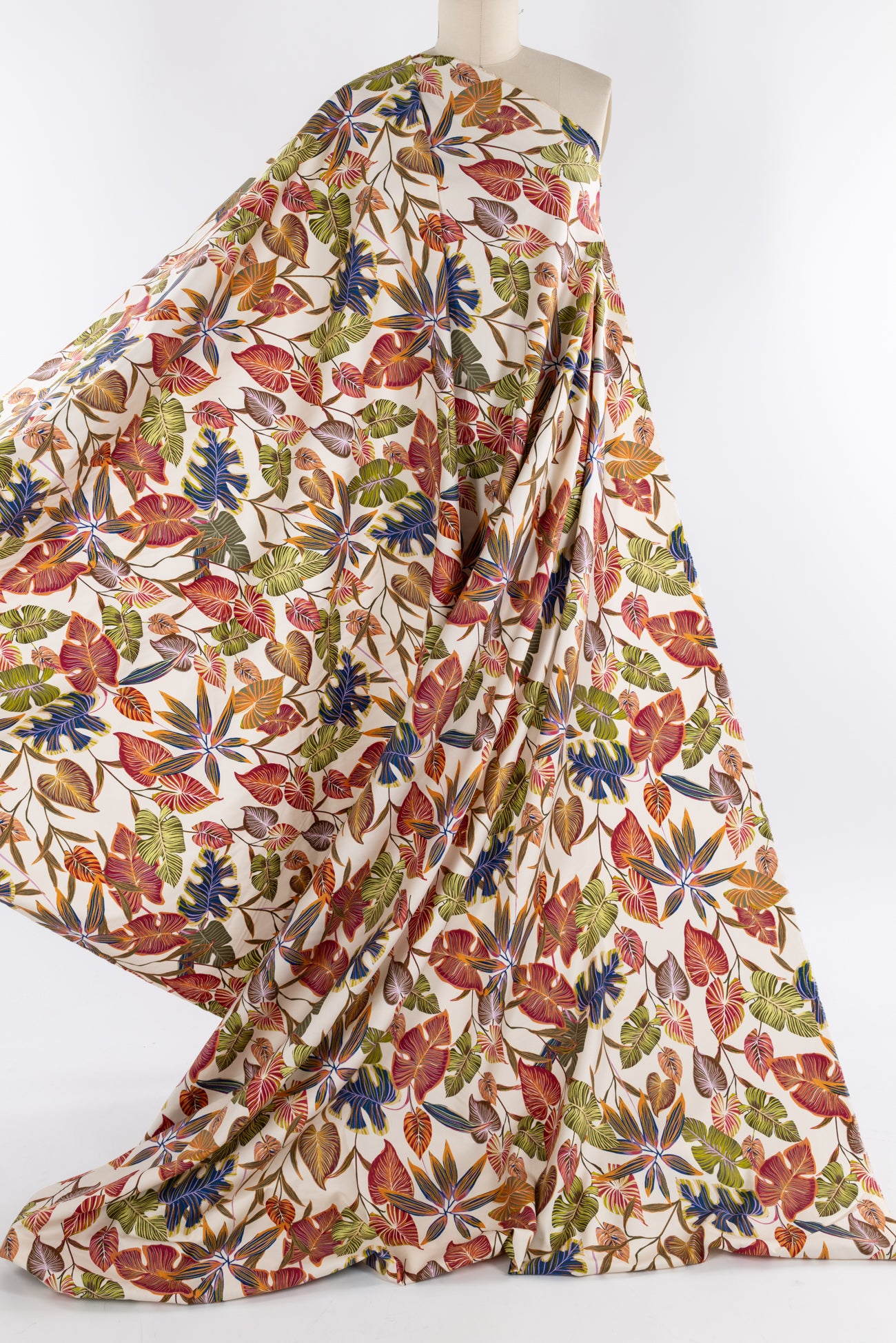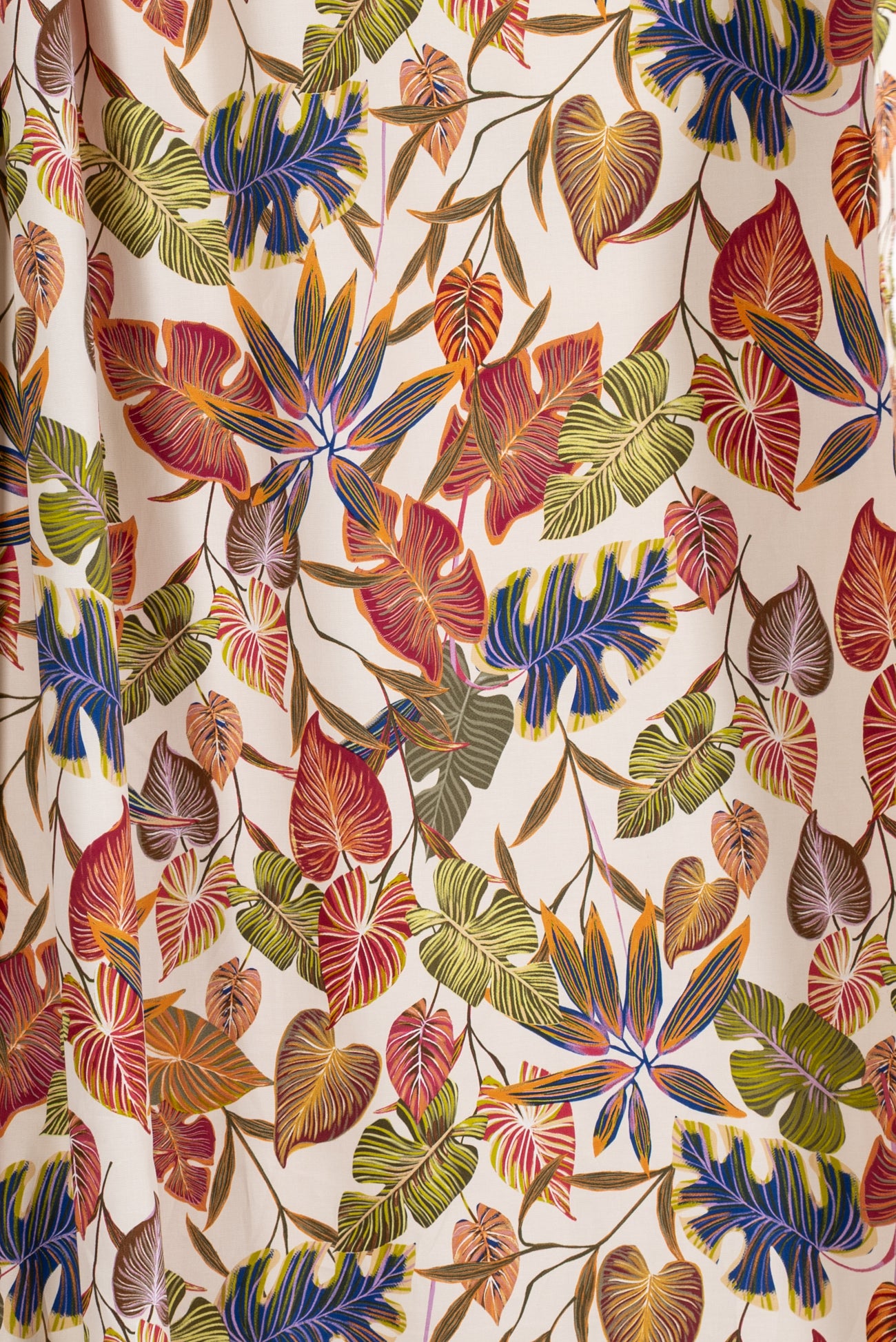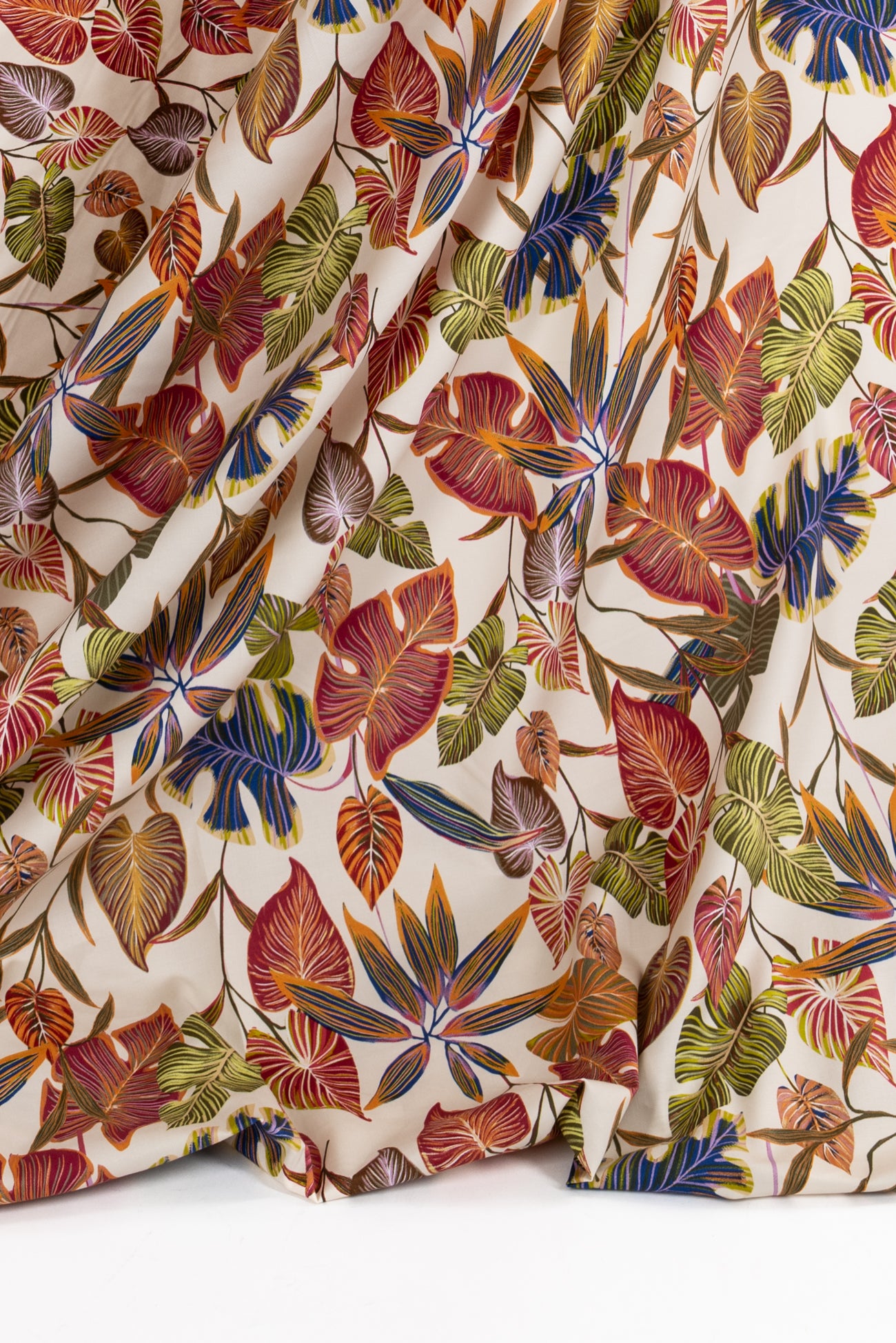A colorful kaleidoscope of leaves float on cream cotton, fine quality deadstock from an Italian mill. Mid-weight, opaque, with a smooth lightly twilled hand, 24" repeat, and a lightly crisp drape. No stretch. Right for a dress, top, tunic, blouse, shirt, kimono, caftan, workwear, or children's wear.
