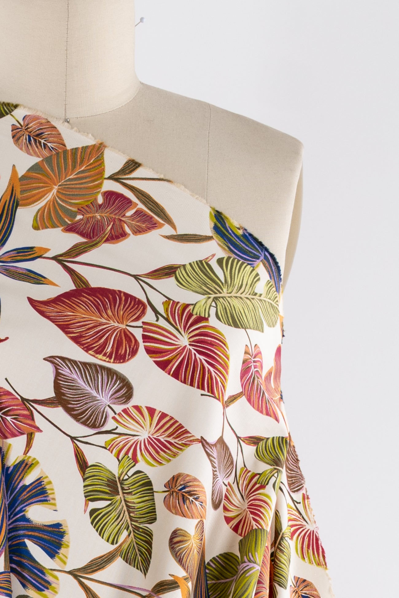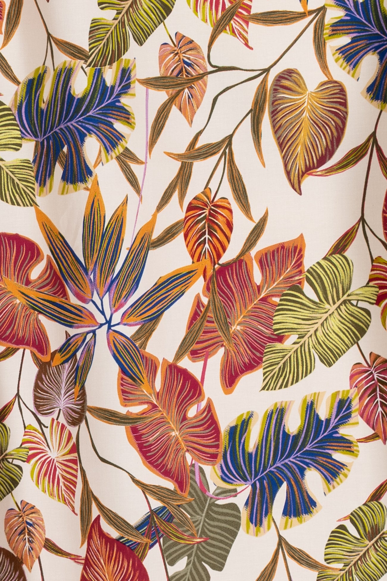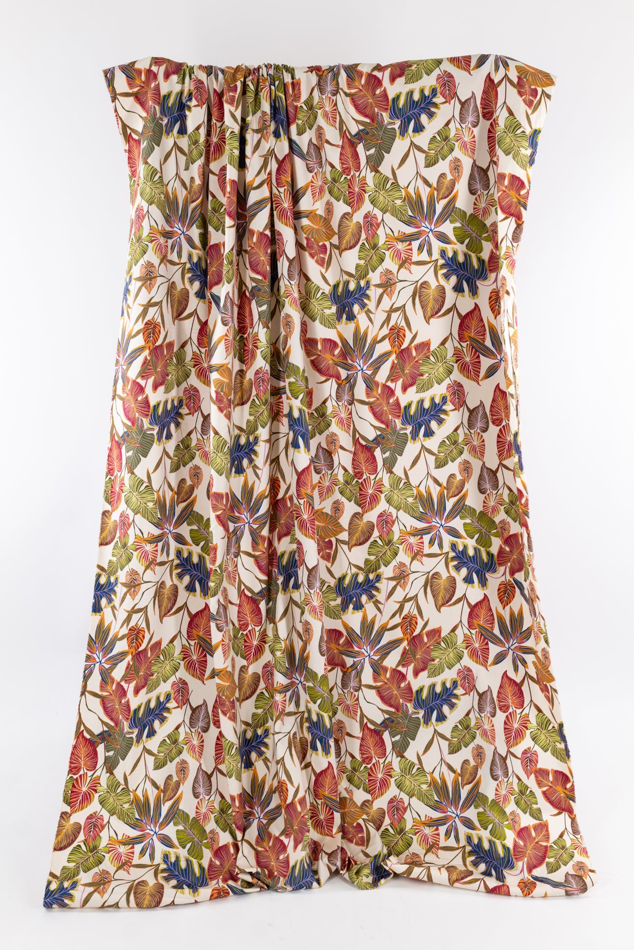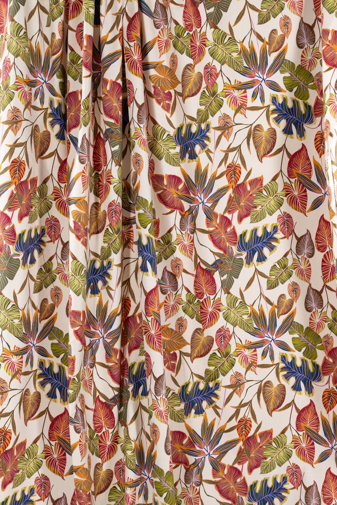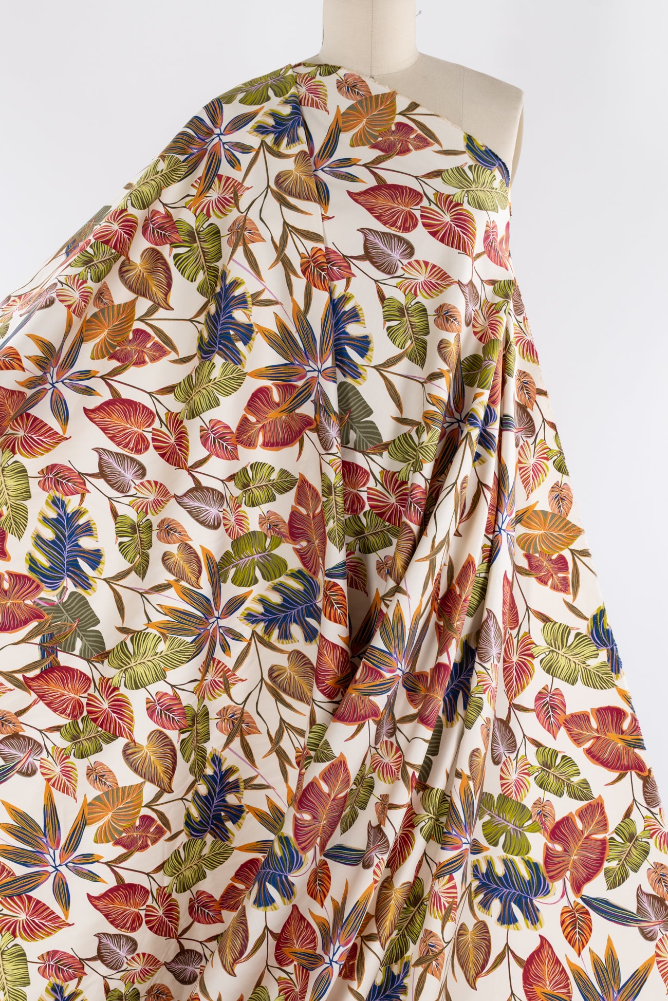 A colorful kaleidoscope of leaves float on cream cotton, fine quality deadstock from an Italian mill. Mid-weight, opaque, with a smooth lightly twilled hand, 24" repeat, and a lightly crisp drape. No stretch. Right for a dress, top, tunic, blouse, shirt, kimono, caftan, workwear, or children's wear.