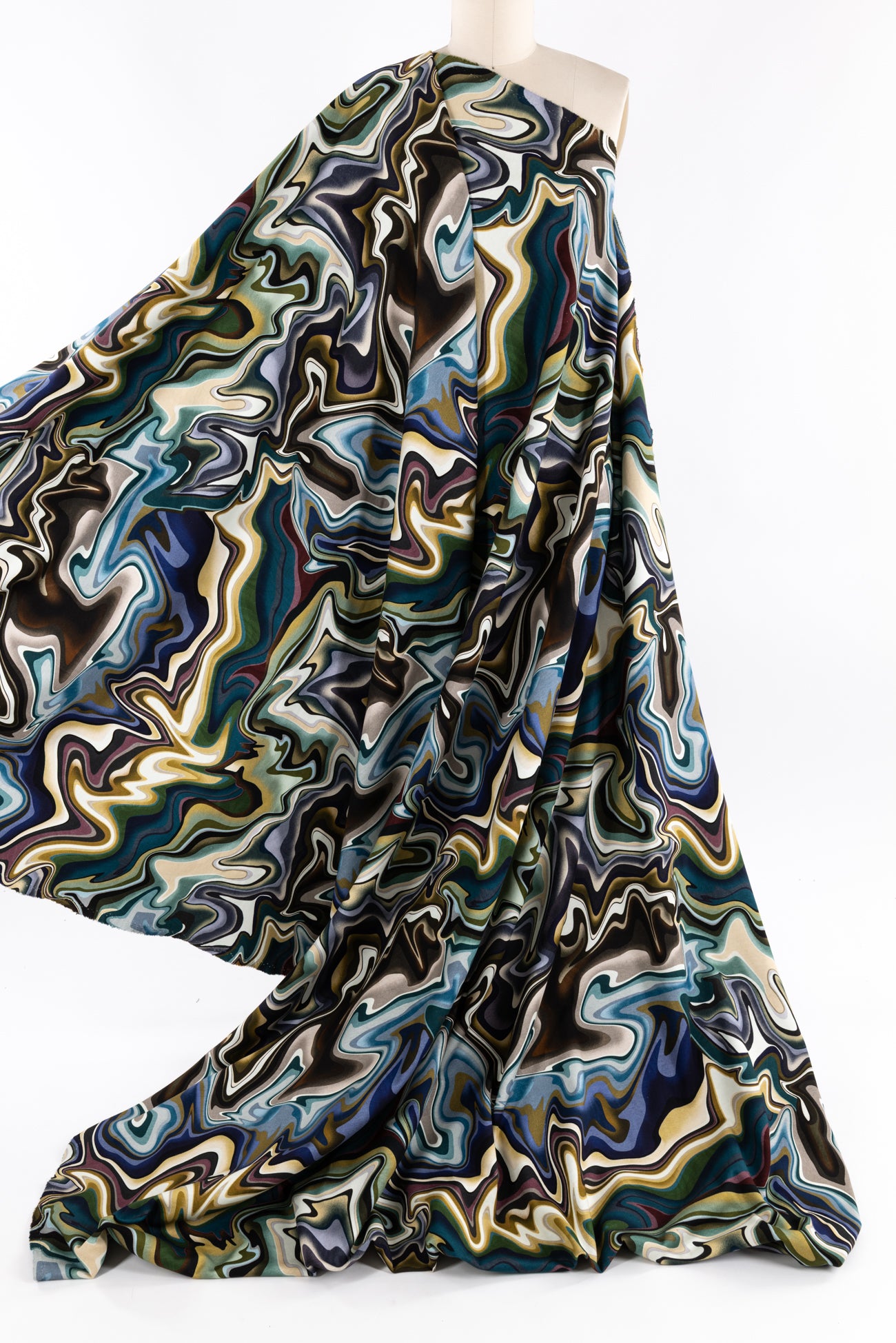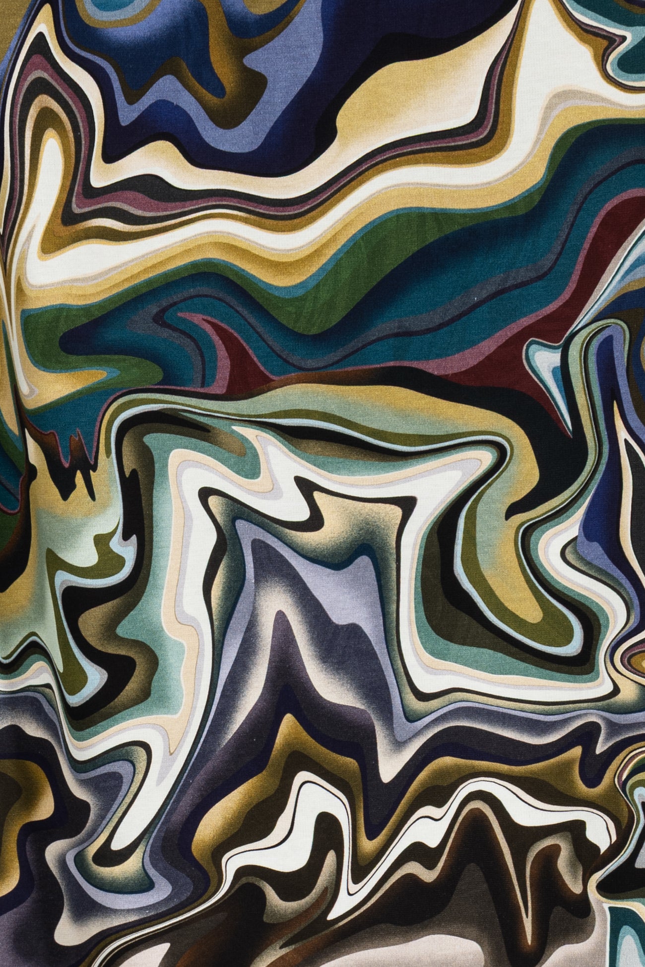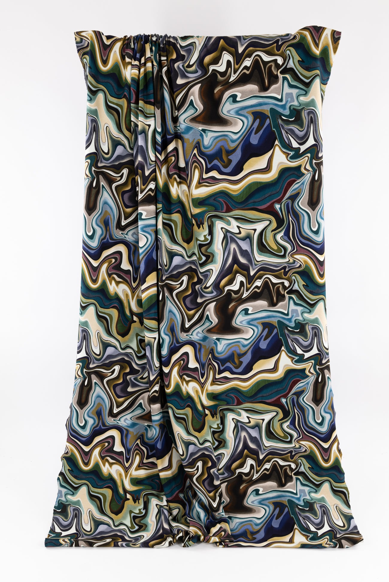 Stunning digital marbled print in fluid shades of blue, ochre, green, aubergine and black on a impeccable quality cream ponte double knit, deadstock from an Italian mill. Printed ponte is rare and this one is outstanding! Mid/light weight, with a soft dry hand, fluid drape, 26¼" repeat and crosswise stretch. Stable, no rolling at the cut edge, easy to sew and will skim the body in a flattering way. Right for both tops and bottoms; dress, tunic, t-shirt, skirt, jacket, light coat, hoodie, pants, jumpsuit, kimono or caftan. Limited quantity.