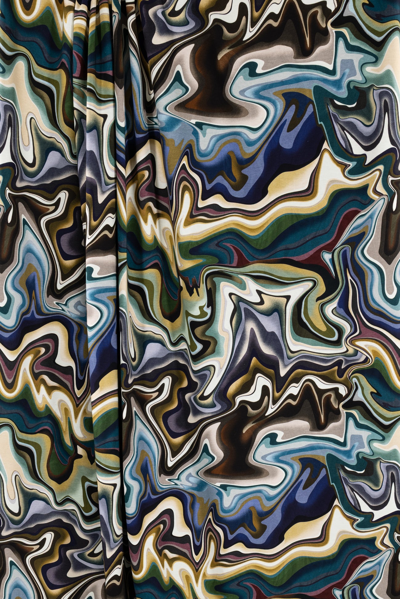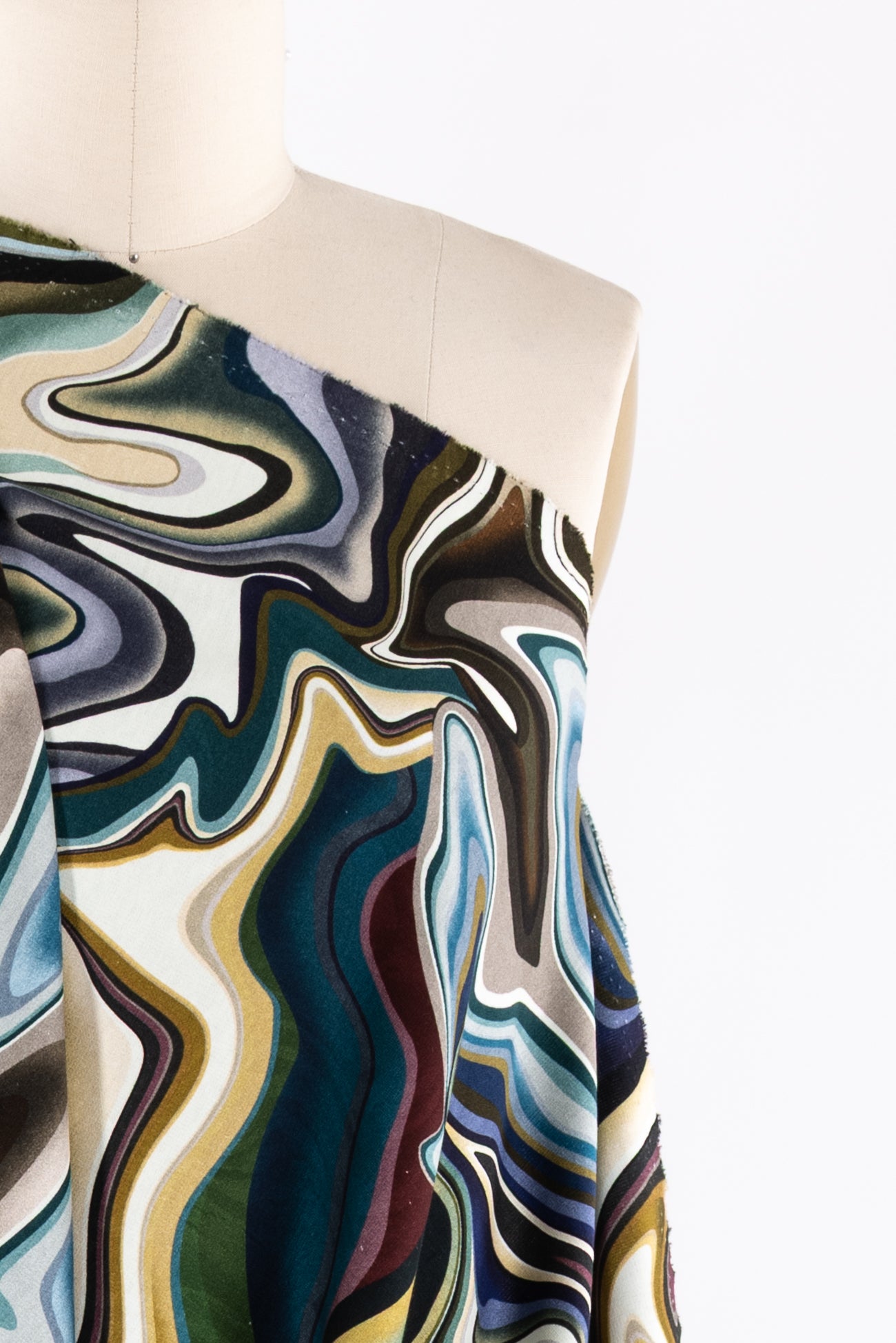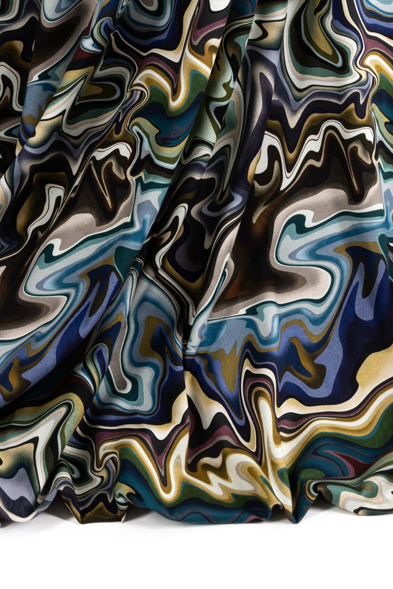 Stunning digital marbled print in fluid shades of blue, ochre, green, aubergine and black on a impeccable quality cream ponte double knit, deadstock from an Italian mill. Printed ponte is rare and this one is outstanding! Mid/light weight, with a soft dry hand, fluid drape, 26¼" repeat and crosswise stretch. Stable, no rolling at the cut edge, easy to sew and will skim the body in a flattering way. Right for both tops and bottoms; dress, tunic, t-shirt, skirt, jacket, light coat, hoodie, pants, jumpsuit, kimono or caftan. Limited quantity.