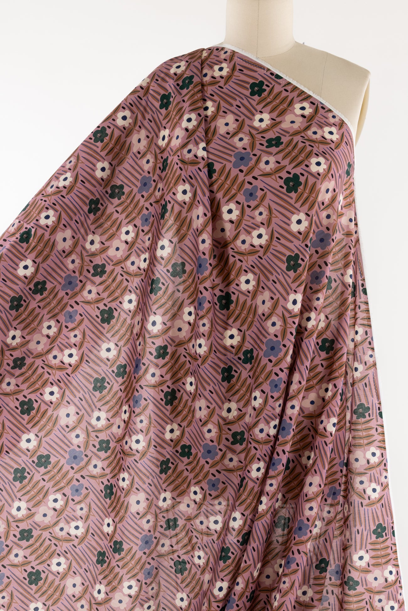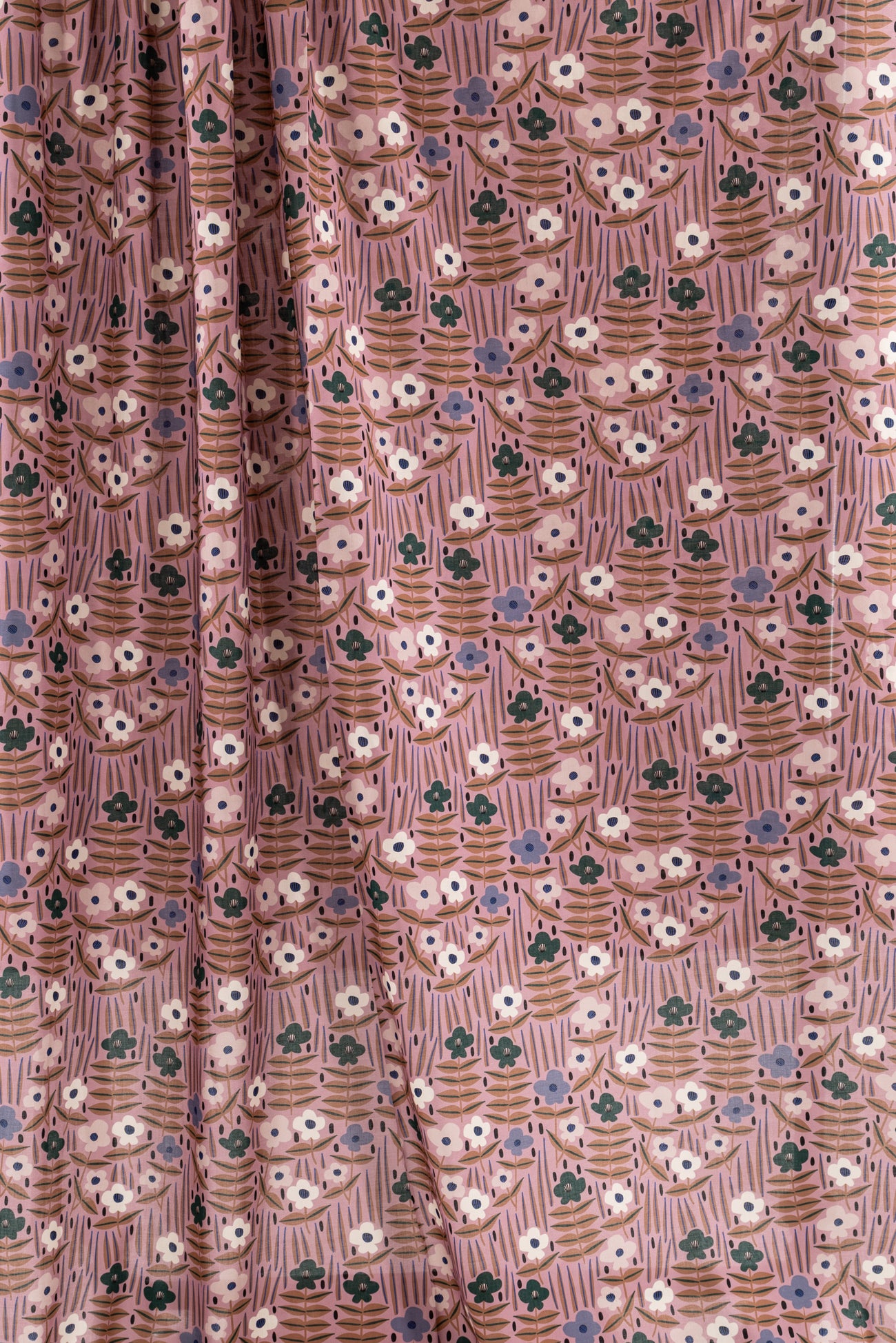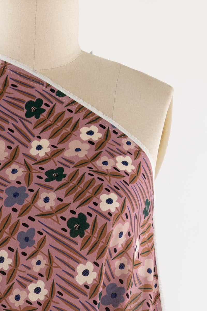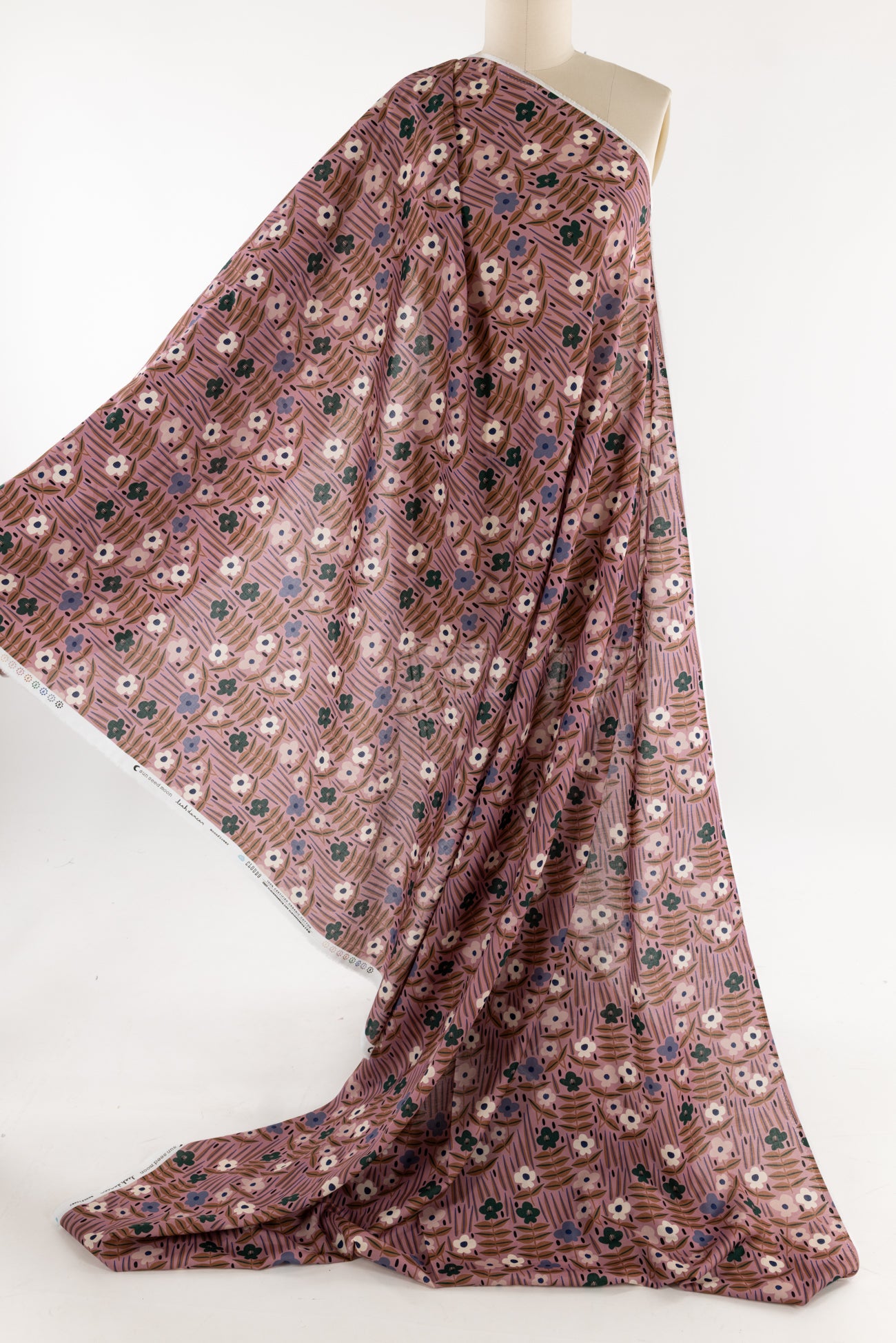 Whimsical floral in periwinkle, teal, parchment, and mocha with blue and black accents on a mauve ground. Lightweight, opaque, with a smooth cool hand, an 8" repeat, and soft drape. Right for a dress, skirt, shirt, tunic, caftan, kimono, soft pant, or children's wear.