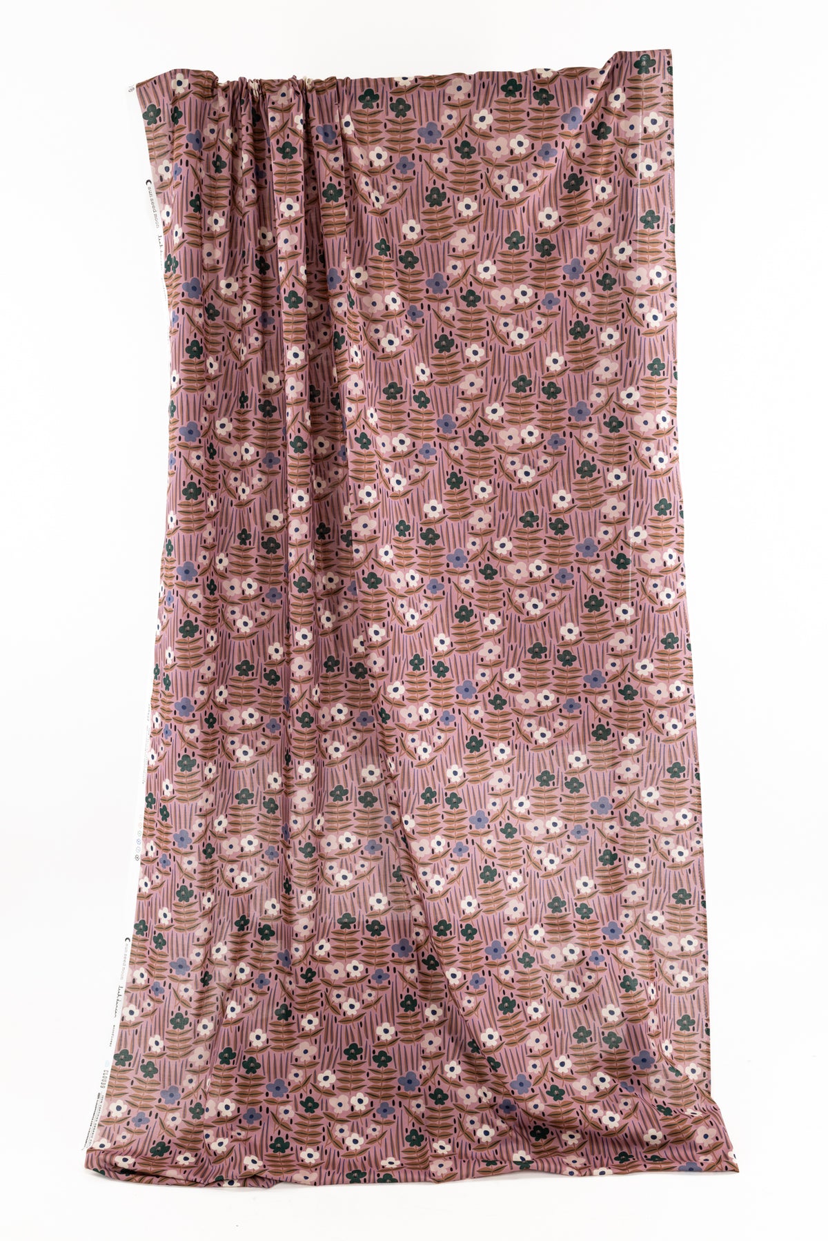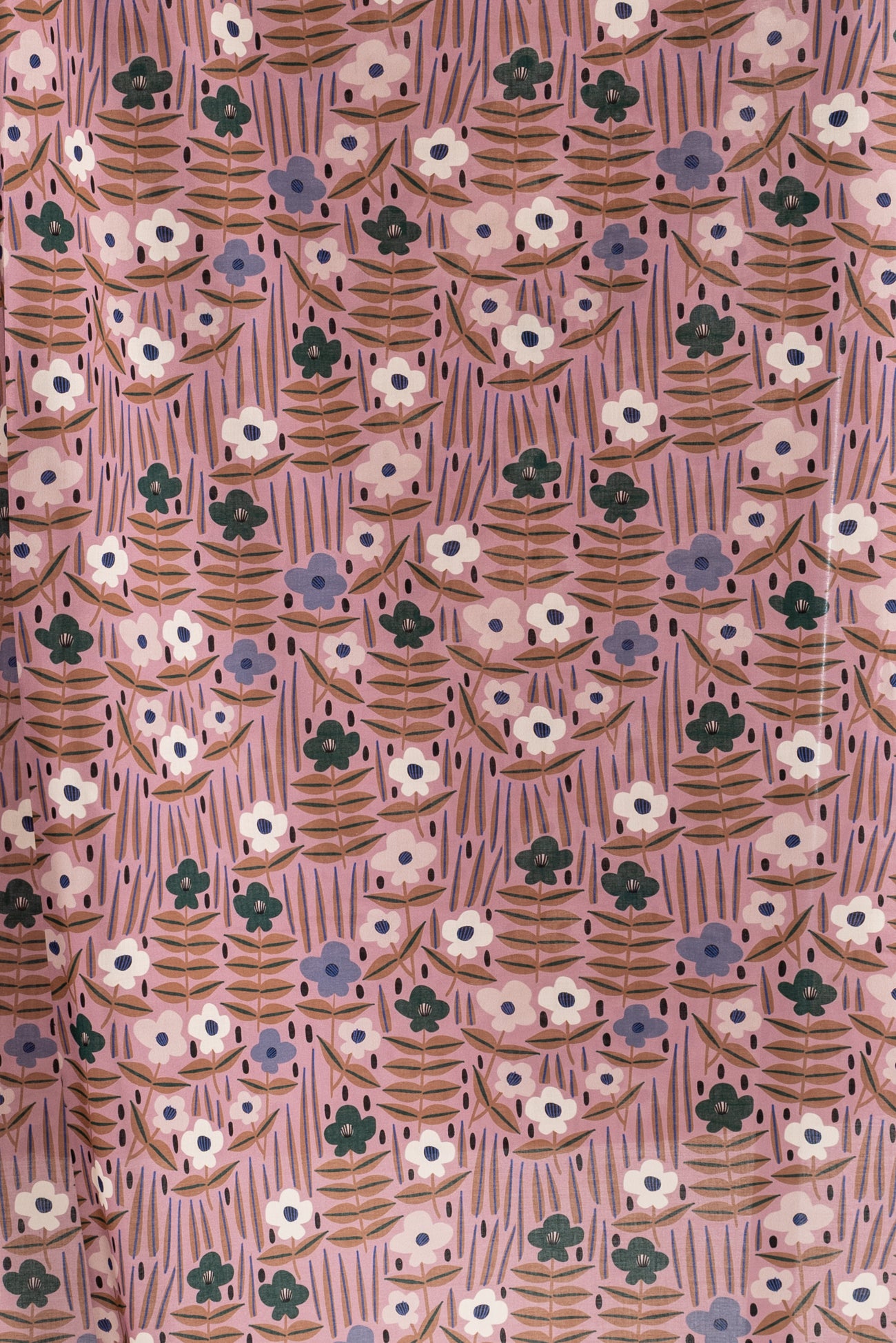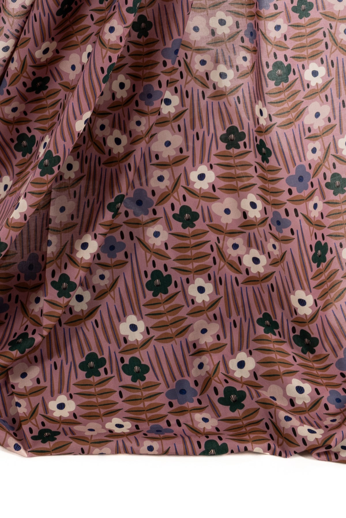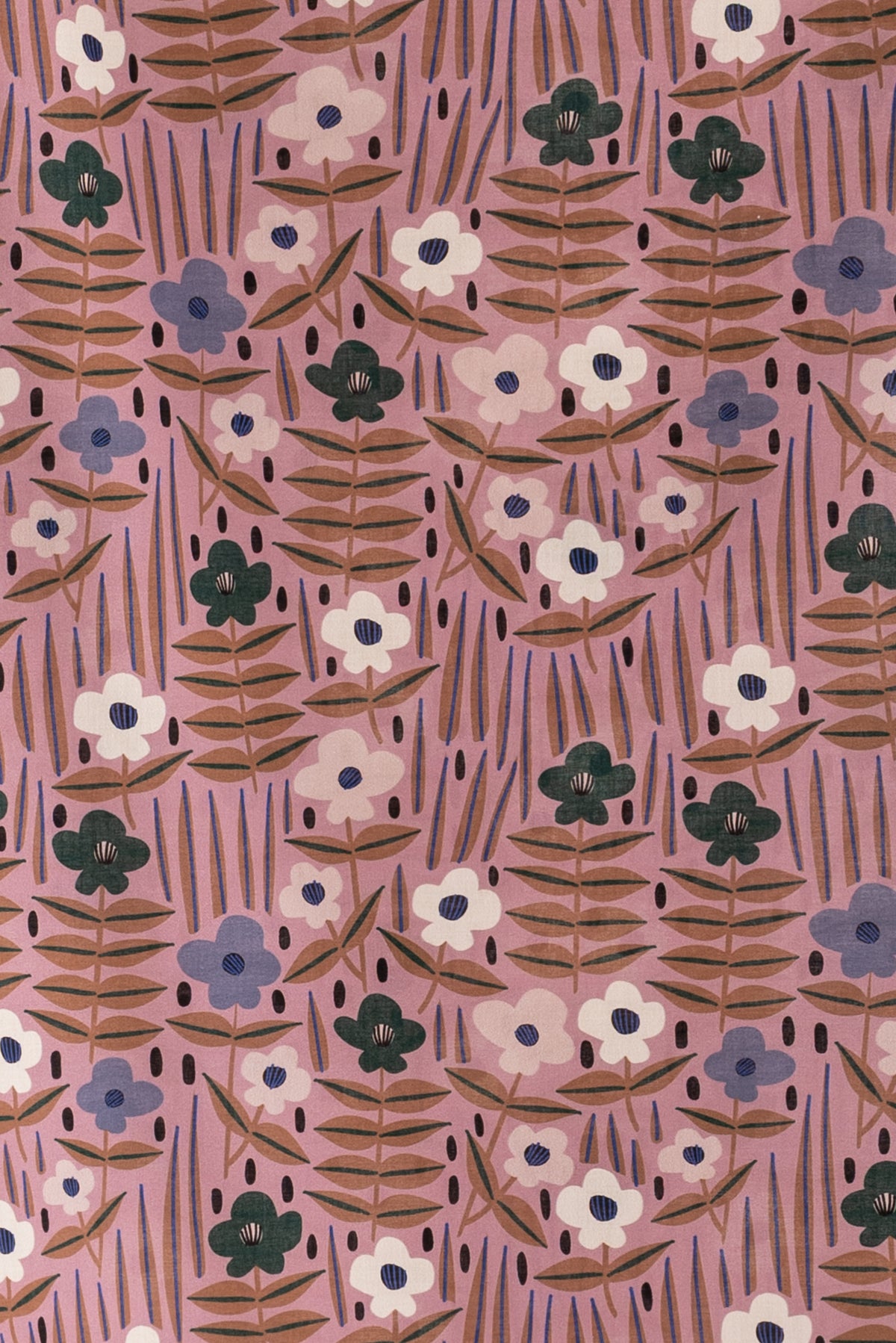 Whimsical floral in periwinkle, teal, parchment, and mocha with blue and black accents on a mauve ground. Lightweight, opaque, with a smooth cool hand, an 8" repeat, and soft drape. Right for a dress, skirt, shirt, tunic, caftan, kimono, soft pant, or children's wear.