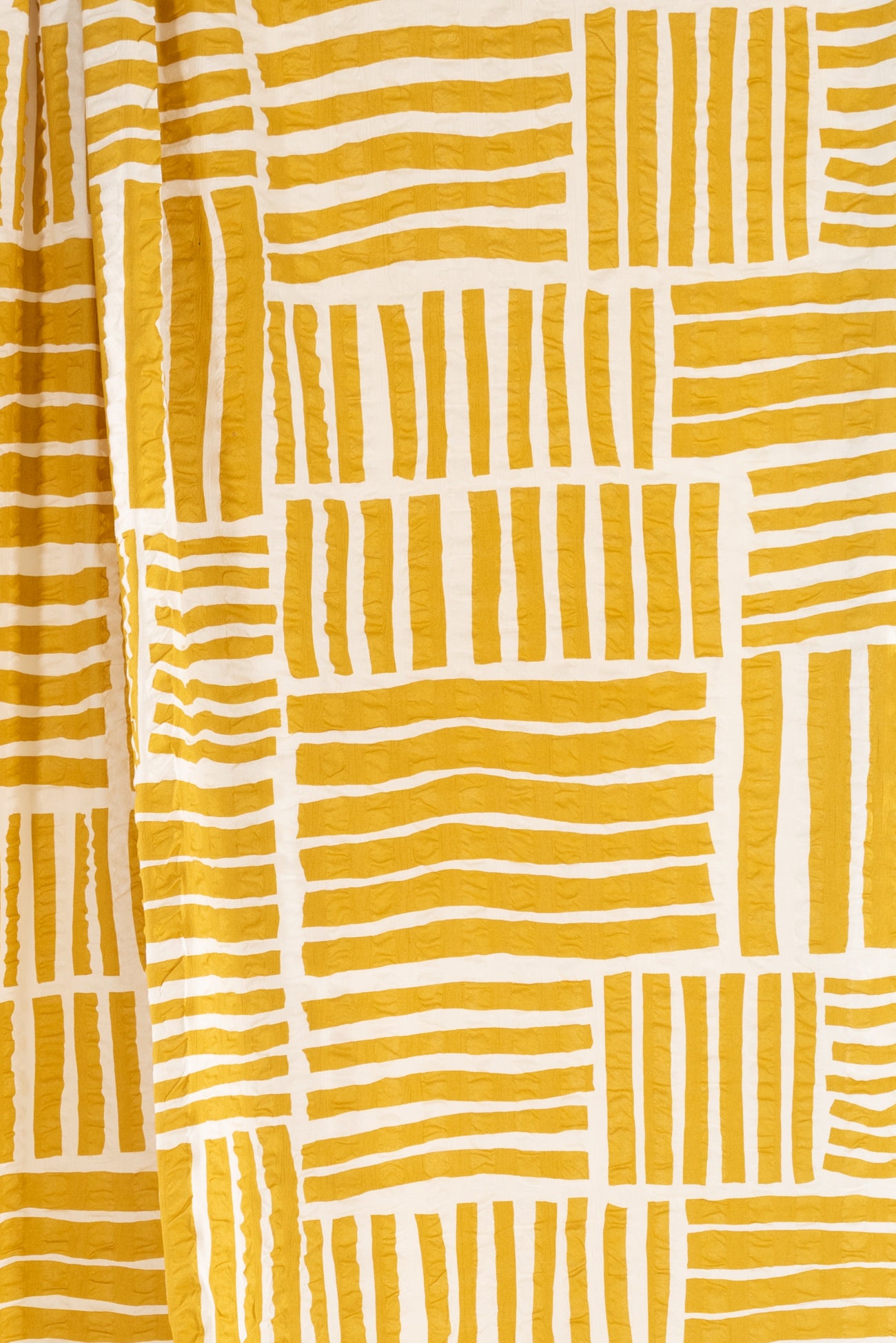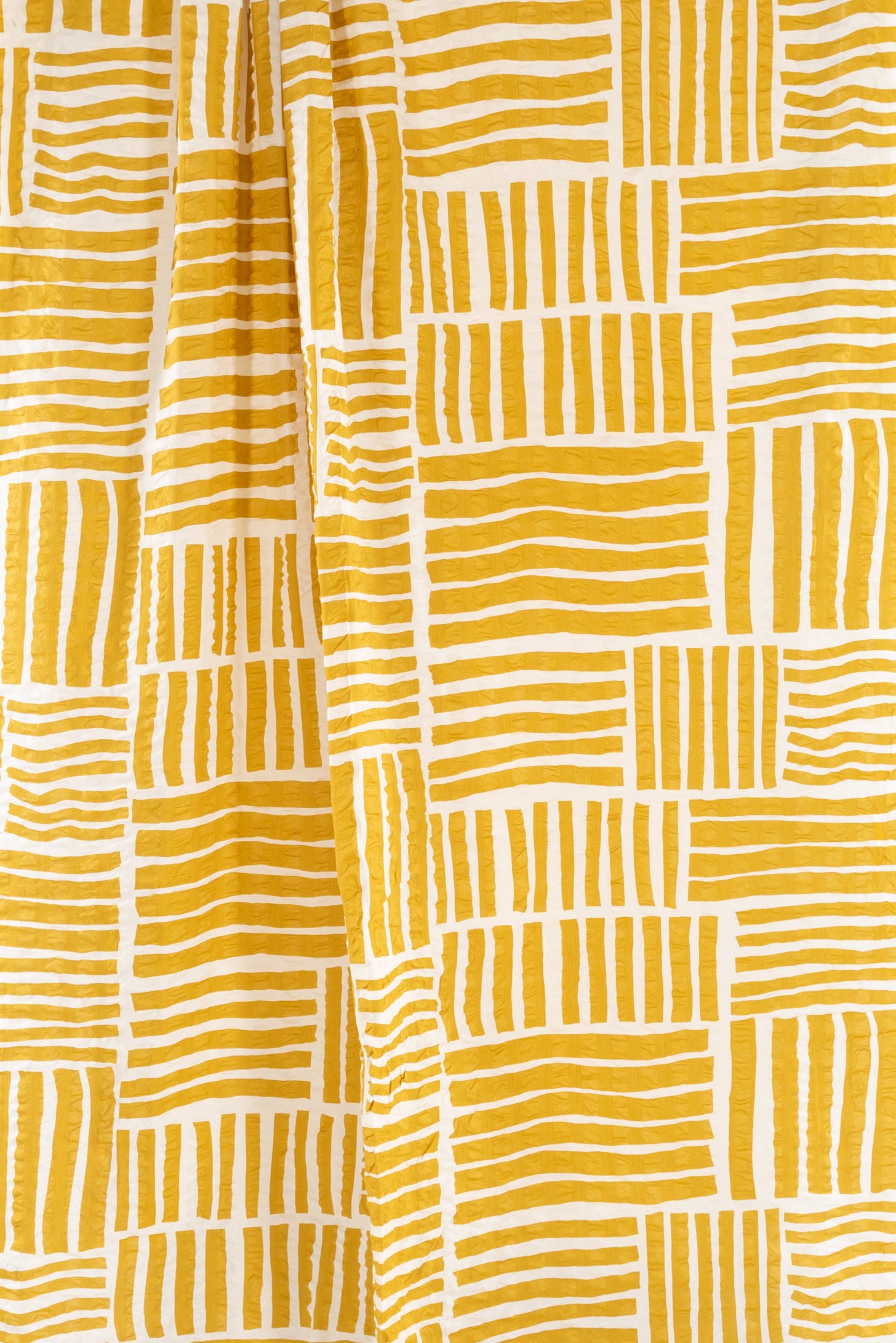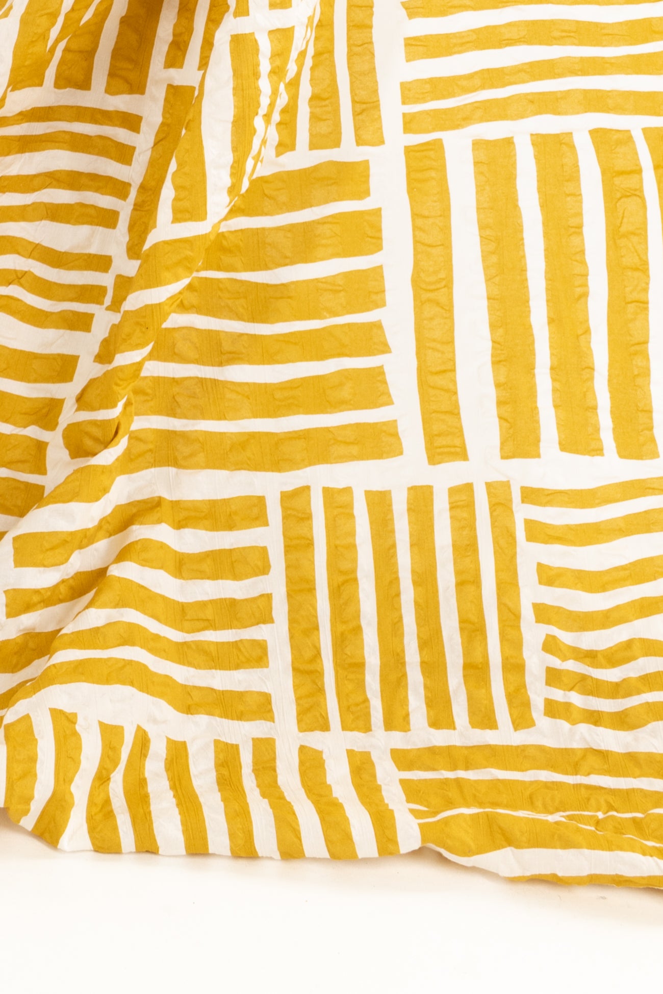 A gorgeous grid of mustard yellow stripes on a wide white seersucker, impeccable quality deadstock from a Japanese mill. The softly crimped texture of seersucker ensures it does not cling, delivering cool comfort even in the hottest climates. Perfect for the heat whether you are in city or country. Lovely shirting/dress weight with an appealing soft cool lightly textured hand, supple drape and 22" repeat. Perfect for a shirt, blouse, dress, tunic, soft pants, caftan, kimono, men's or children's. Limited quantity.