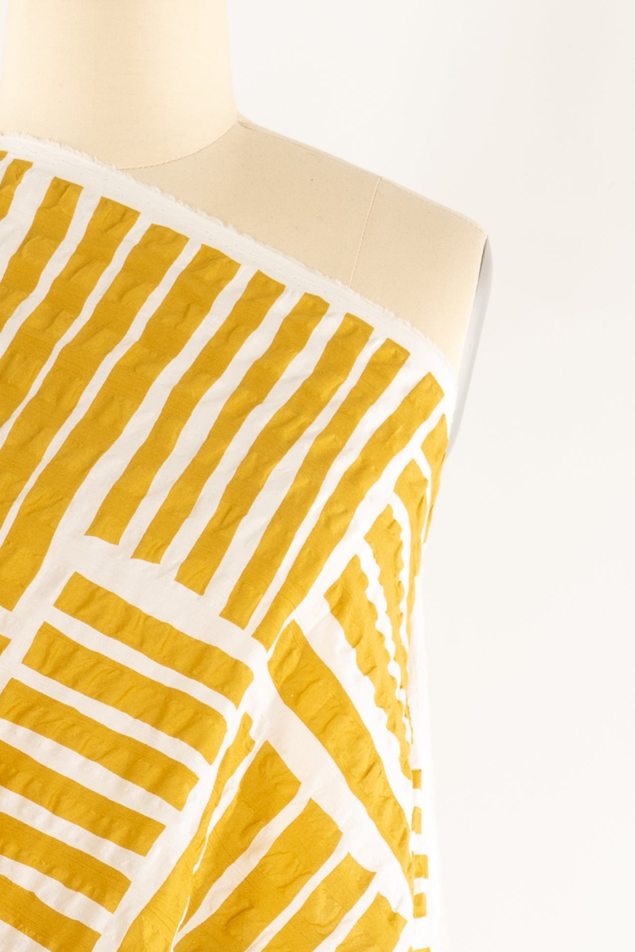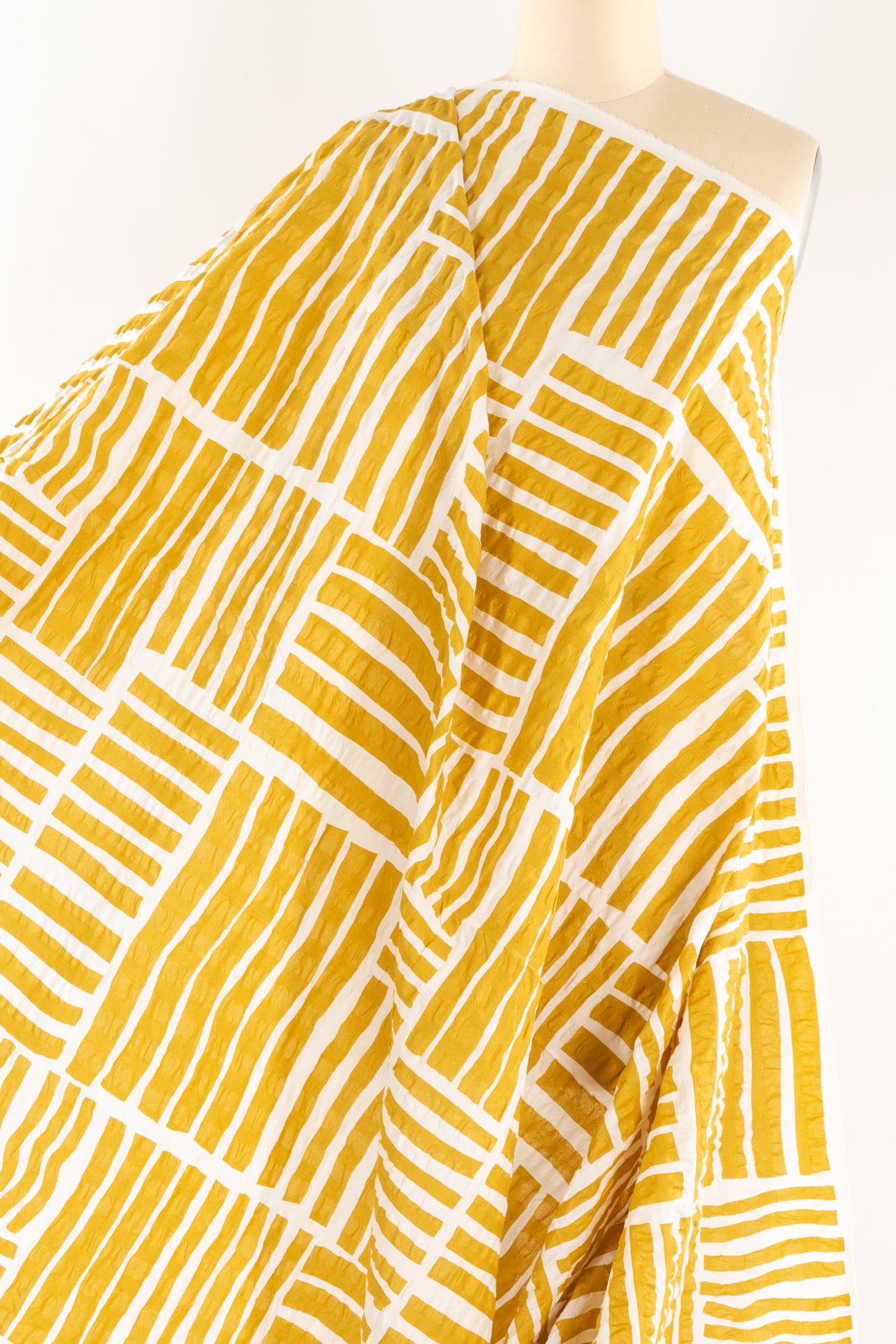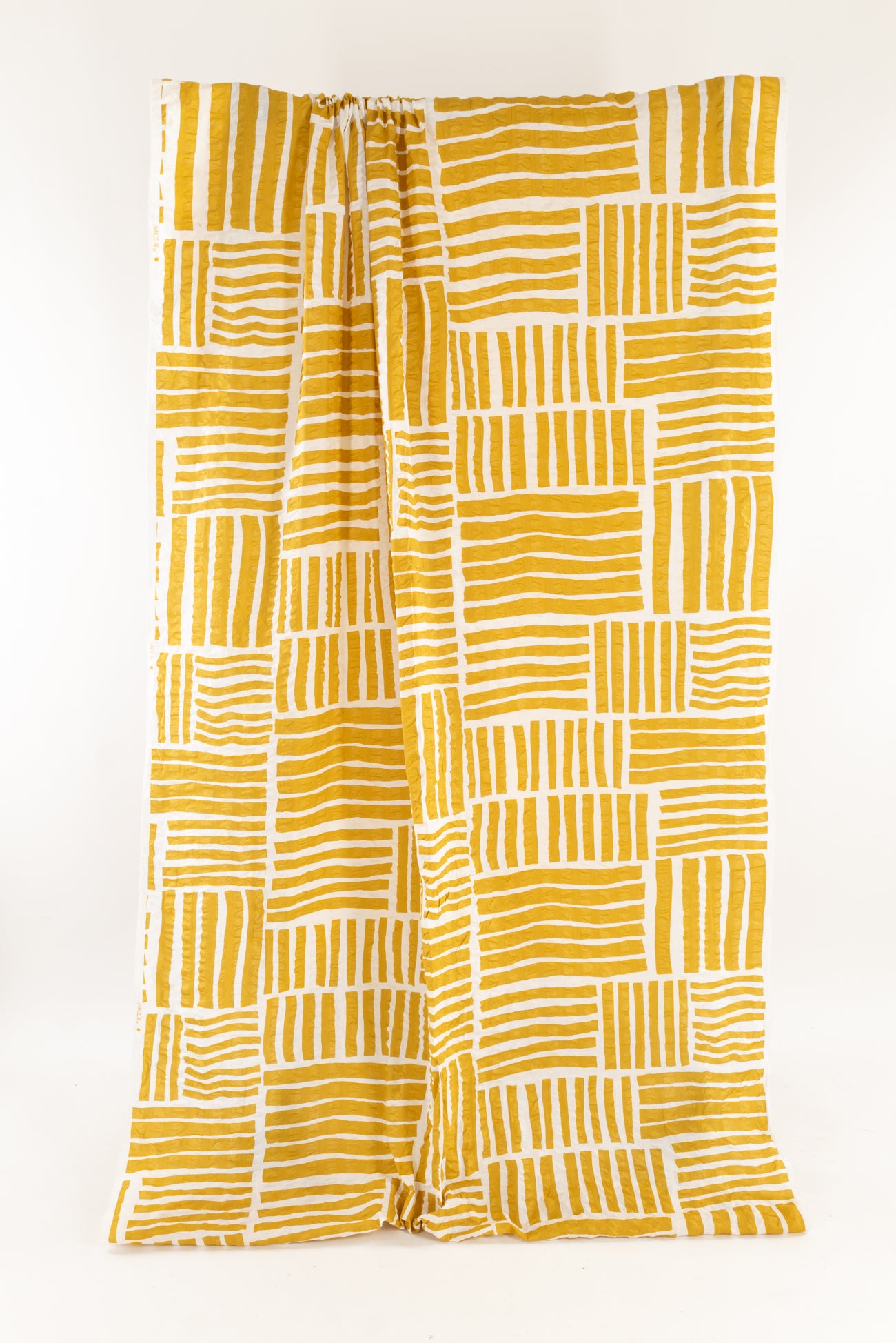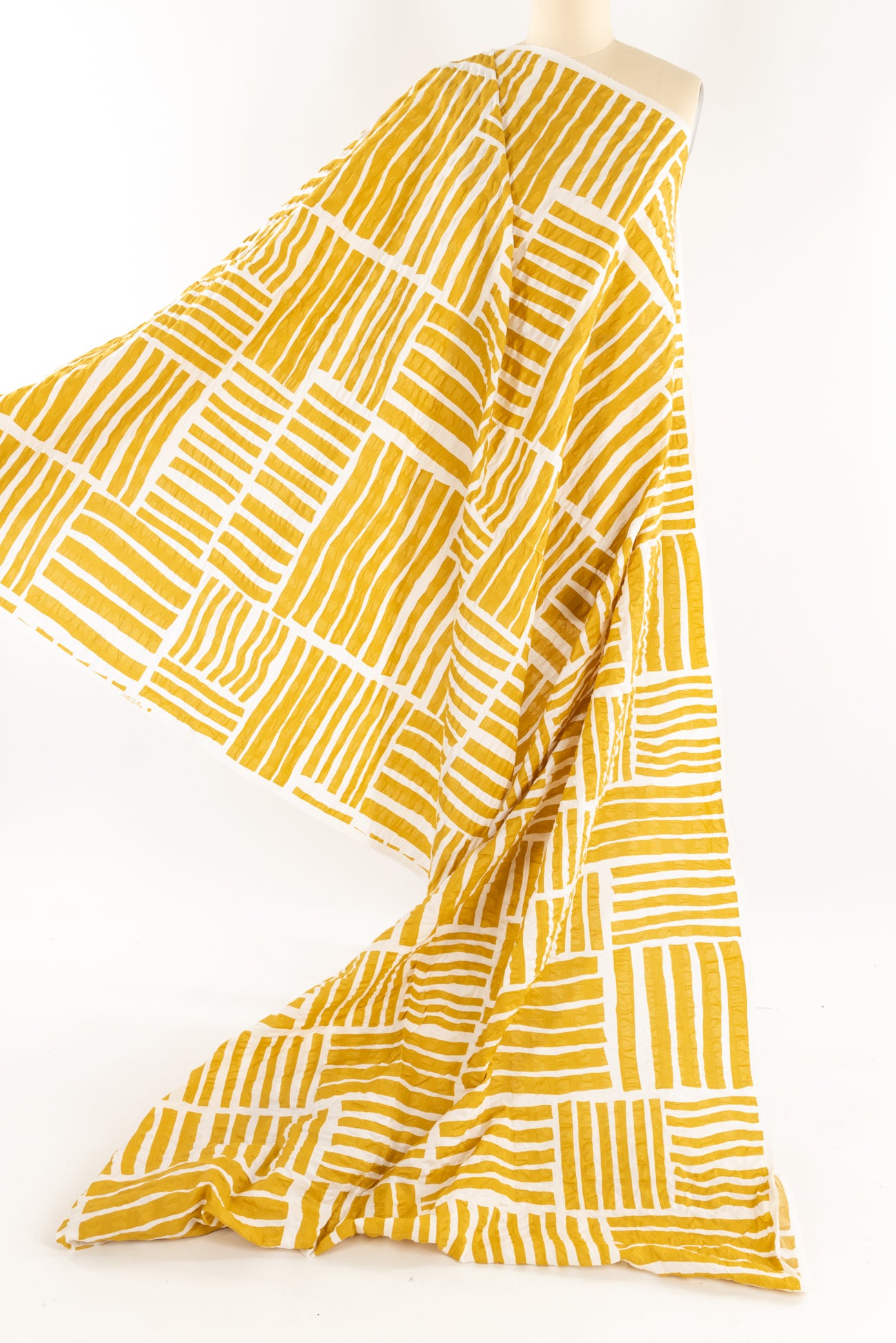 A gorgeous grid of mustard yellow stripes on a wide white seersucker, impeccable quality deadstock from a Japanese mill. The softly crimped texture of seersucker ensures it does not cling, delivering cool comfort even in the hottest climates. Perfect for the heat whether you are in city or country. Lovely shirting/dress weight with an appealing soft cool lightly textured hand, supple drape and 22" repeat. Perfect for a shirt, blouse, dress, tunic, soft pants, caftan, kimono, men's or children's. Limited quantity.