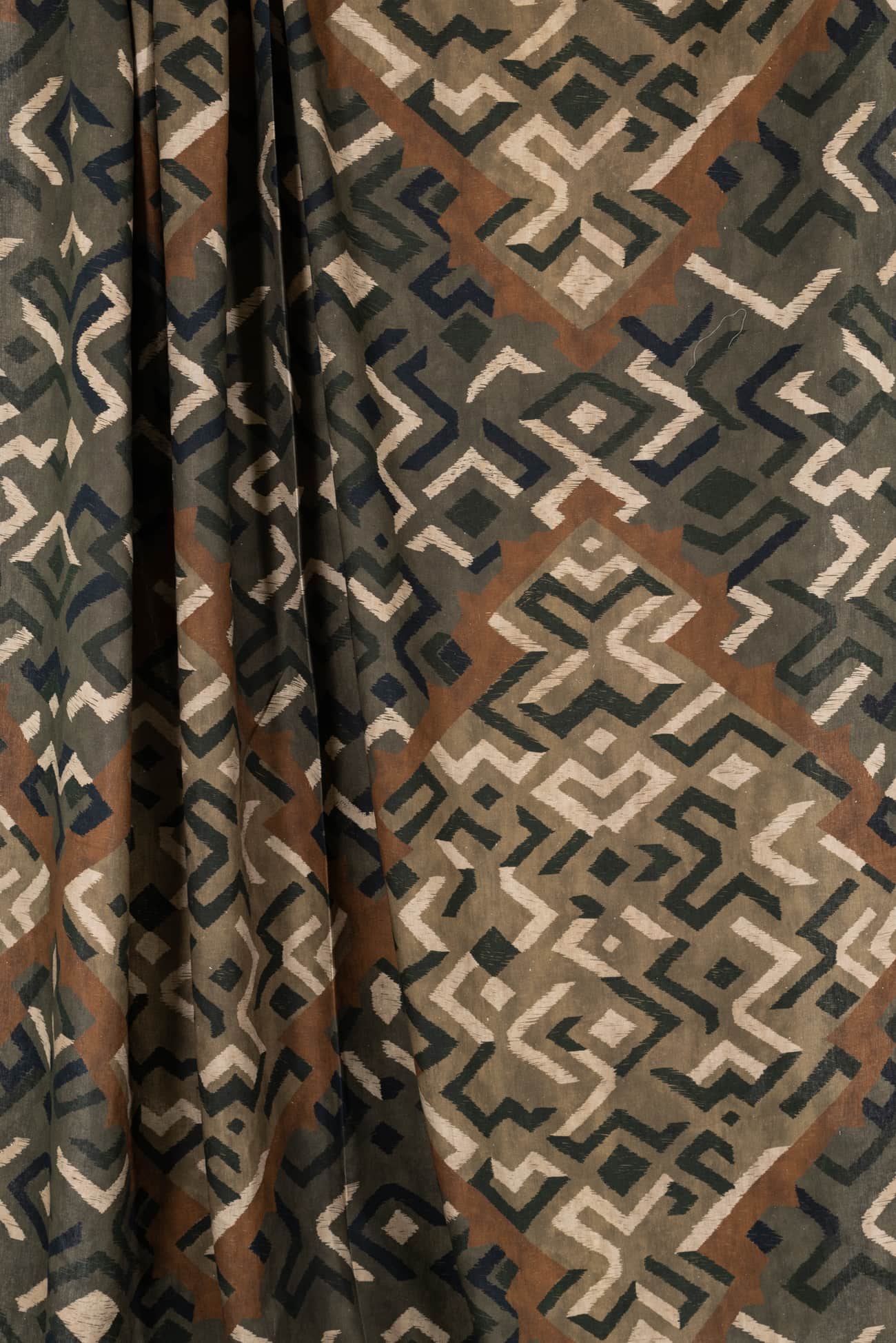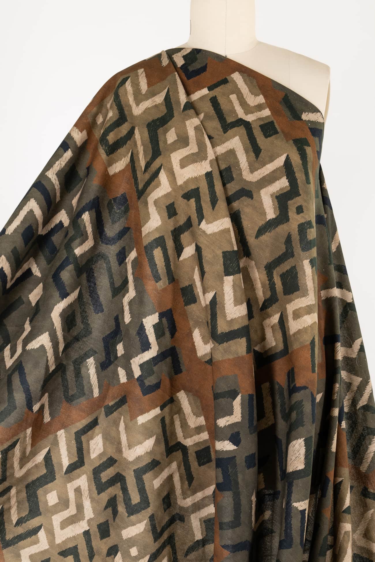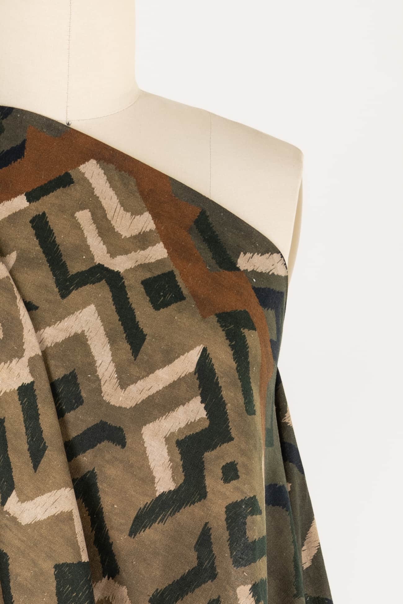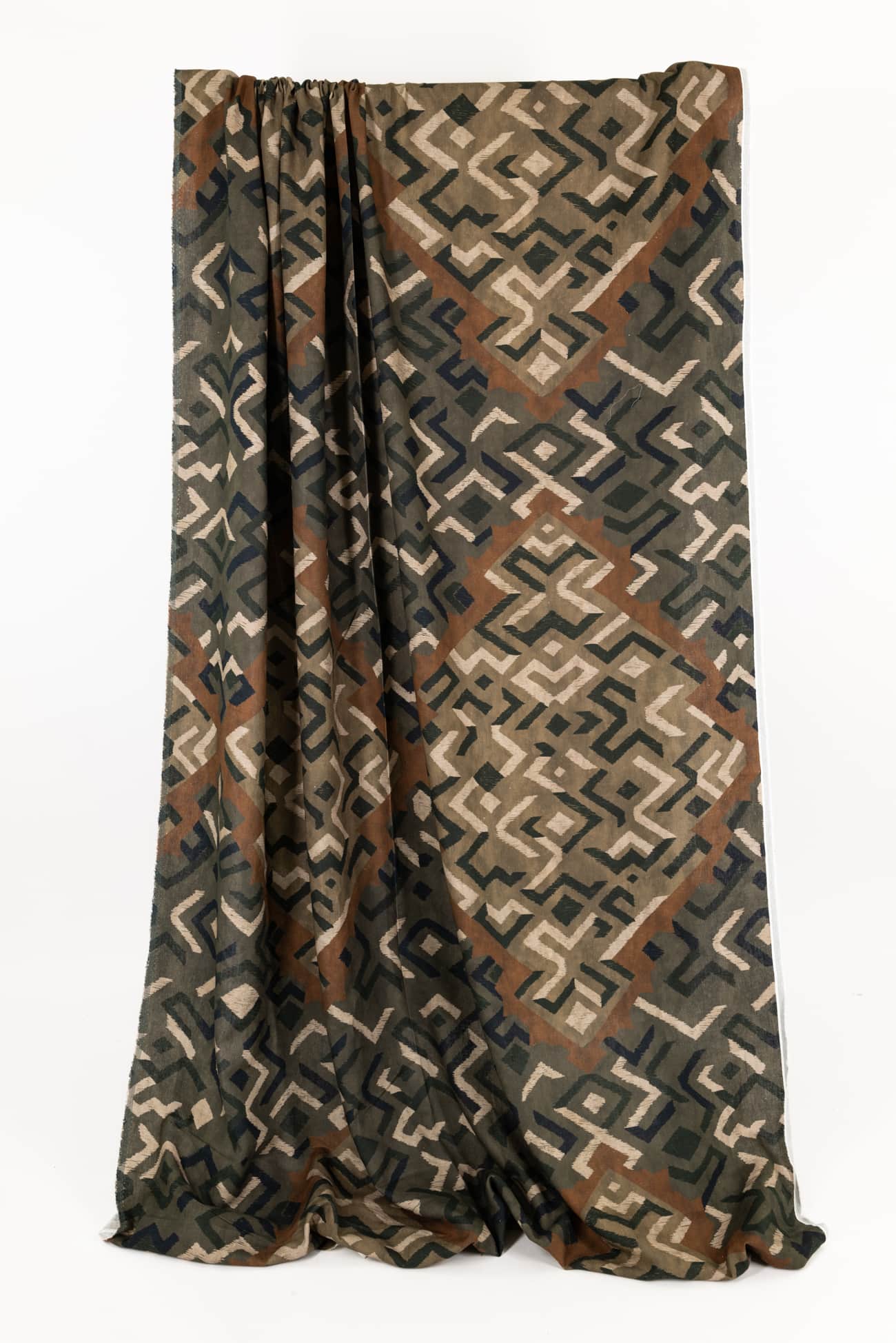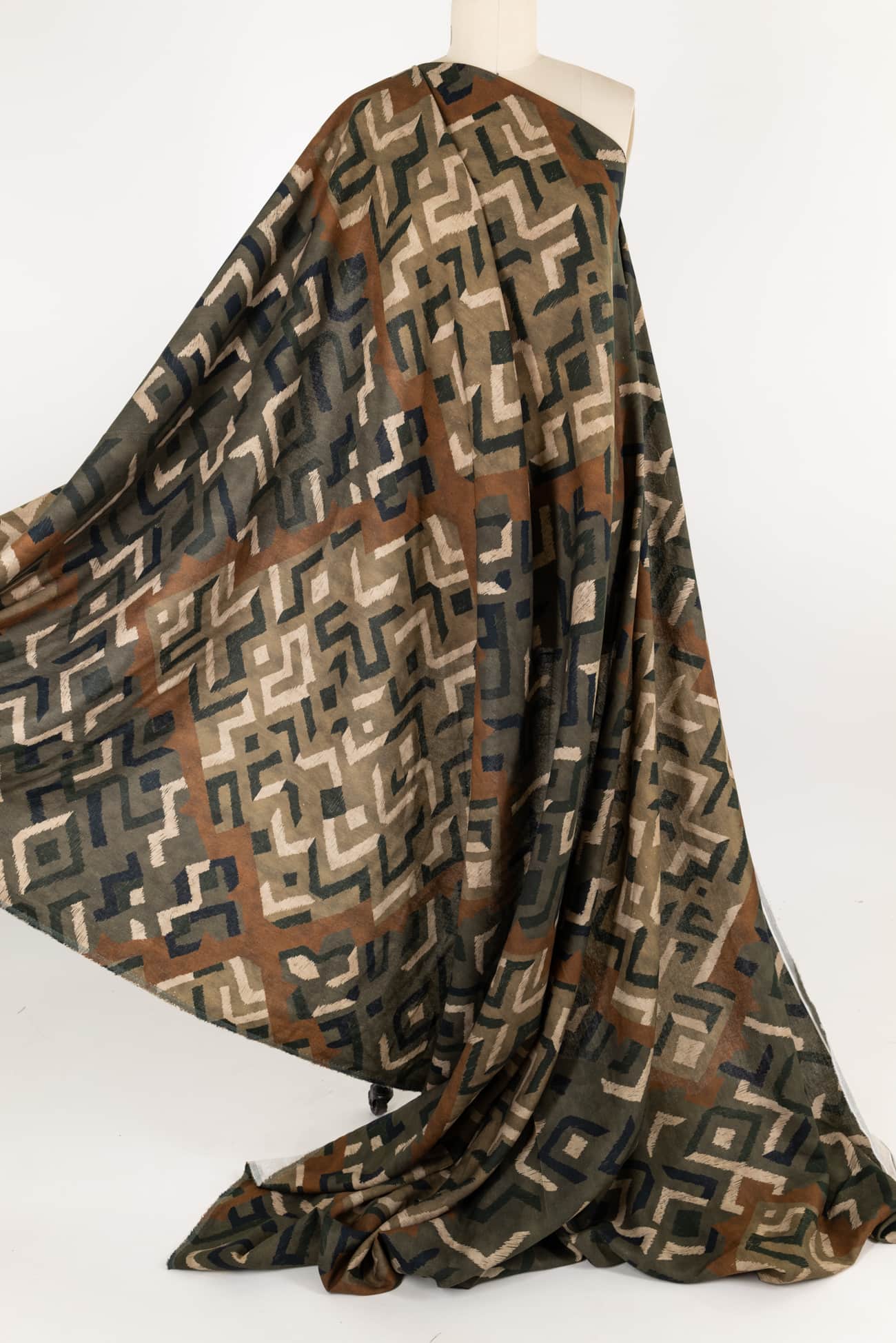 An artful and classic abstraction of mountains in earthy tones of olive, black, walnut and griege. Fine quality deadstock from an Italian mill is mid-weight, with a smooth cool dry hand, soft supple drape and 36½" repeat. Right for a shirt, light jacket, vest or coat, top, tunic, dress, skirt, soft pants, or for accessories or home decor.