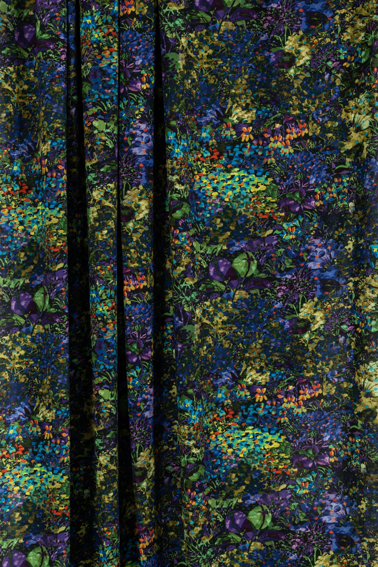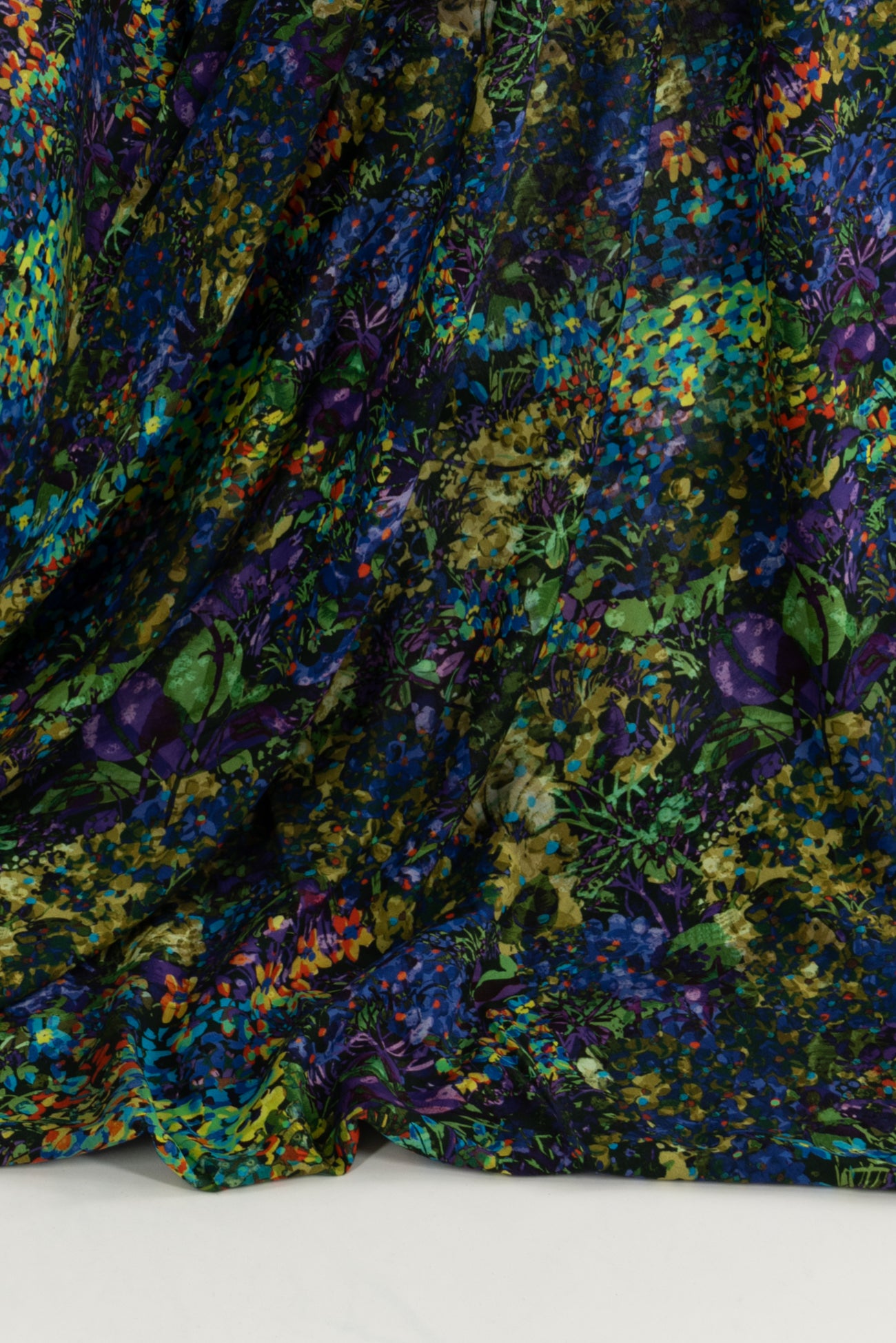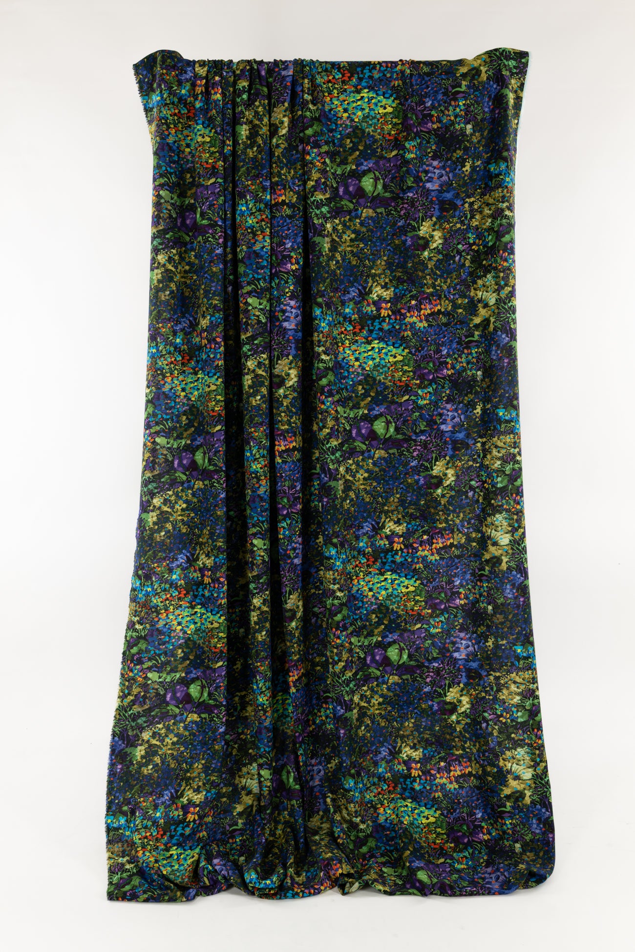 Stunning impressionistic floral in rich green, blue, purple dashed with red and accented with black, deadstock from an Italian mill. The base fabric is a gorgeous lightweight viscose challis, opaque, with a soft hand and supple liquid drape - a stunner! Right for a dress, shirt, tunic, top, soft pant, skirt, jumpsuit, caftan, kimono, floaty vest, or light jacket. One way design, 19" repeat.