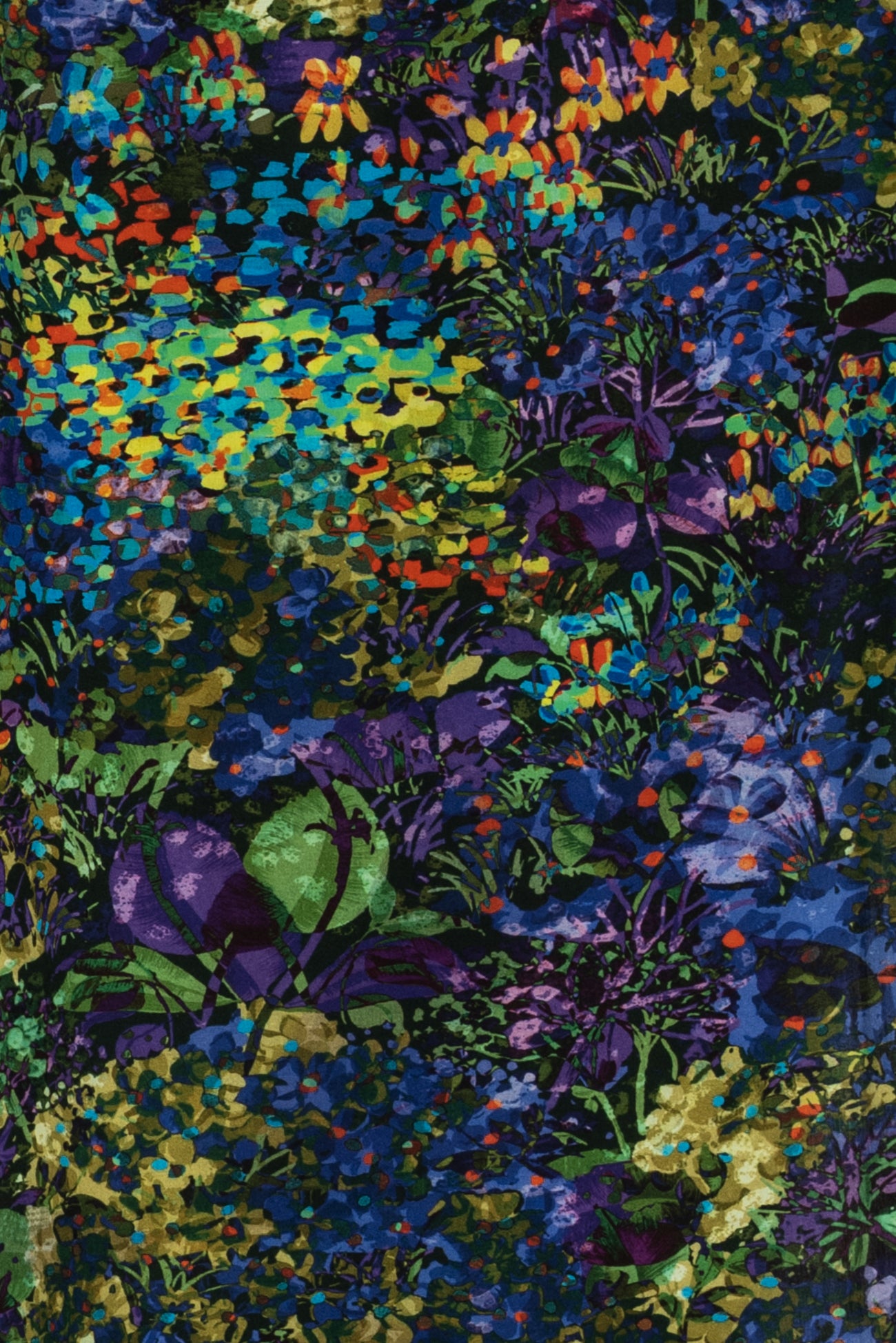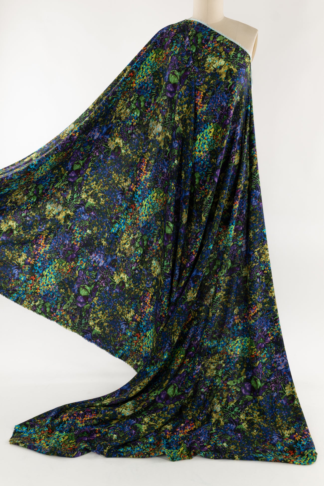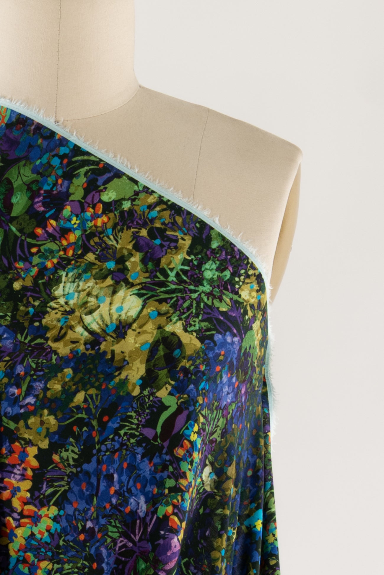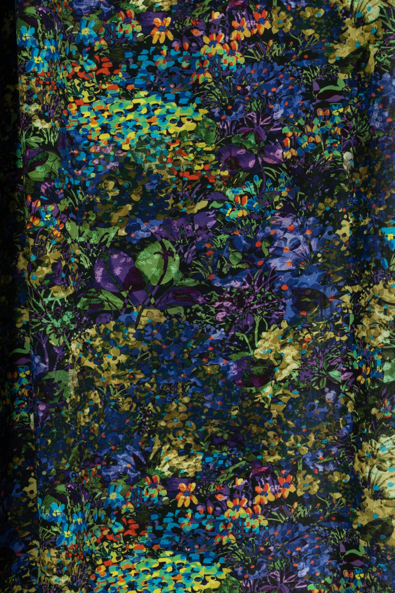 Stunning impressionistic floral in rich green, blue, purple dashed with red and accented with black, deadstock from an Italian mill. The base fabric is a gorgeous lightweight viscose challis, opaque, with a soft hand and supple liquid drape - a stunner! Right for a dress, shirt, tunic, top, soft pant, skirt, jumpsuit, caftan, kimono, floaty vest, or light jacket. One way design, 19" repeat.