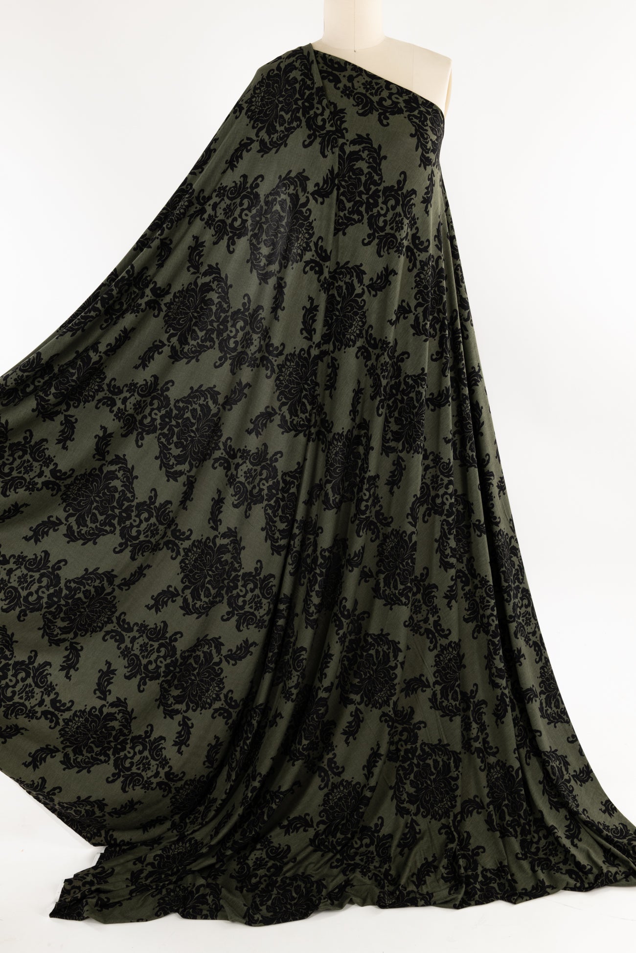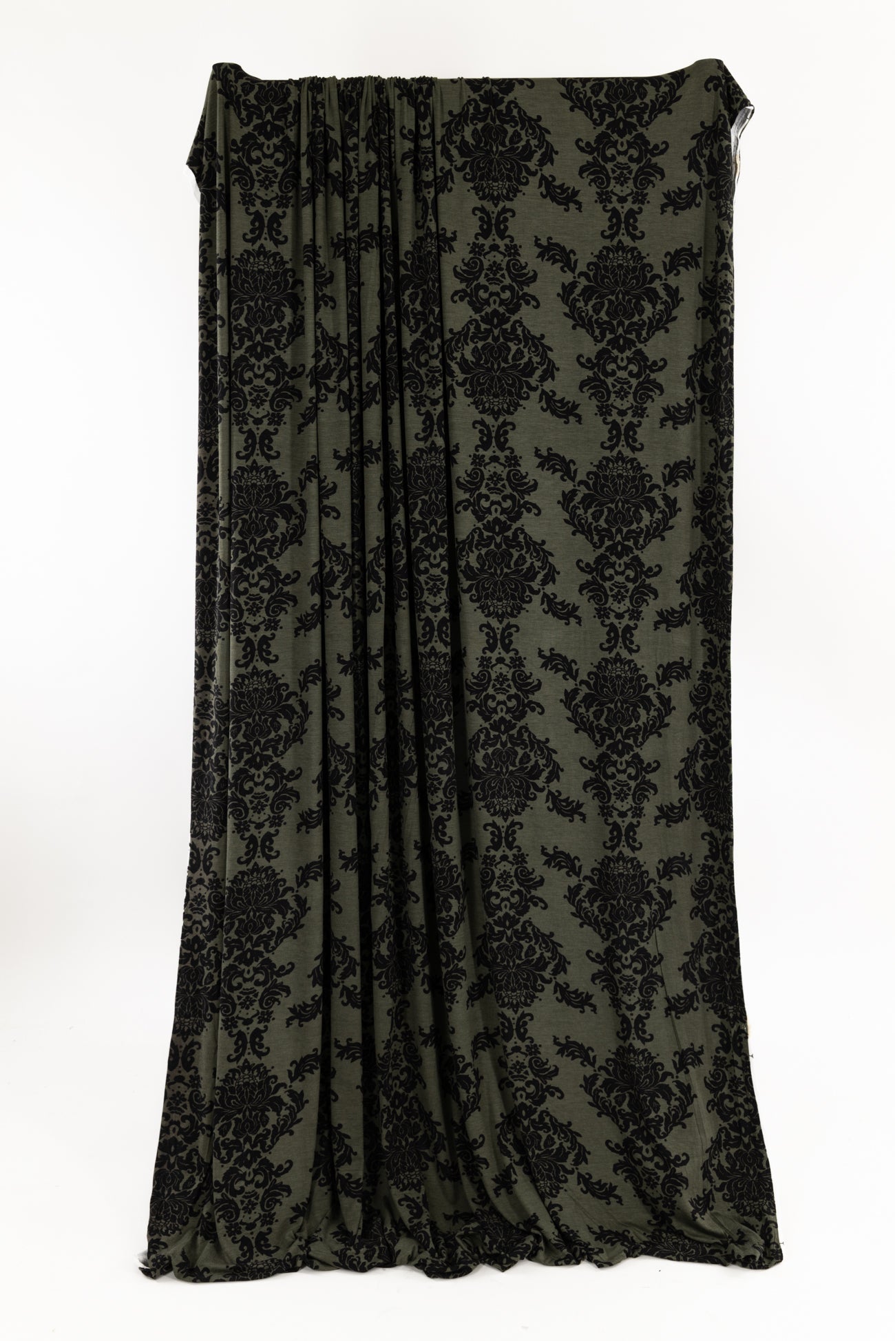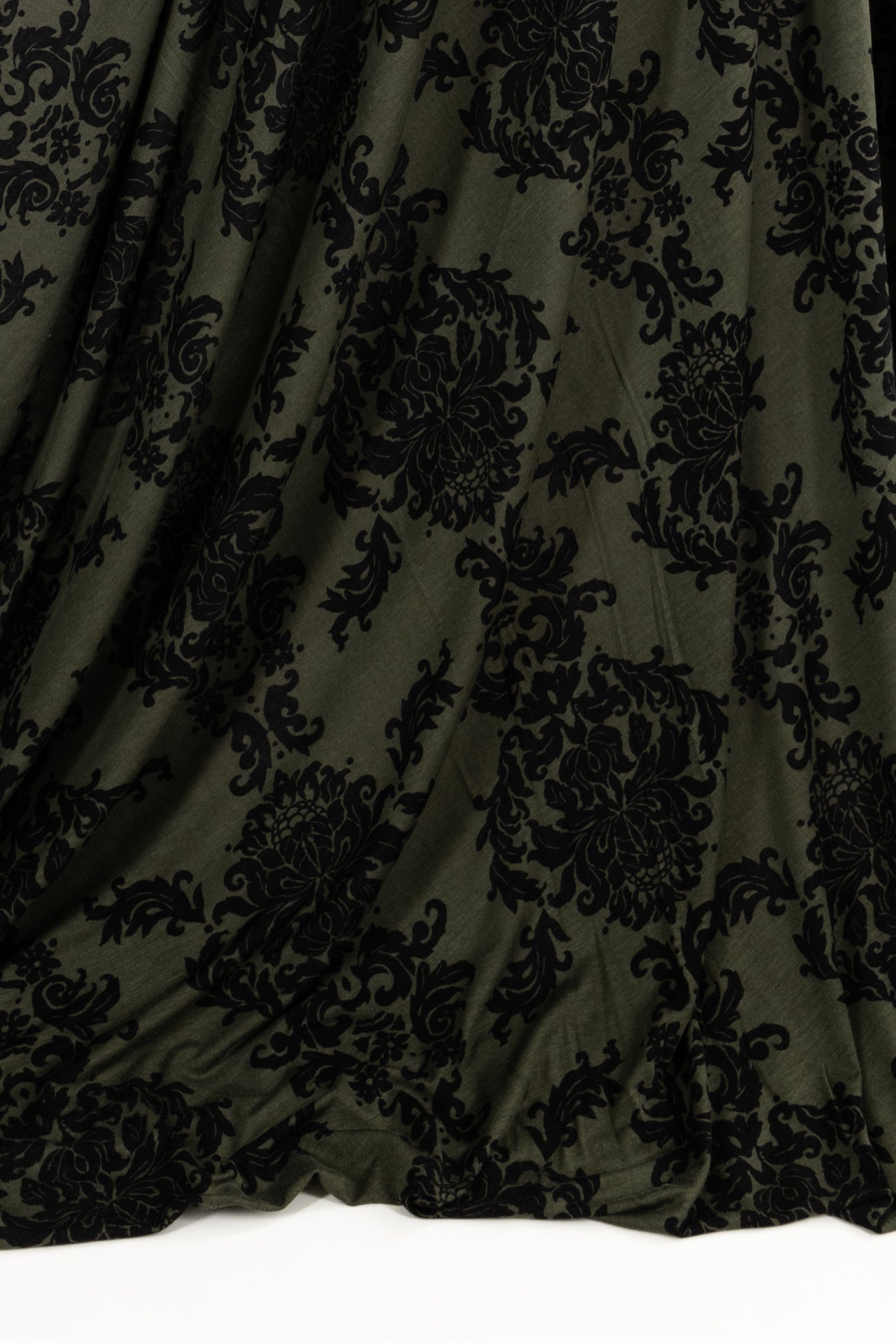Striking black baroque botanical motifs enhance a moss green rayon/lycra knit. Dramatic deadstock produced for an LA designer. Light/mid-weight, with good 4-way stretch and recovery, a soft smooth hand, soft drape, 11¼" repeat, and some rolling at the cut edge. Right for a top, t-shirt, tunic, dress, skirt, soft pant, kimono, caftan, loungewear, men's, or children's.