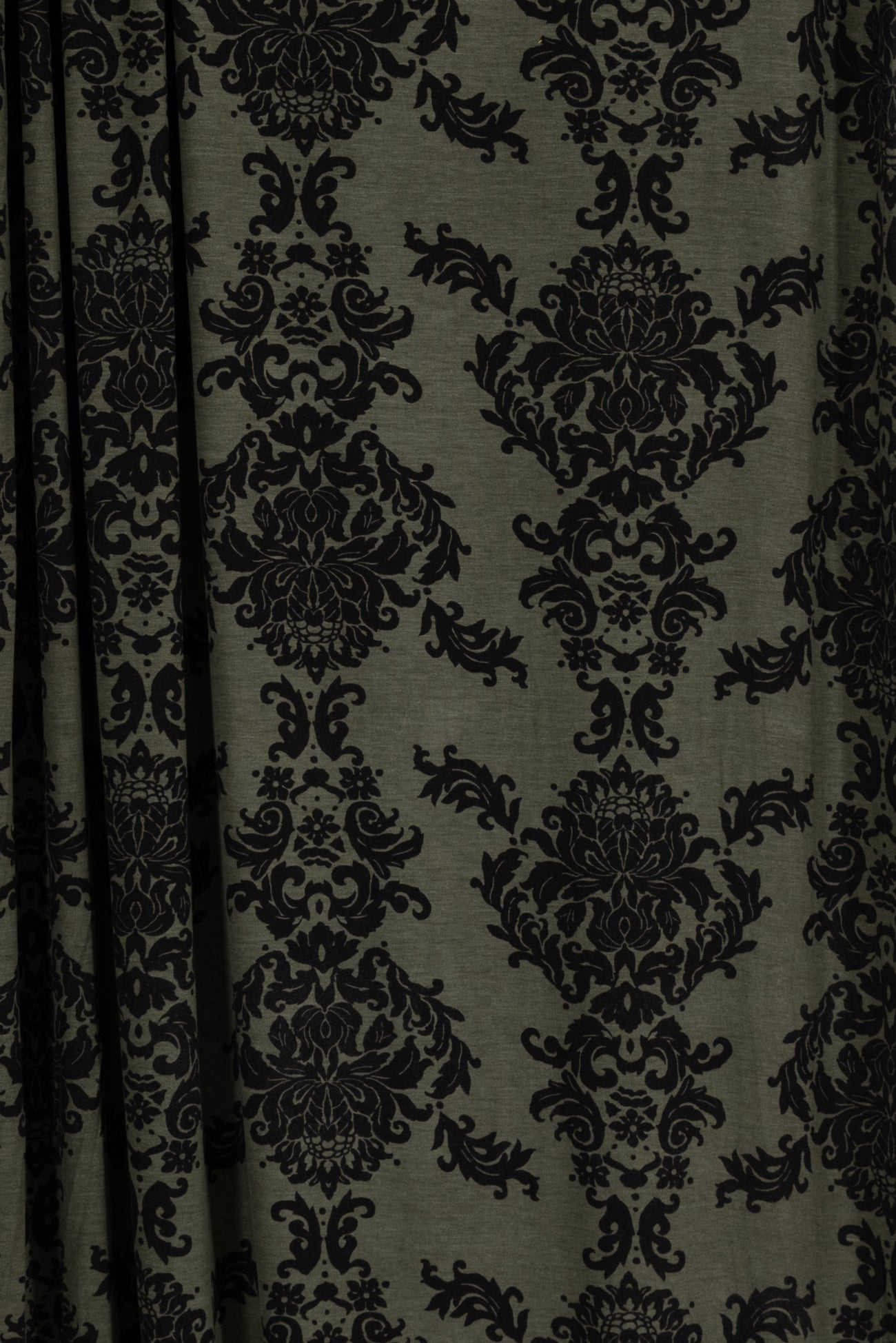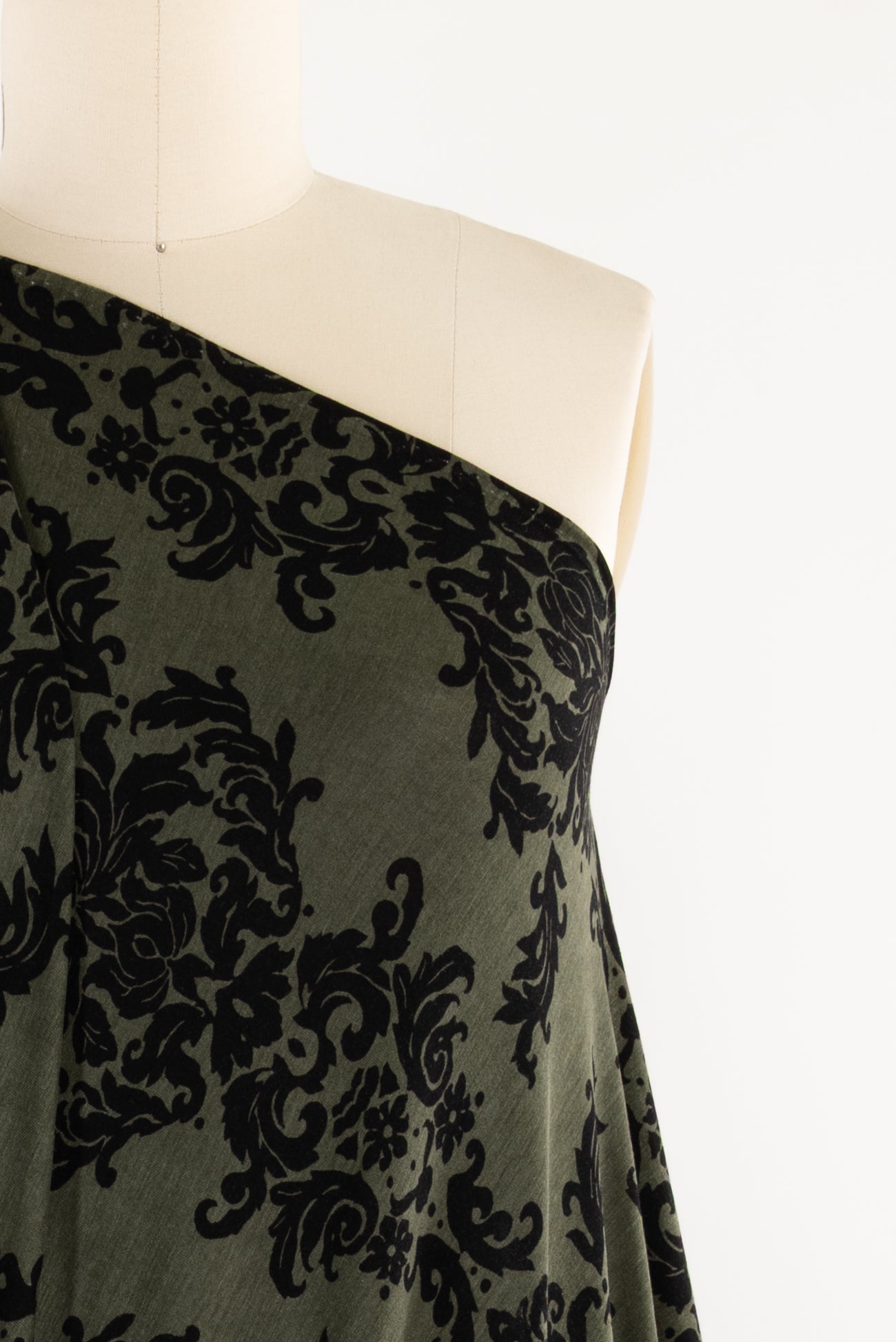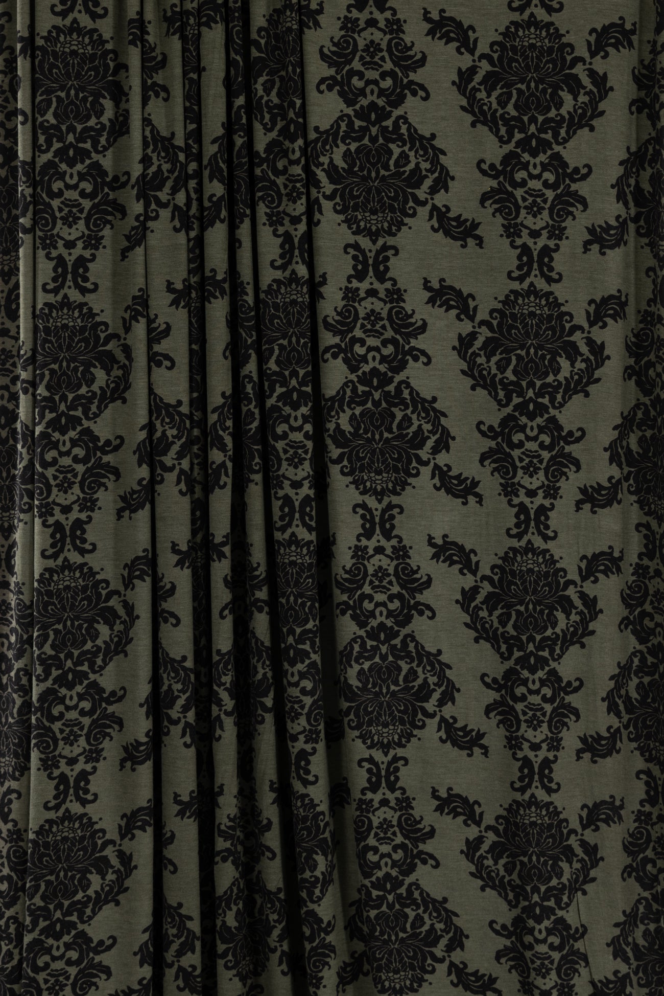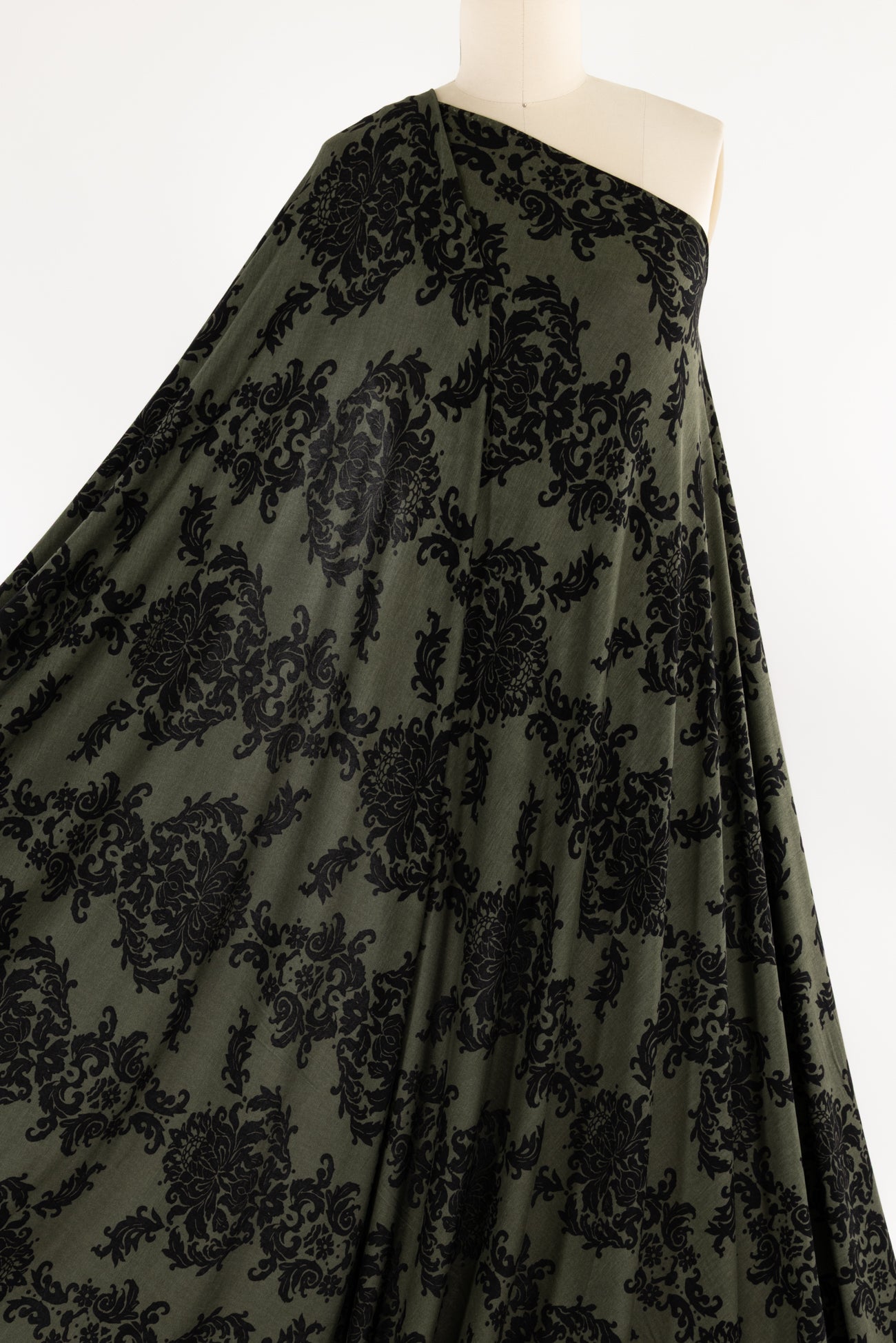 Striking black baroque botanical motifs enhance a moss green rayon/lycra knit. Dramatic deadstock produced for an LA designer. Light/mid-weight, with good 4-way stretch and recovery, a soft smooth hand, soft drape, 11¼" repeat, and some rolling at the cut edge. Right for a top, t-shirt, tunic, dress, skirt, soft pant, kimono, caftan, loungewear, men's, or children's.