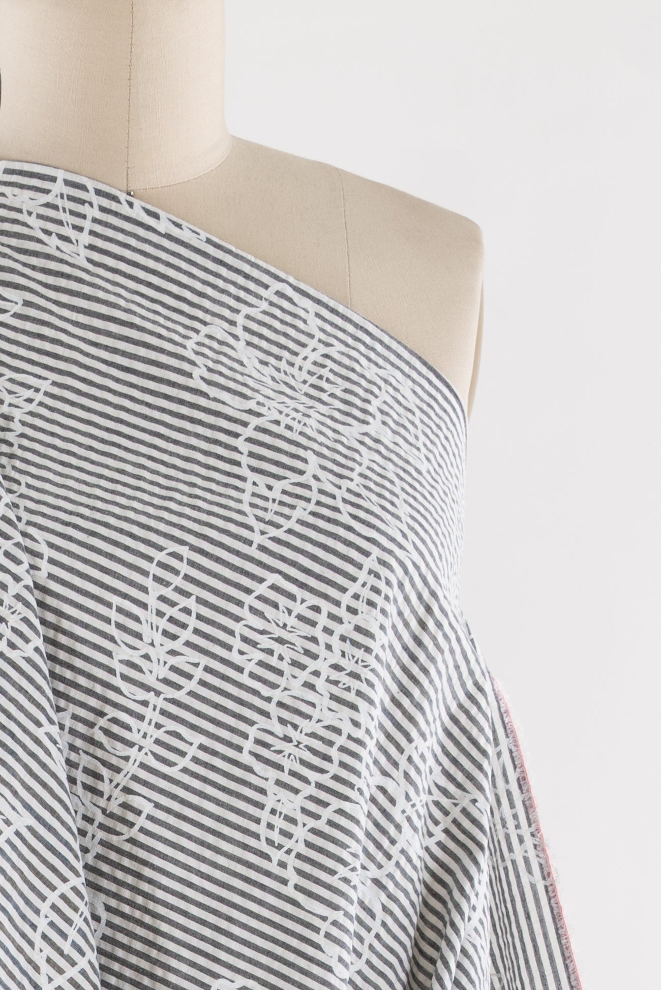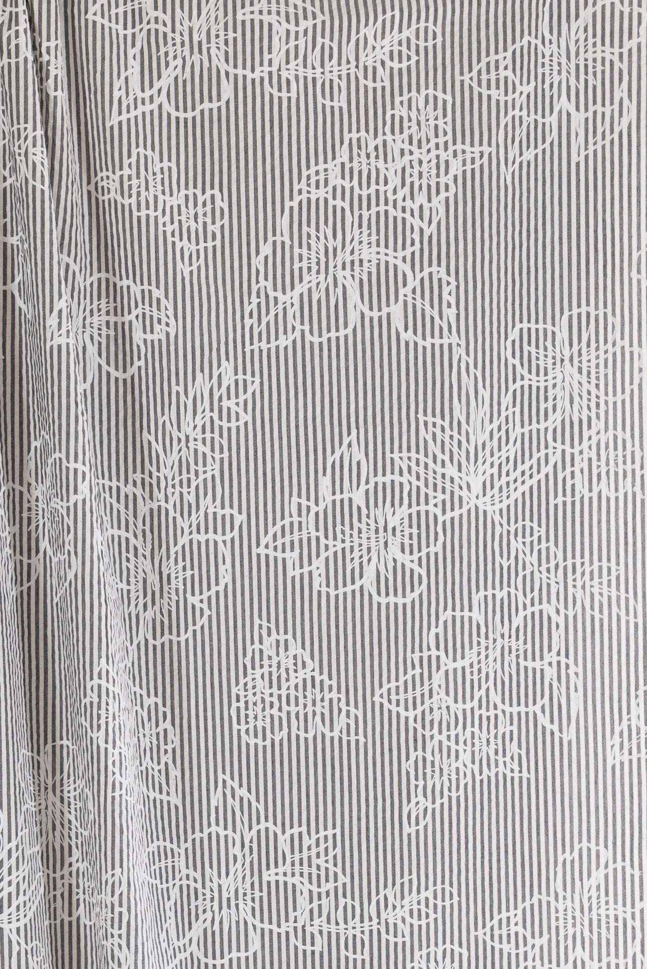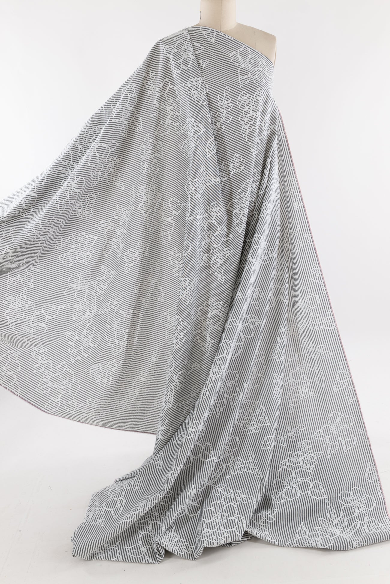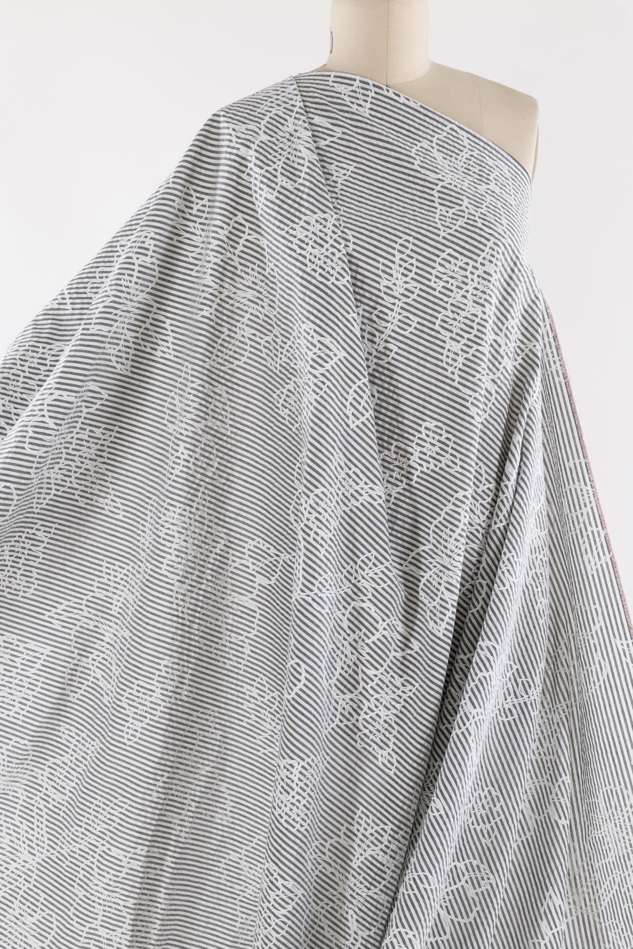 Whimsical white nosegays are printed on a fine quality gray and white stripe seersucker. Southern California designer deadstock is lightweight, opaque with a lightly textured soft hand, 25" repeat, and airy drape. Right for a dress, shirt, skirt, tunic, top, soft pants, or children's.