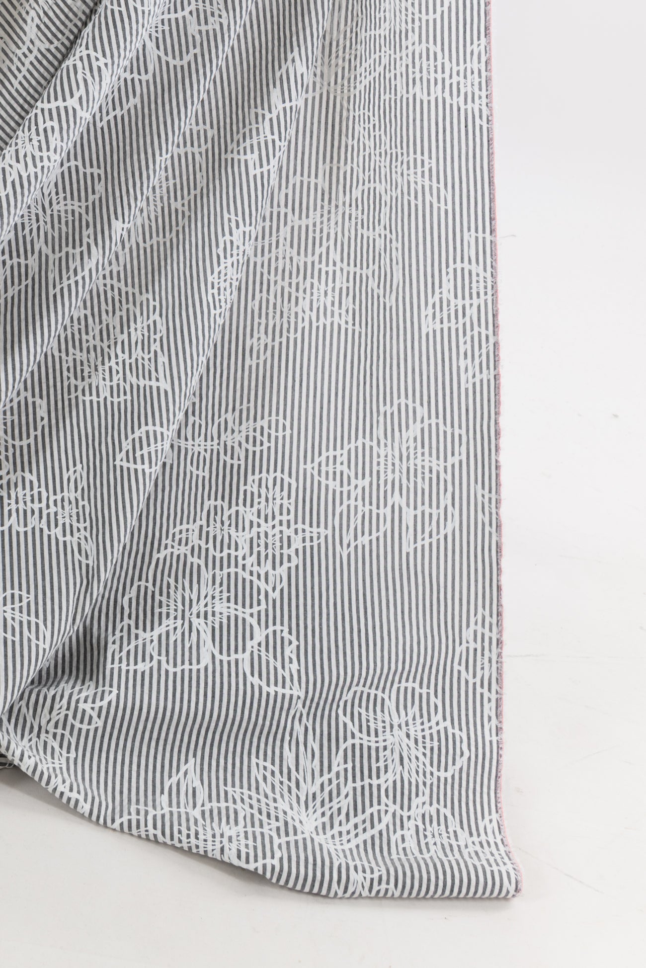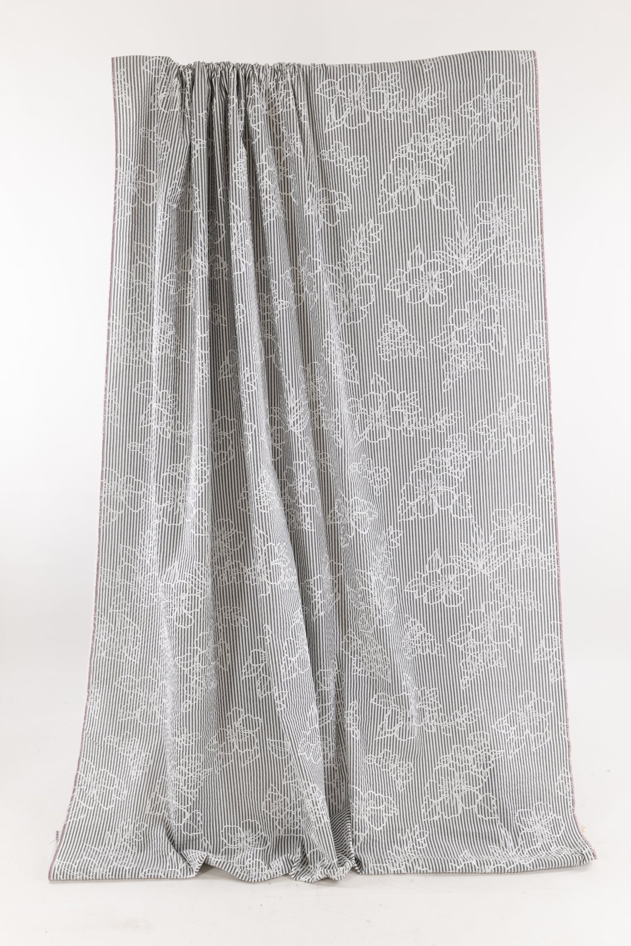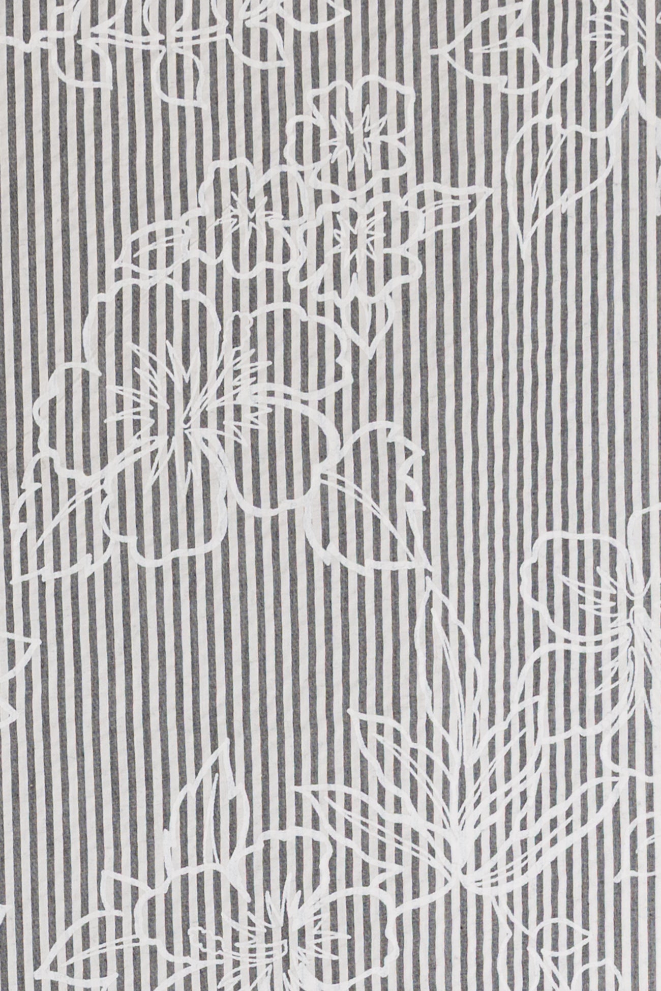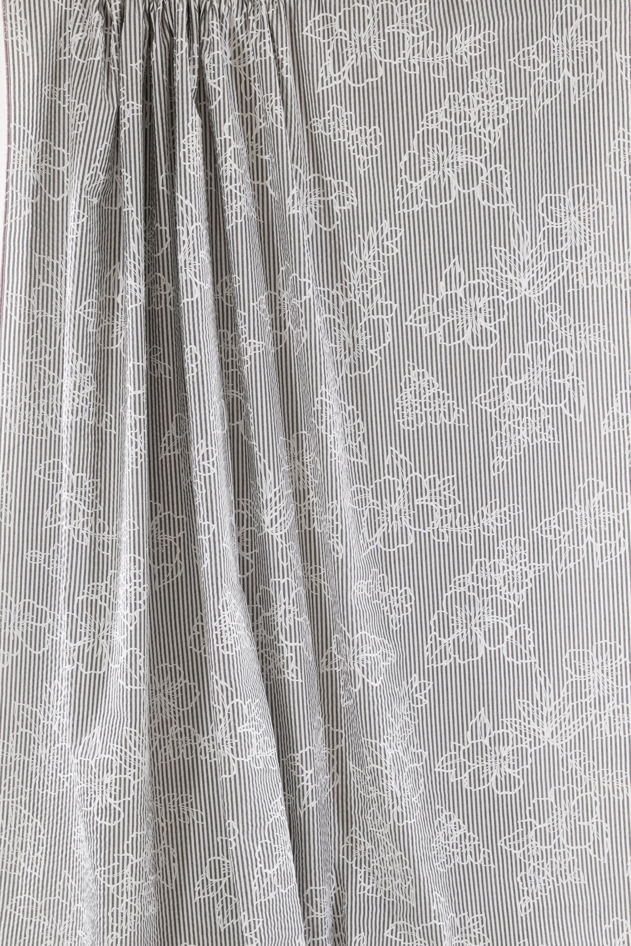 Whimsical white nosegays are printed on a fine quality gray and white stripe seersucker. Southern California designer deadstock is lightweight, opaque with a lightly textured soft hand, 25" repeat, and airy drape. Right for a dress, shirt, skirt, tunic, top, soft pants, or children's.