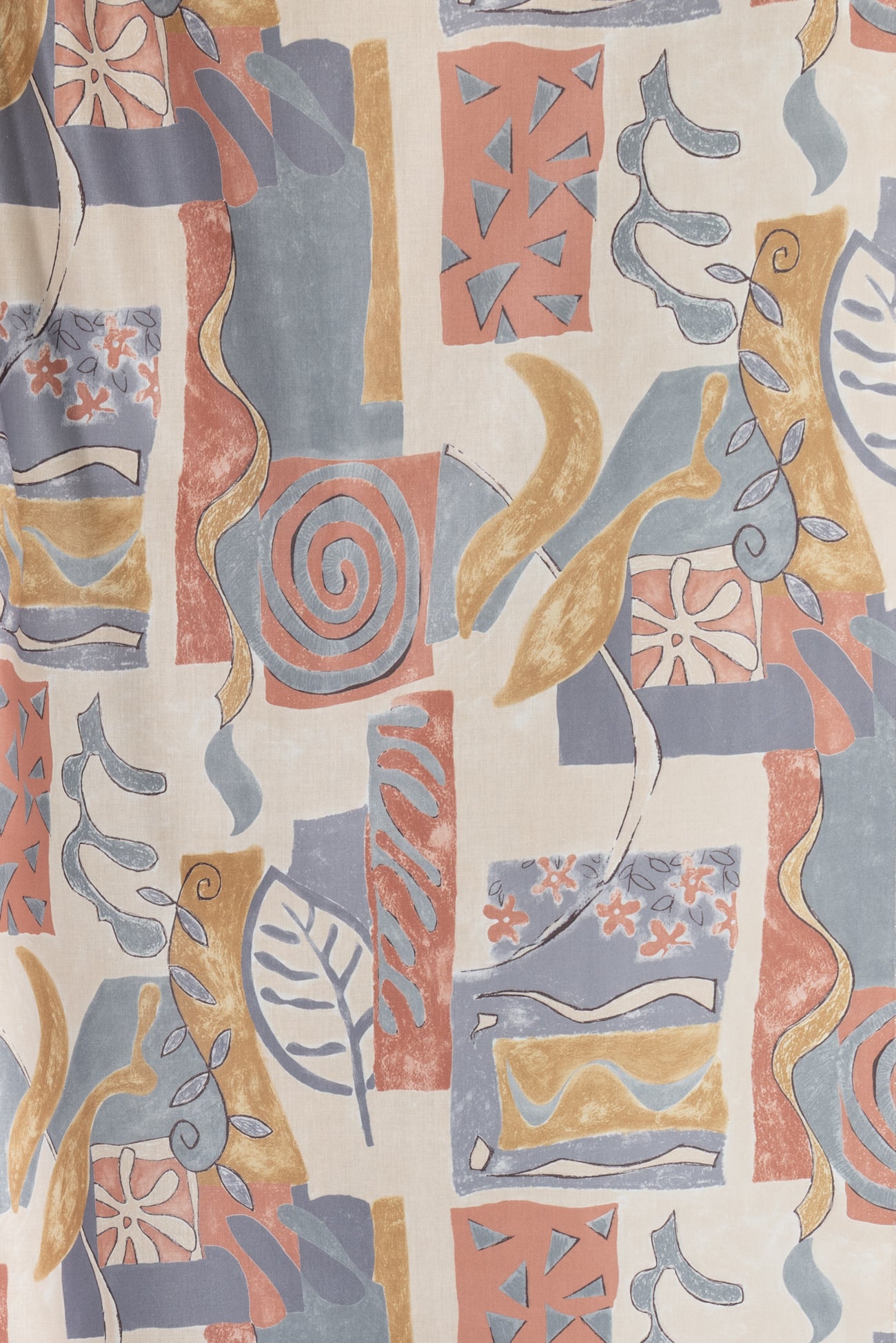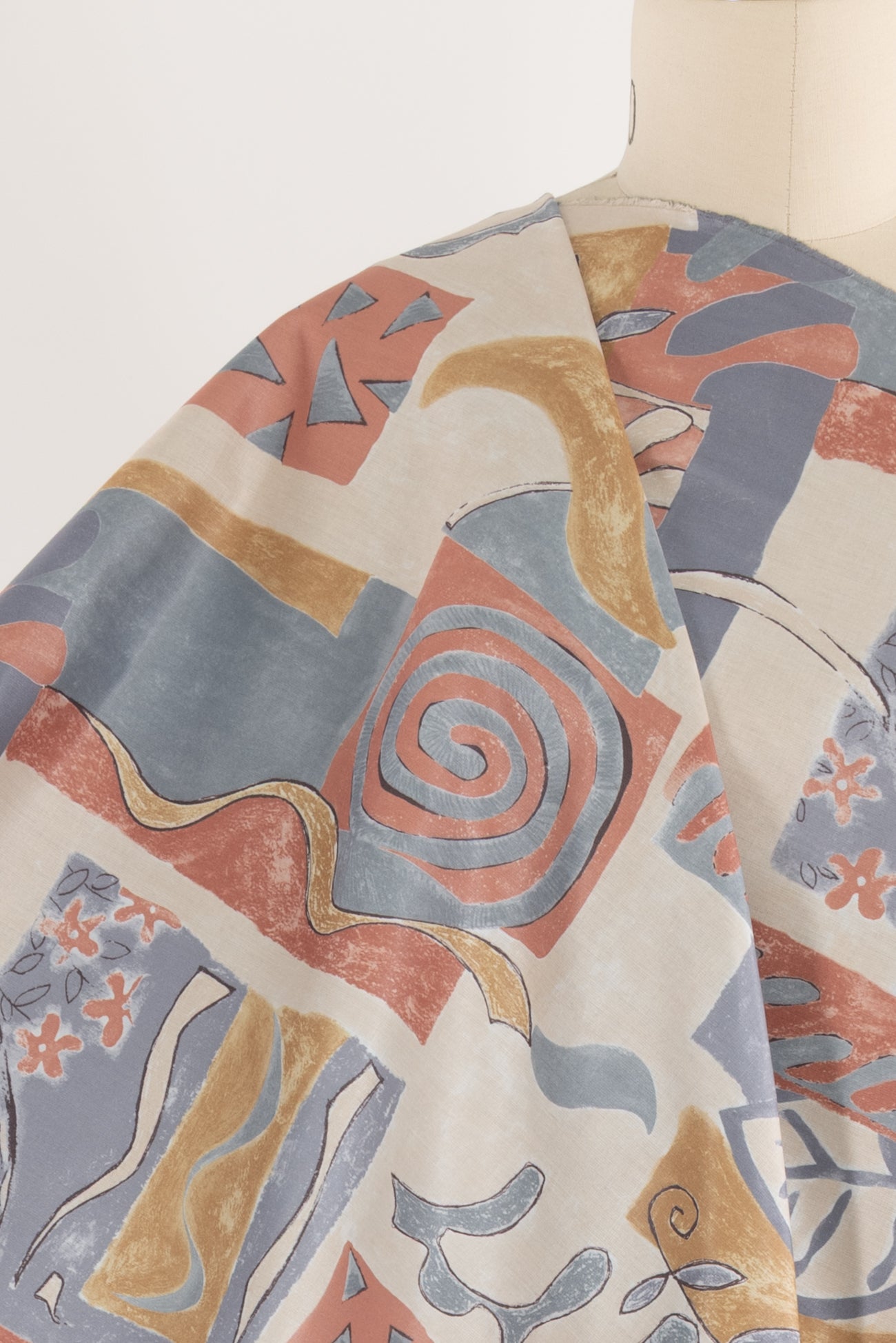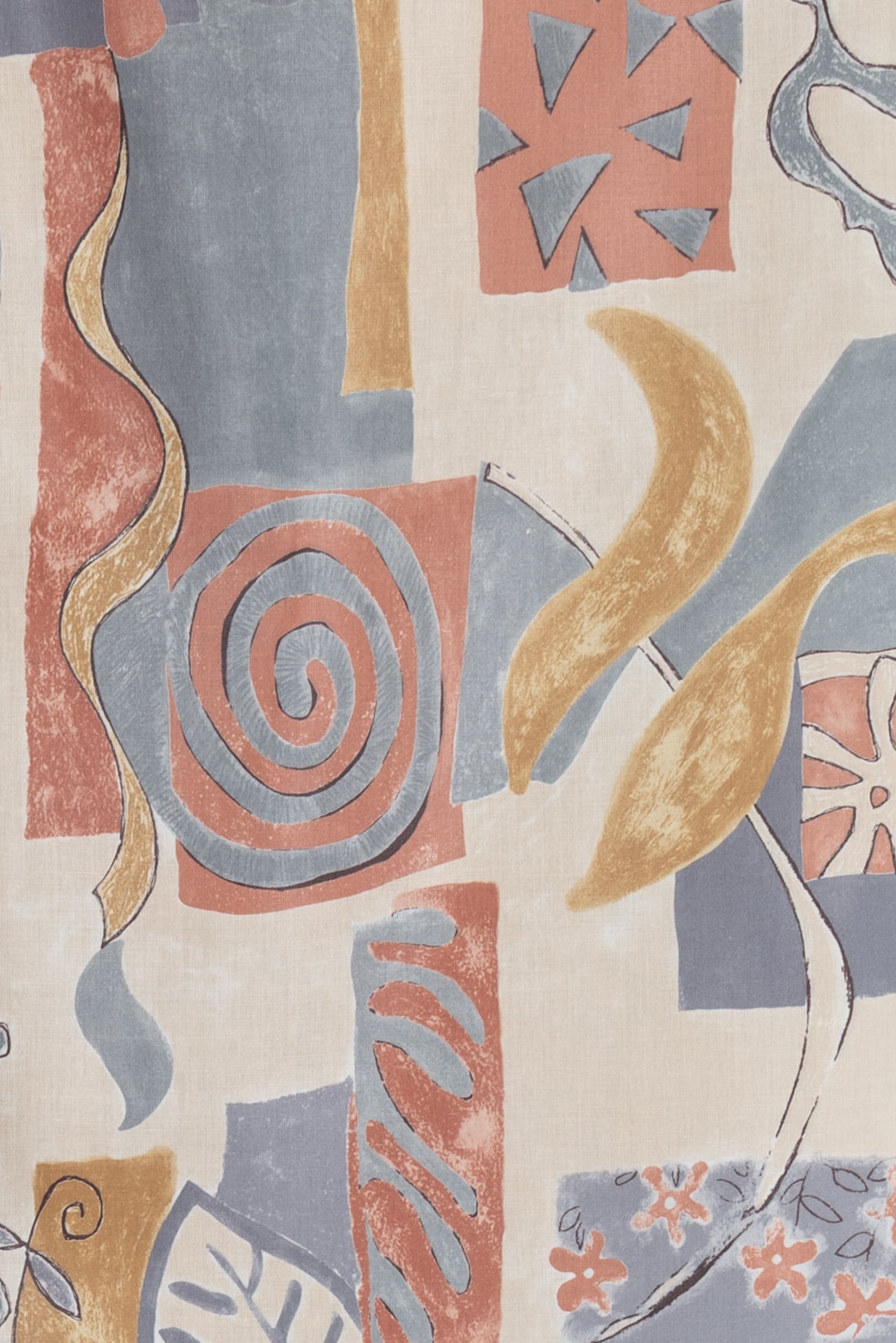 Charming abstract geometrics and botanicals in terra cotta, gray and dijon with pewter accents, fine quality deadstock from a NYC designer. Mid-weight, with a crisp satiny hand, a 25" repeat and crisp drape. Right for a shirt, dress, tunic, top, pant, skirt, home dec or accessories. Limited quantity available.