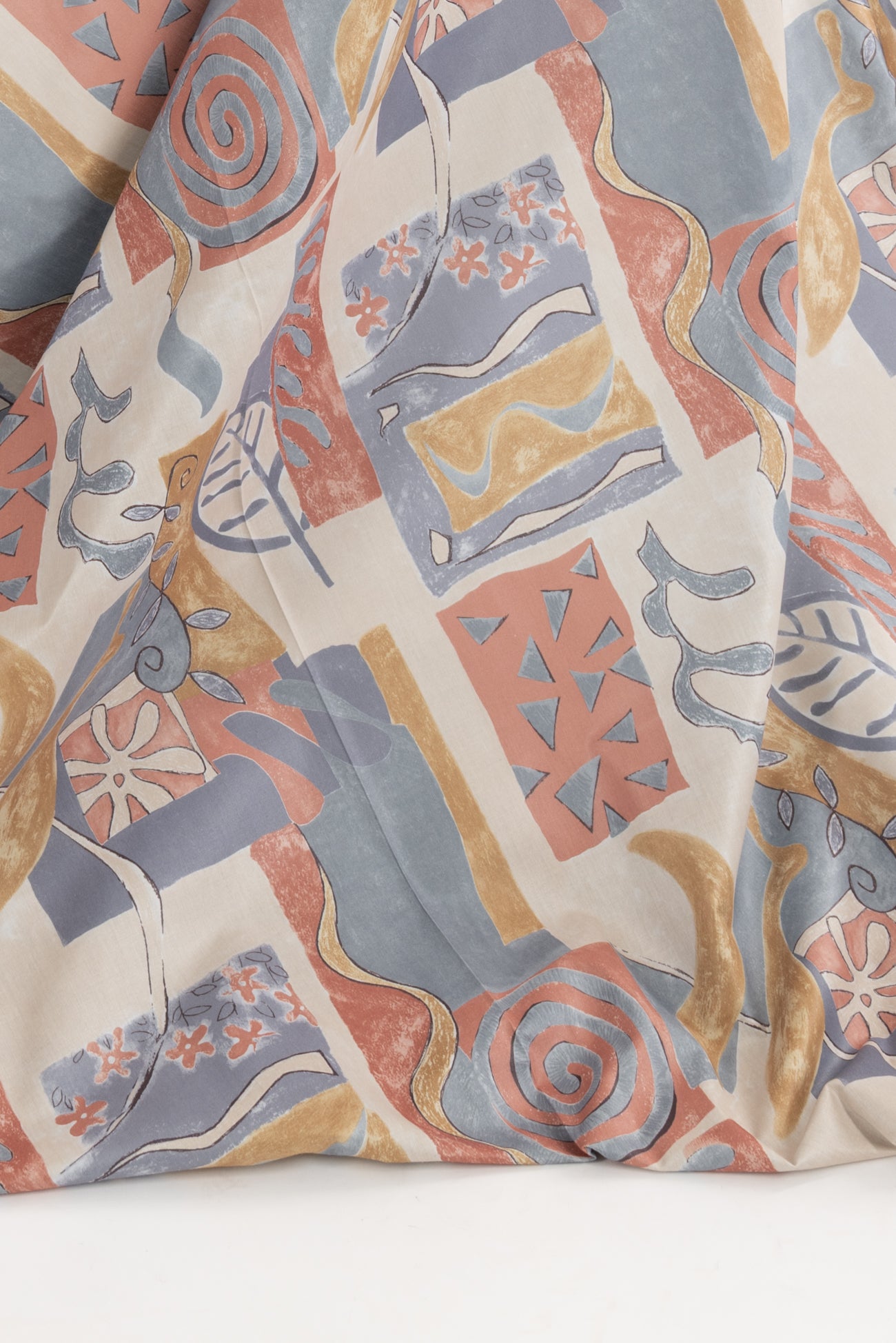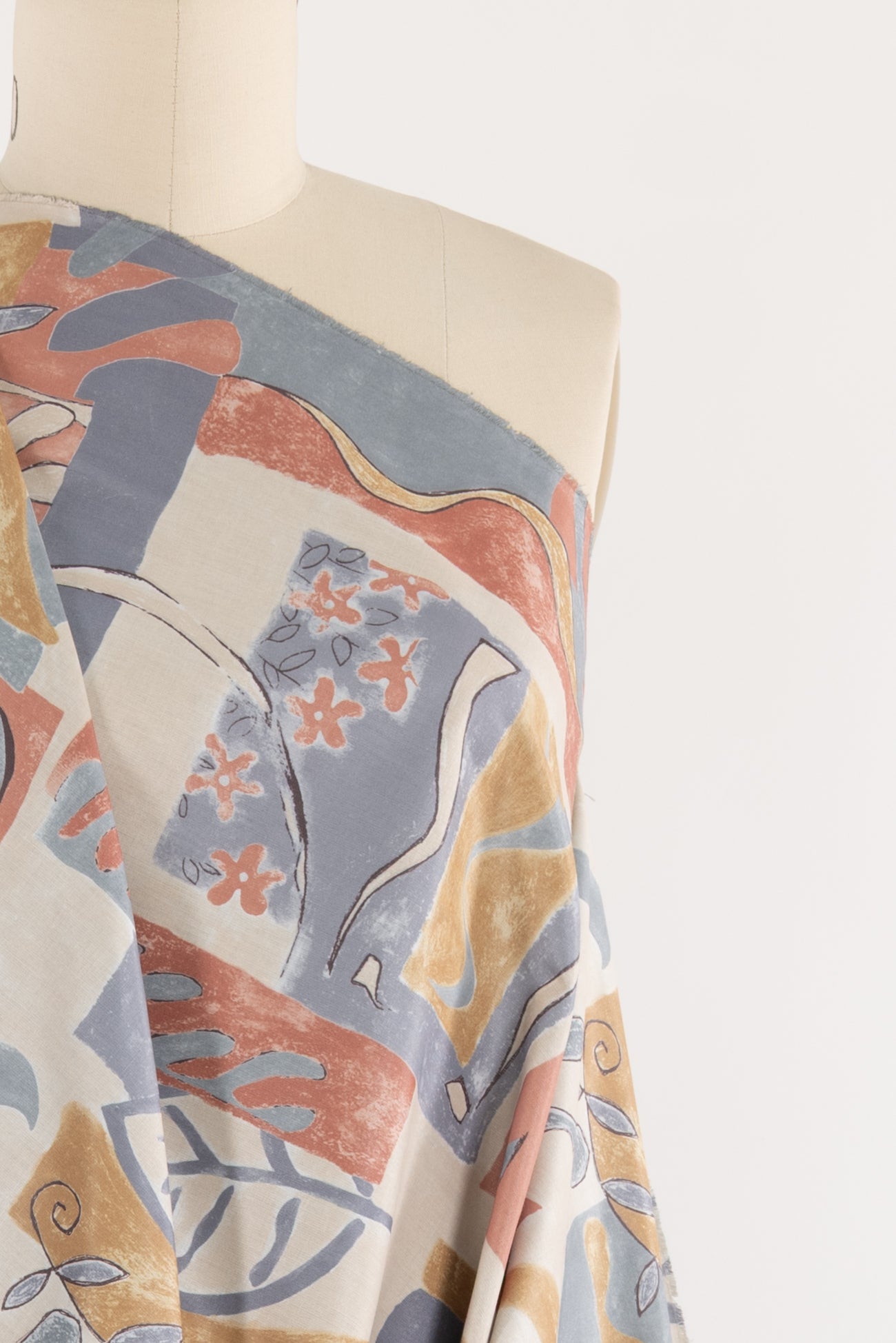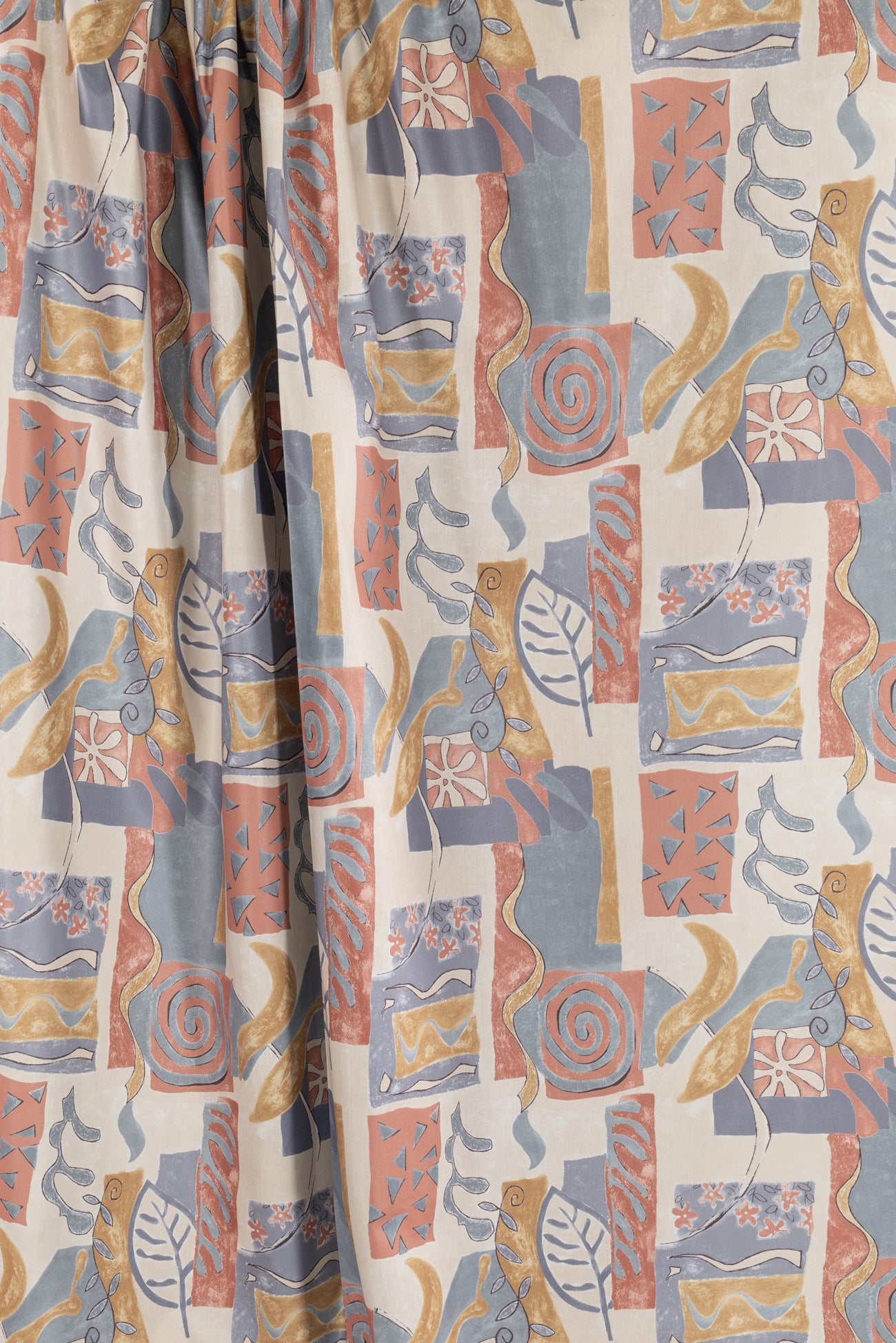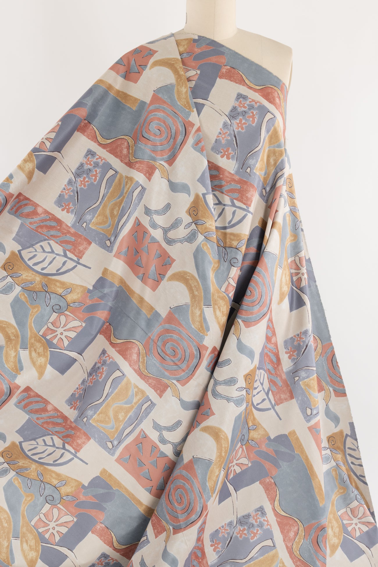 Charming abstract geometrics and botanicals in terra cotta, gray and dijon with pewter accents, fine quality deadstock from a NYC designer. Mid-weight, with a crisp satiny hand, a 25" repeat and crisp drape. Right for a shirt, dress, tunic, top, pant, skirt, home dec or accessories. Limited quantity available.